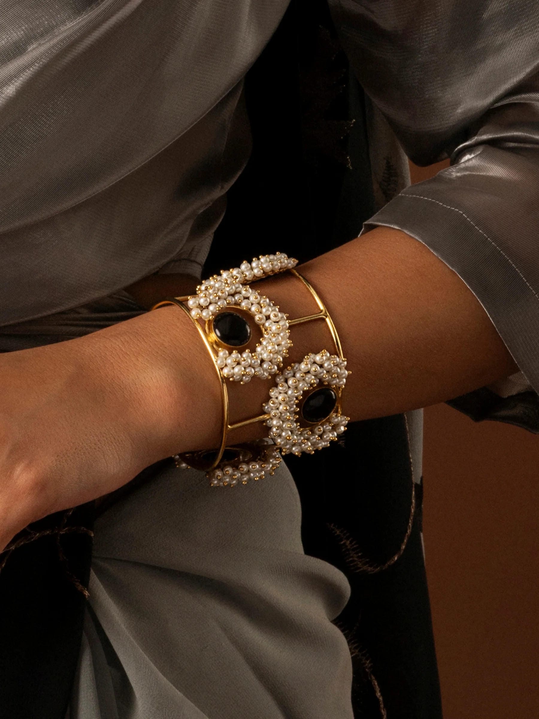 Delicate yet distinctive, this handcrafted wire-frame kada weaves minimalism with meaning. The sleek golden structure is accented with deep black stones—symbols of strength and mystery—softly contrasted by tiny pearls that whisper elegance. A perfect balance of light and dark, structure and soul, it embodies the modern spirit —where heritage finds harmony in contemporary form.