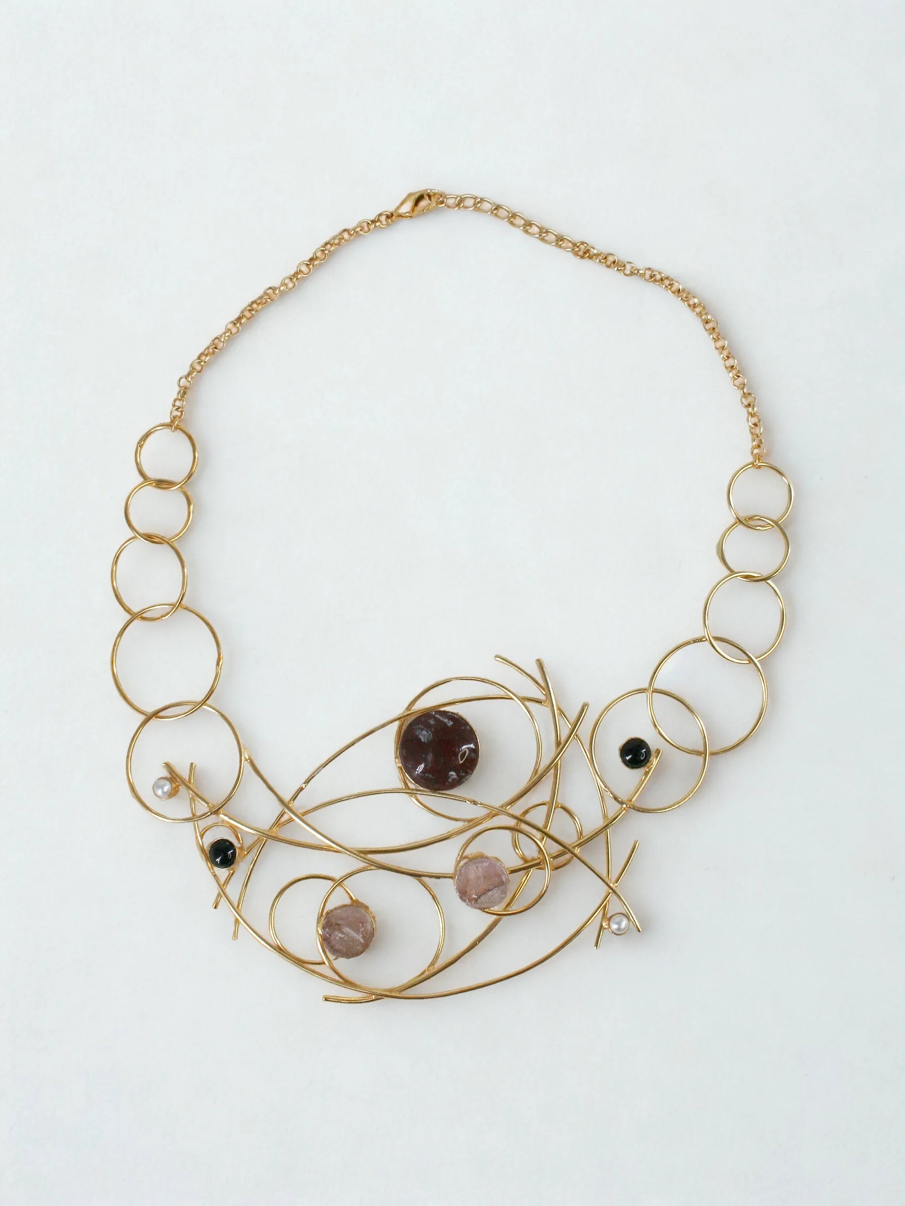 Handcrafted in recycled brass and finished with luminous 18K gold plating, the Amara Arc Necklace weaves asymmetric arcs and circles into a sculptural, abstract silhouette. Randomly scattered stones illuminate the center, creating a poetic interplay of geometry and raw, organic light. Modern, expressive, and artfully unrestrained — a contemporary heirloom shaped by movement, intuition, and craft.
