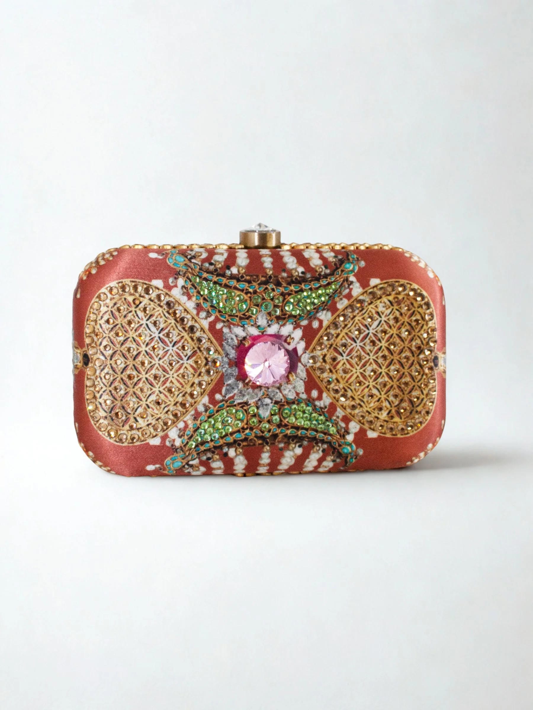 The Amber Royale Bag is a celebration of understated glamour. Crafted in soft, padded satin with rich brown jewel prints, it exudes warmth and vintage opulence. Hand-decorated with Swarovski crystals and fine jewel embellishments, it shimmers subtly — never loud, always luminous. Designed for the modern soirée, Amber Royale strikes the perfect balance between softness and sparkle, making it your statement piece for evenings that call for effortless sophistication.