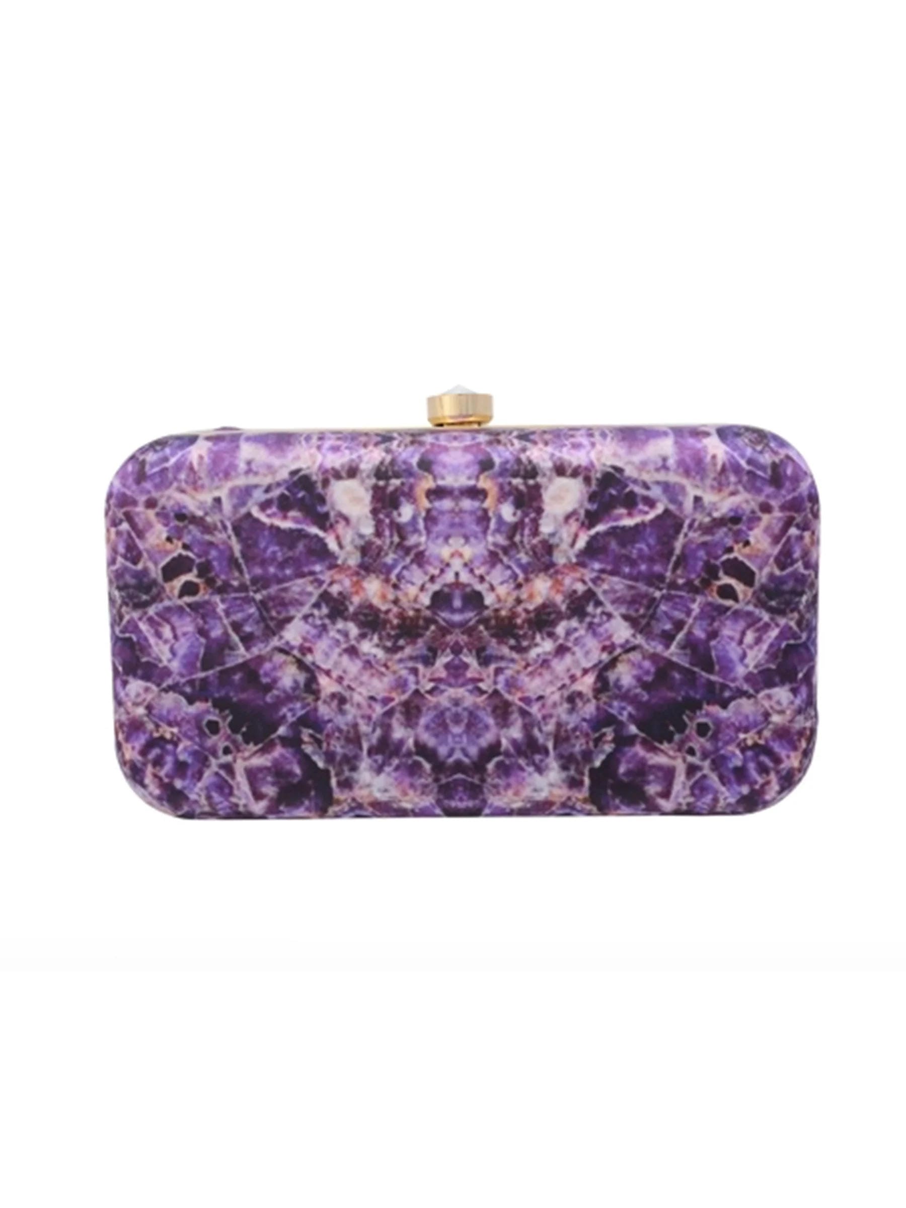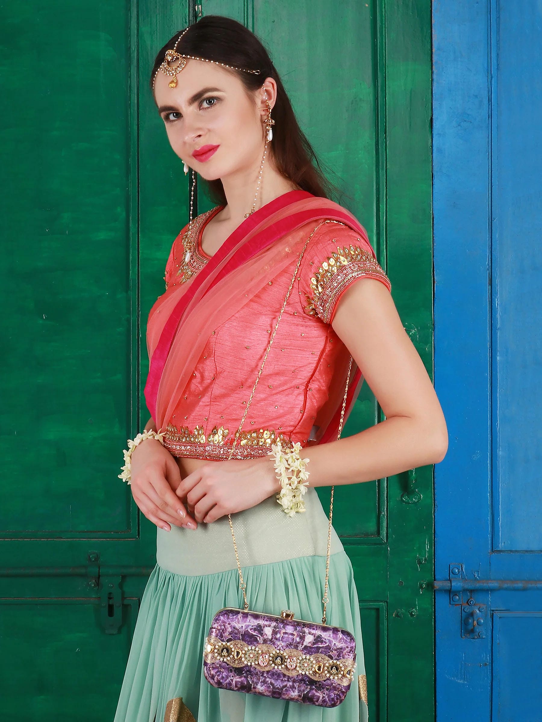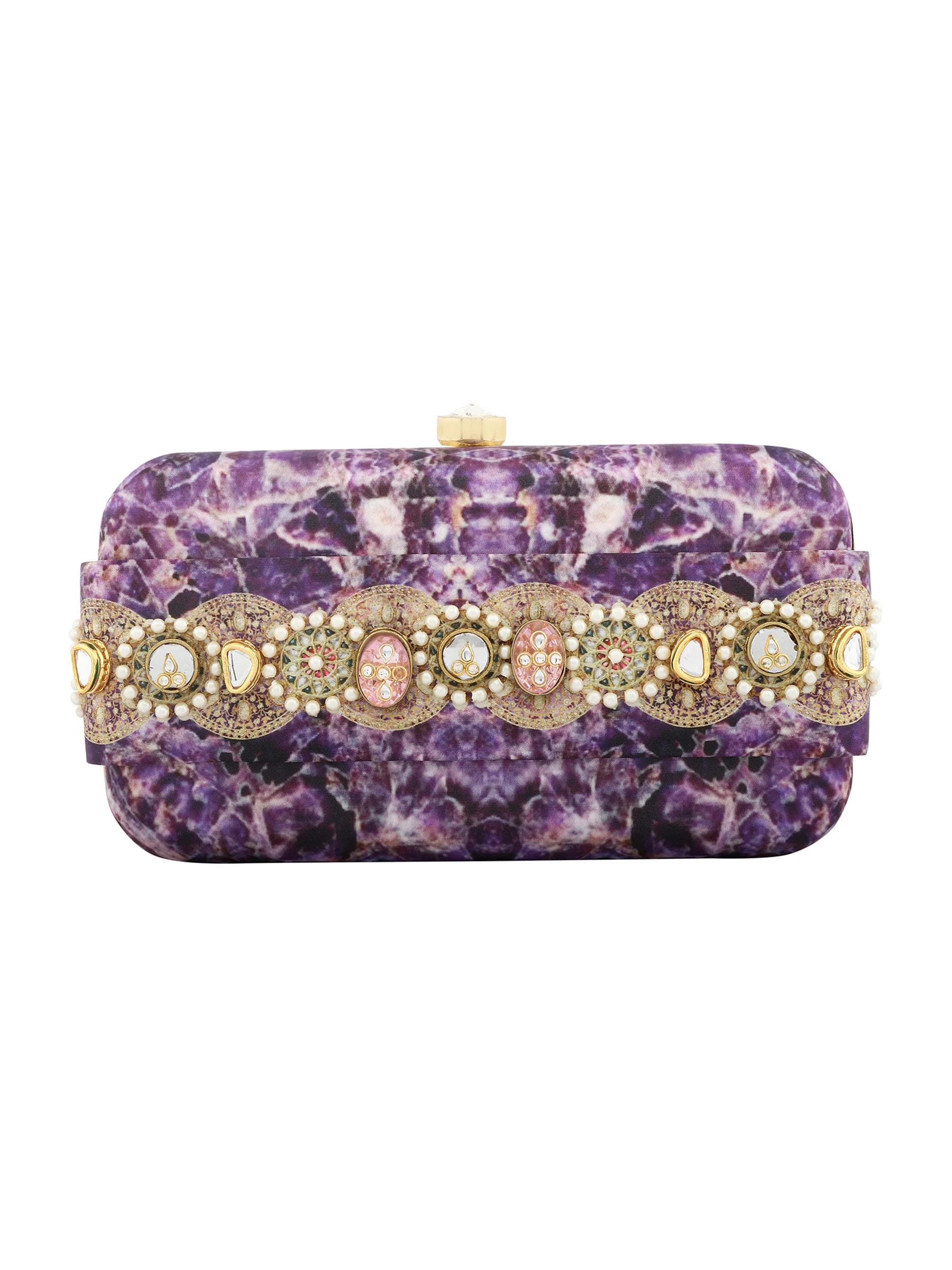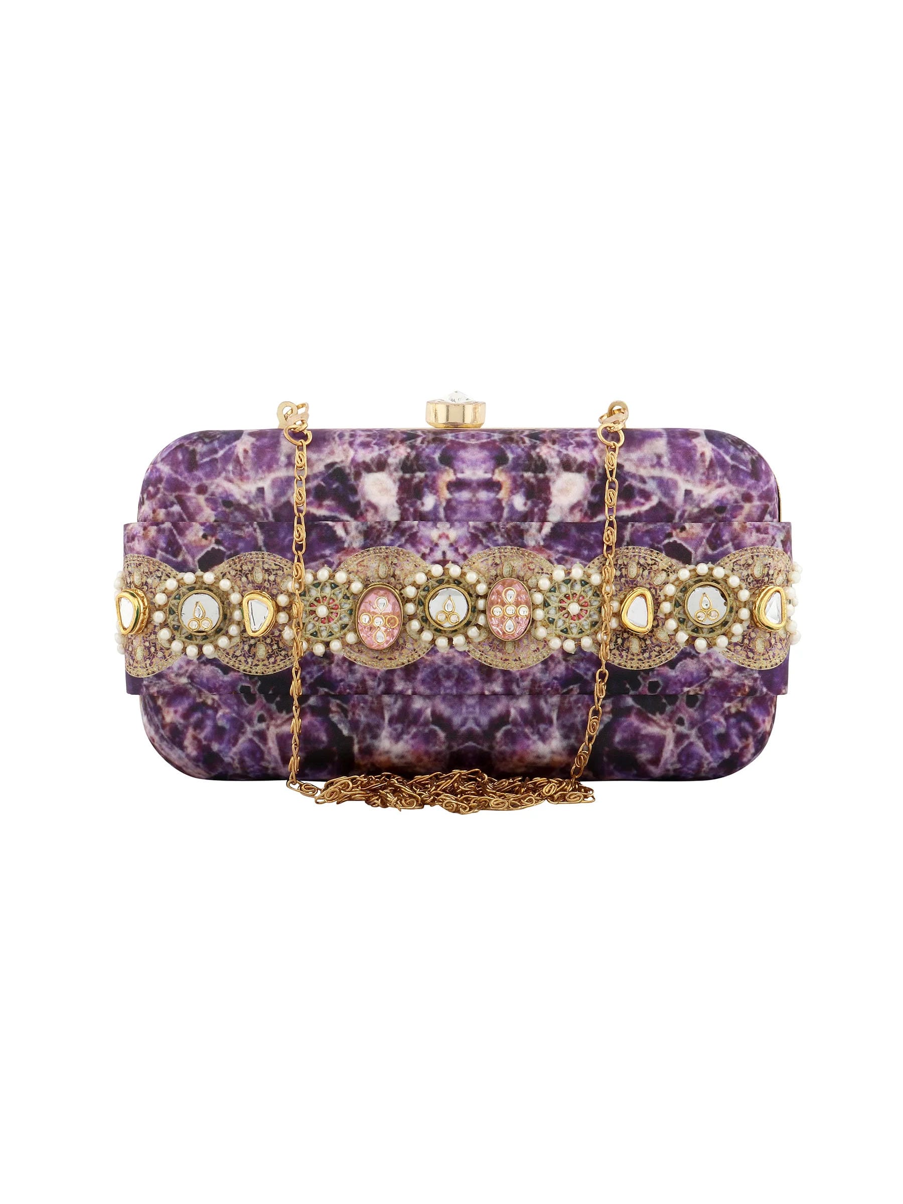 Perfect addition to your festive look, the clutch is inspired by the opulent life of Indian royalty and their magnificent jewels. Appliqué of pearls, vintage embellishments and semi-precious stones add to the style factor of this clutch. With an appliqué hand pocket in front, the clutch can be carried in three different ways giving it a new look every time you carry it. The Amethyst Jewel Clasp Clutch shines as a symbol of grandeur and grace. Embellished with semi-precious stones, pearls, and heritage motifs, it is designed for discerning women with a taste for elegance. From festive soirées to couture events, it embodies the legacy and craftsmanship of Puneet Gupta.