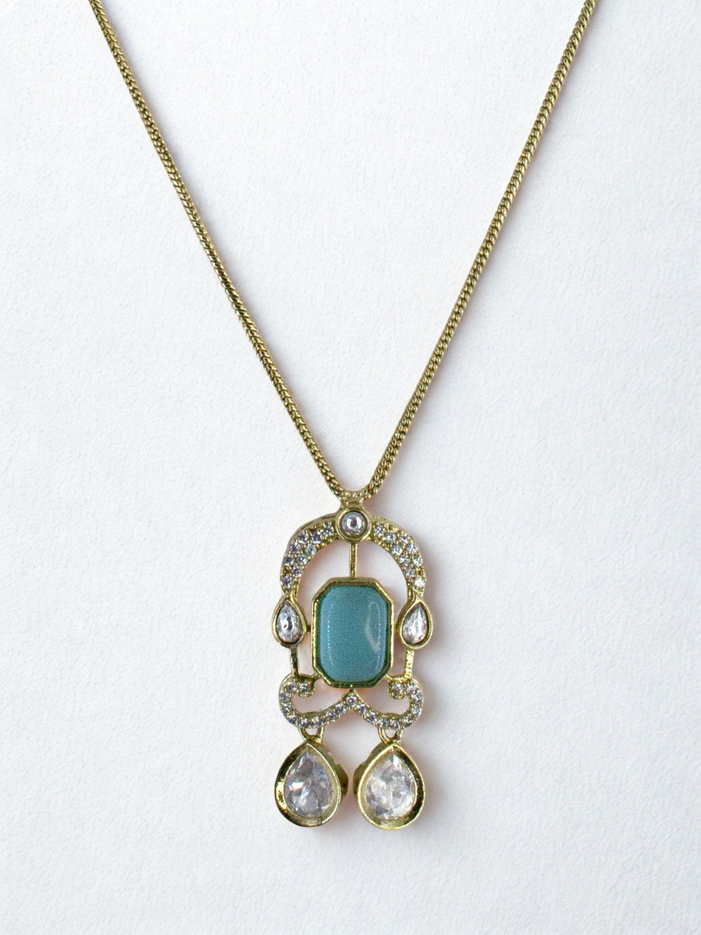 Soft and sculptural, this pendant pairs a light sky-blue stone with a refined Art Deco zirconia motif, creating a delicate balance of color and geometry. Handcrafted in recycled metal and finished with 18K gold plating, its petite silhouette carries a quiet luminosity — modern, airy, and effortlessly elegant. A subtle statement for everyday refinement.