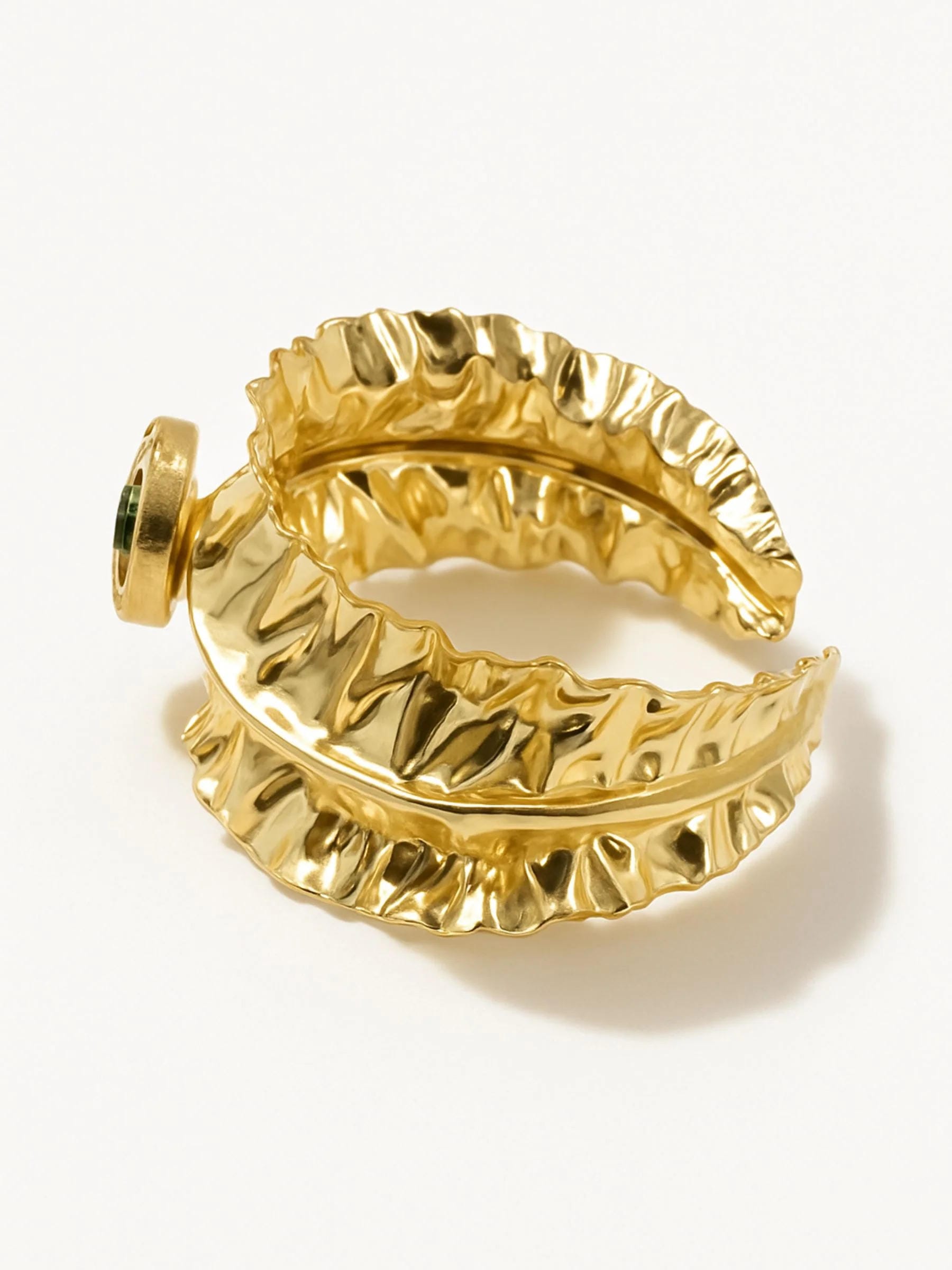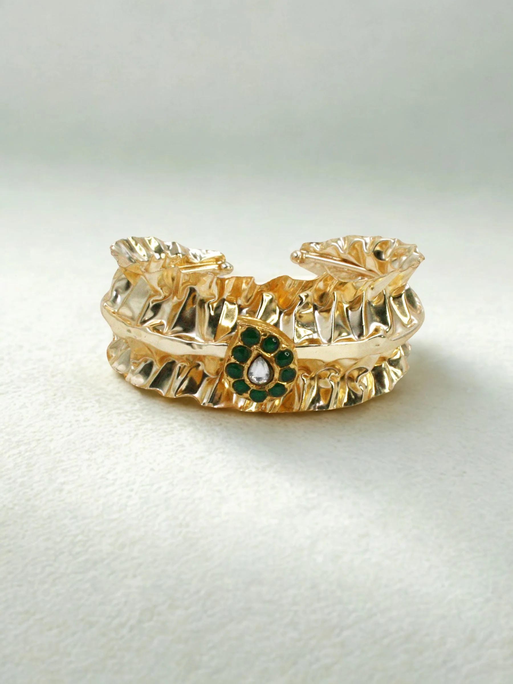 Inspired by the graceful curve of a botanical leaf, this handcrafted kada captures the poetry of nature in motion. Sculpted in textured metal and plated in 22K gold, it flows organically around the wrist — a symbol of renewal and life. At its heart rests a luminous stone, echoing a dewdrop glistening at dawn. A perfect balance of nature’s artistry and contemporary elegance.