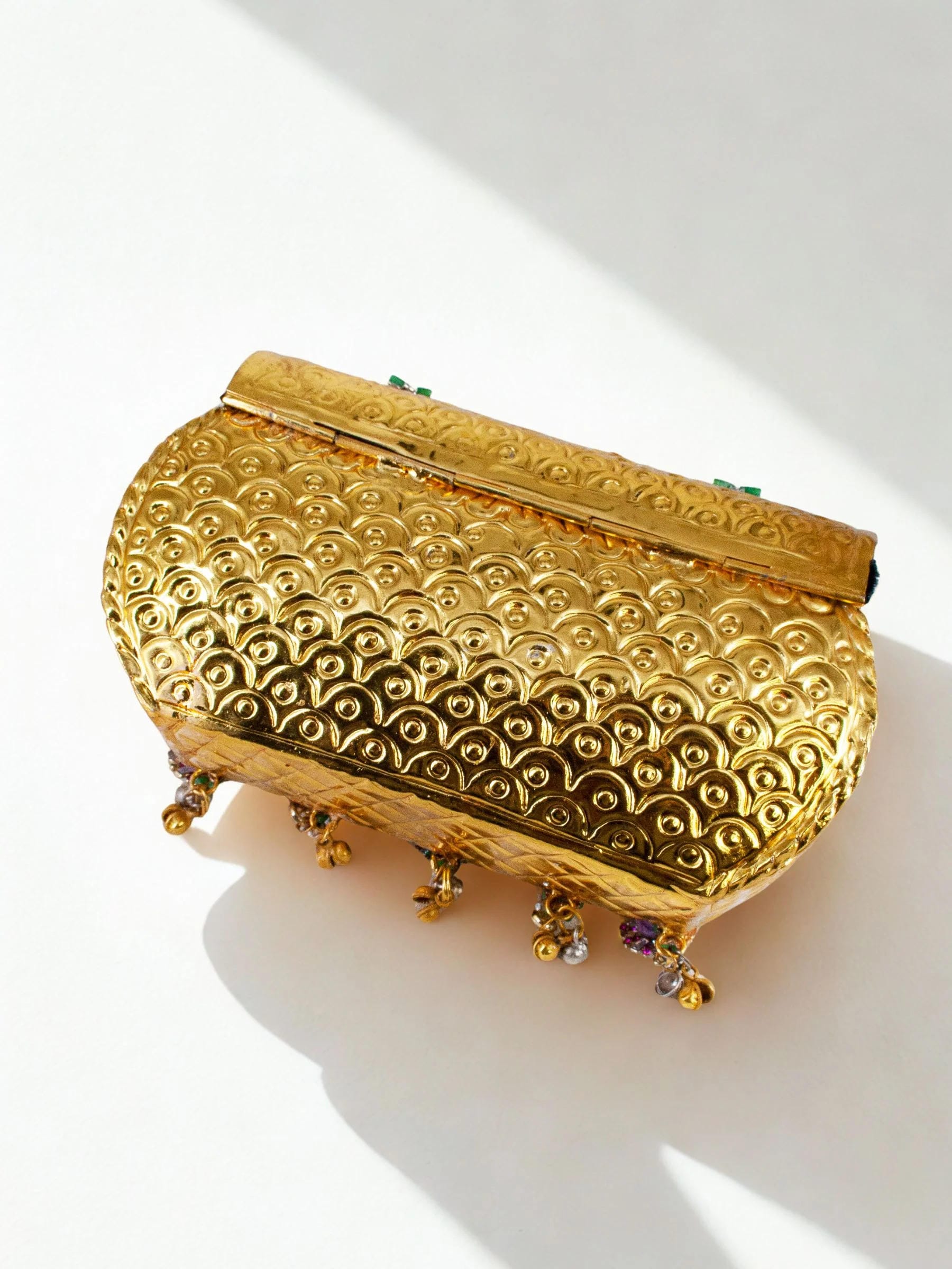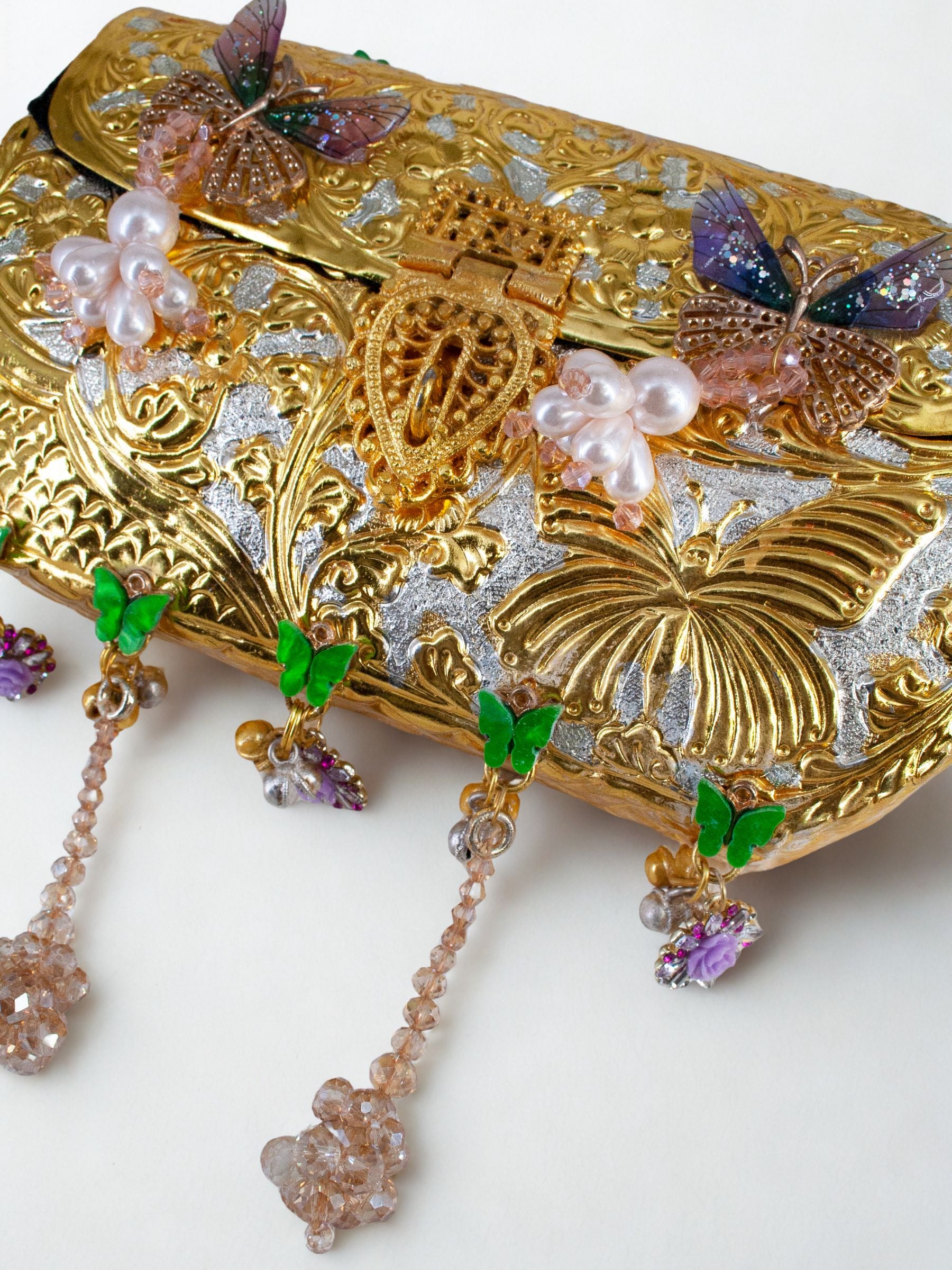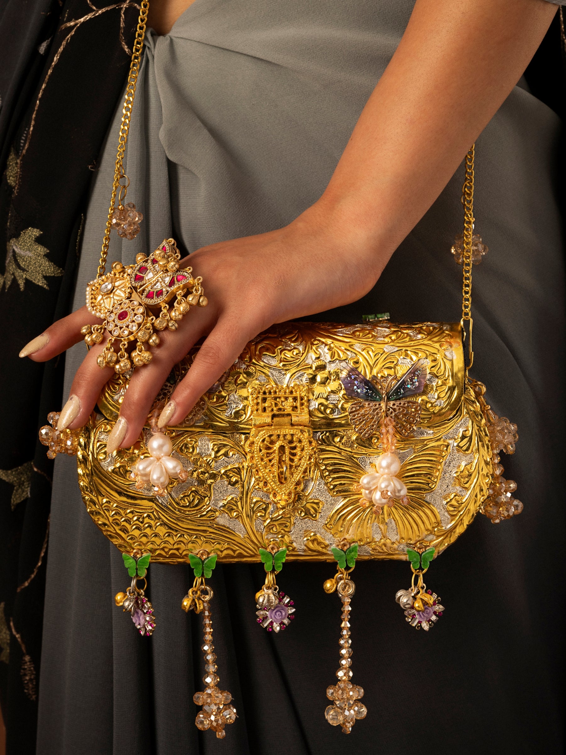 A fusion of whimsy and opulence, the Butterfly Boudoir Bag reinterprets Western elegance through the artistry of Indian repoussé craft. Sculpted in an asymmetrical form, it shimmers with butterflies in dual gold and silver plating — symbols of transformation and grace. Rose-pink pearl tassels and delicate beadwork lend softness to its metallic sheen, while green inlay butterfly motifs at the base add a touch of enchantment. Romantic yet regal, Butterfly Boudoir is a gilded ode to femininity in flight.