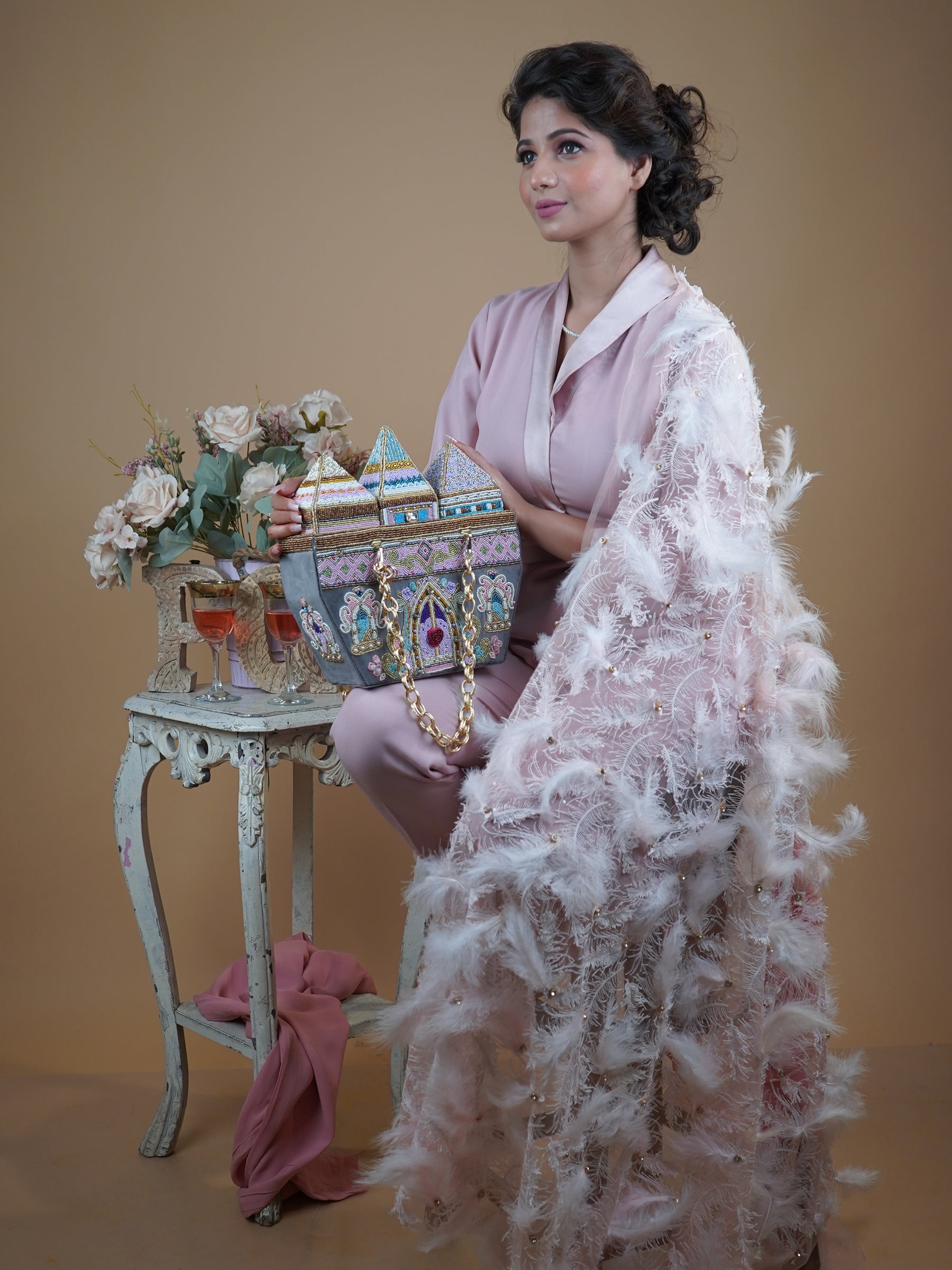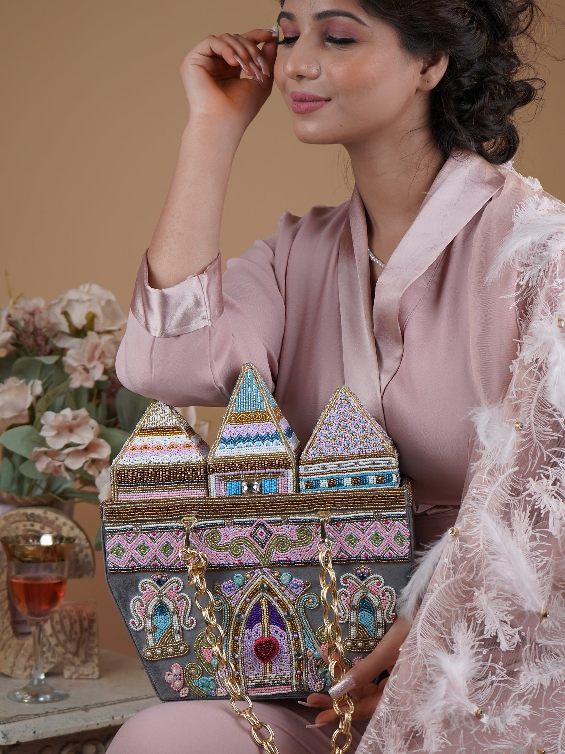 Carry a piece of art with you wherever you go, this bag is a testament to the beauty of handcrafted luxury. Let the intricate beadwork spark joy and wonder, elevating your style to a realm of fantasy and sophistication. Experience the magic of fairyland fantasies with our hand-beaded castle clutch, where every bead is a shimmering thread connecting you to a world of timeless elegance and enchantment. Each bag is adorned with thousands of beads in multiple shades, meticulously crafted to create a mesmerizing look that is as dazzling as it is enchanting. Handcrafted with beads & velvet in a striking grey hue, the piece measures 27x30x11cm, offering a structured yet practical silhouette, designed as a minaudière that effortlessly complements traditional attire as well as contemporary evening wear. Perfect for weddings, festive celebrations, and luxury soirées, it elevates every occasion with its opulent presence. Part of the Whispers of Versallis collection, it represents a seamless blend of heritage artistry and modern elegance, brought to life by the vision of Puneet Gupta Luxury.
