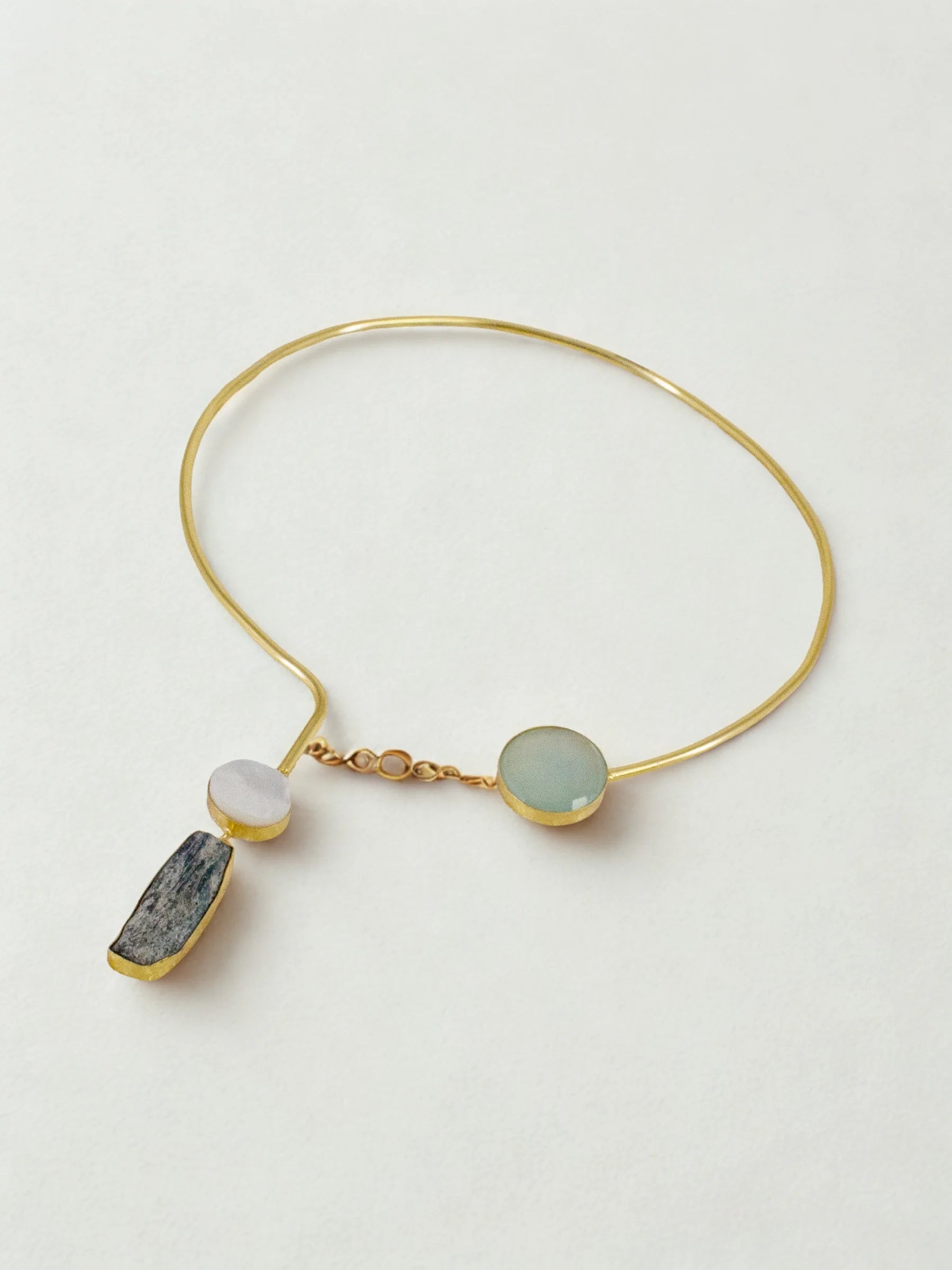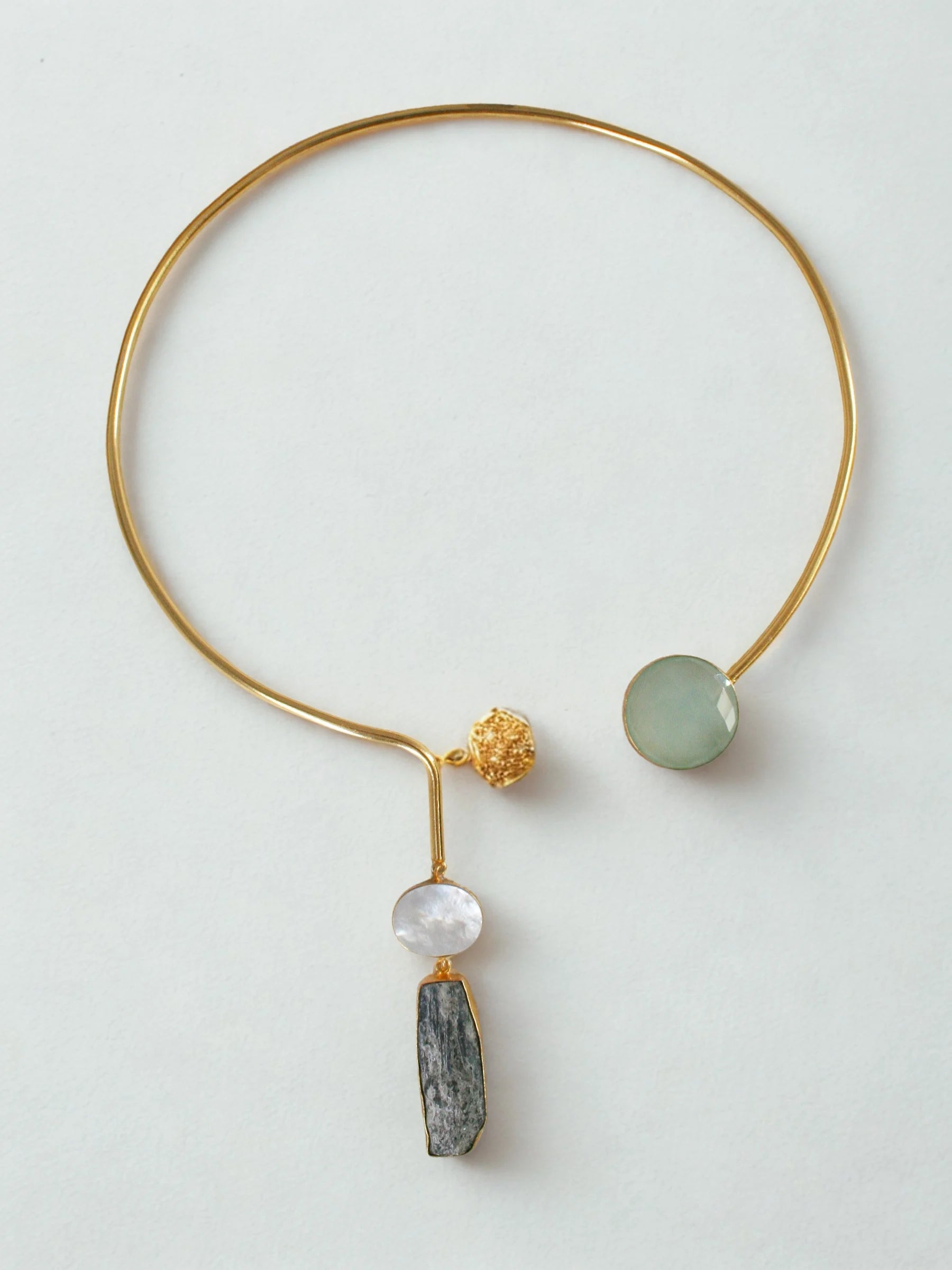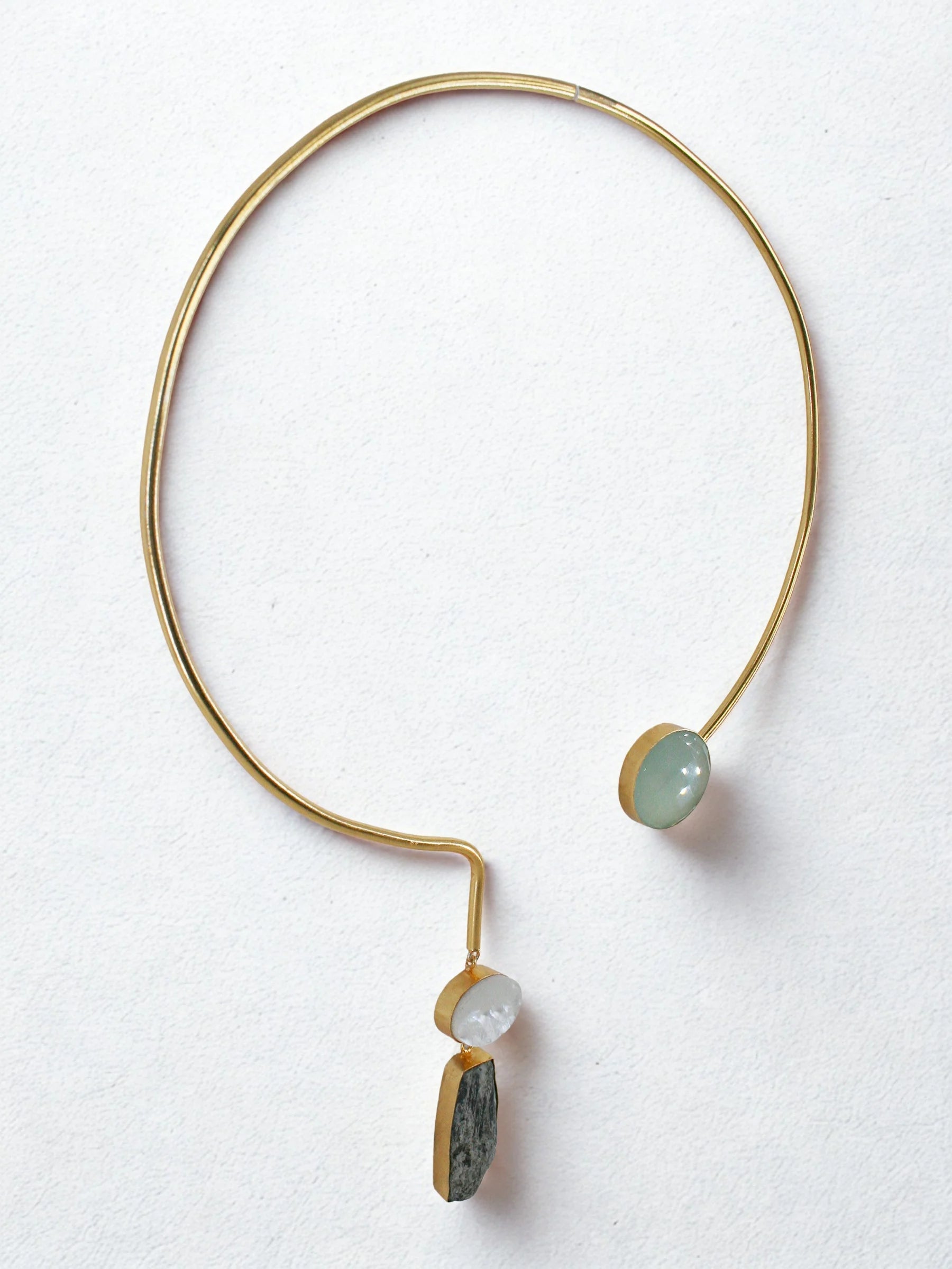 Handcrafted in recycled brass and finished with radiant 18K gold plating, the Celeste Hasli Collar reimagines a traditional hasli through a contemporary, sculptural lens. Raw asymmetrical stones anchor each side of the sleek metal collar, with a single suspended stone adding fluid movement and celestial charm. Bold, elemental, and artfully unrefined — a modern heirloom that brings cosmic elegance to the neckline.