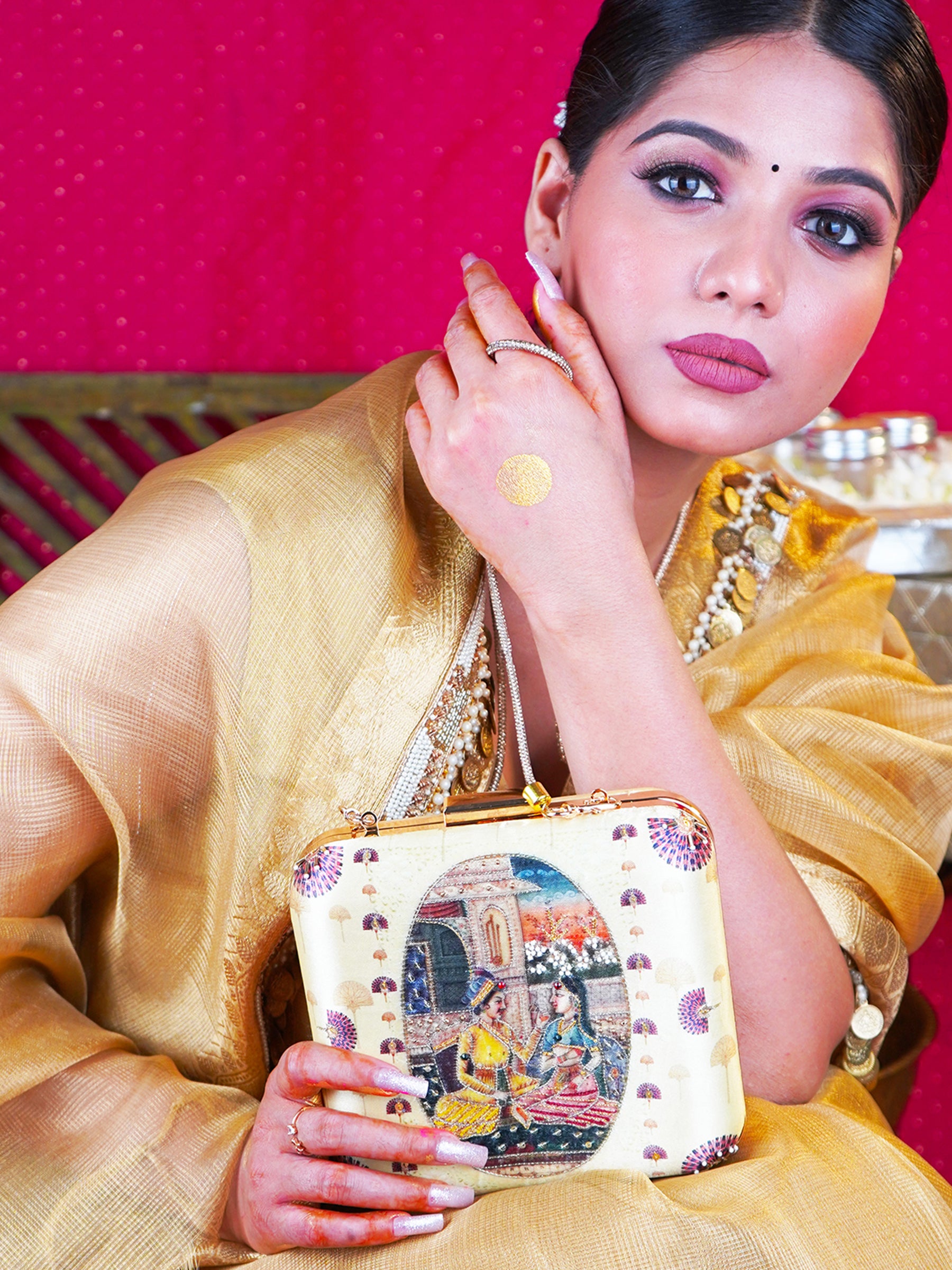 The clutch is adorned with Indian florals, symbolizing the bloom of their love, gracefully printed on either side of the royal couple. This portrayal is more than a design; it's an ode to timeless romance, artistry, and the grandeur of an era bygone.