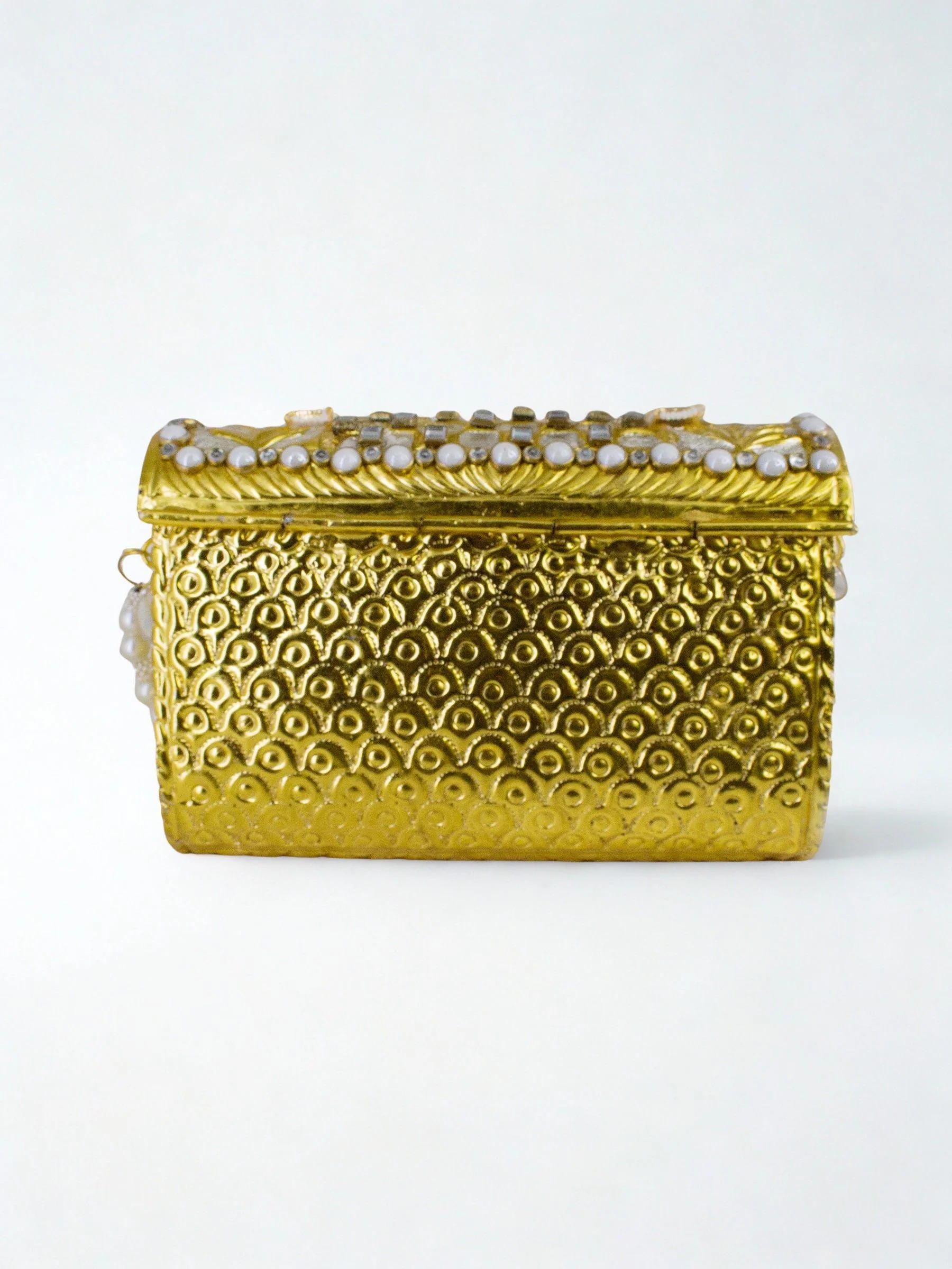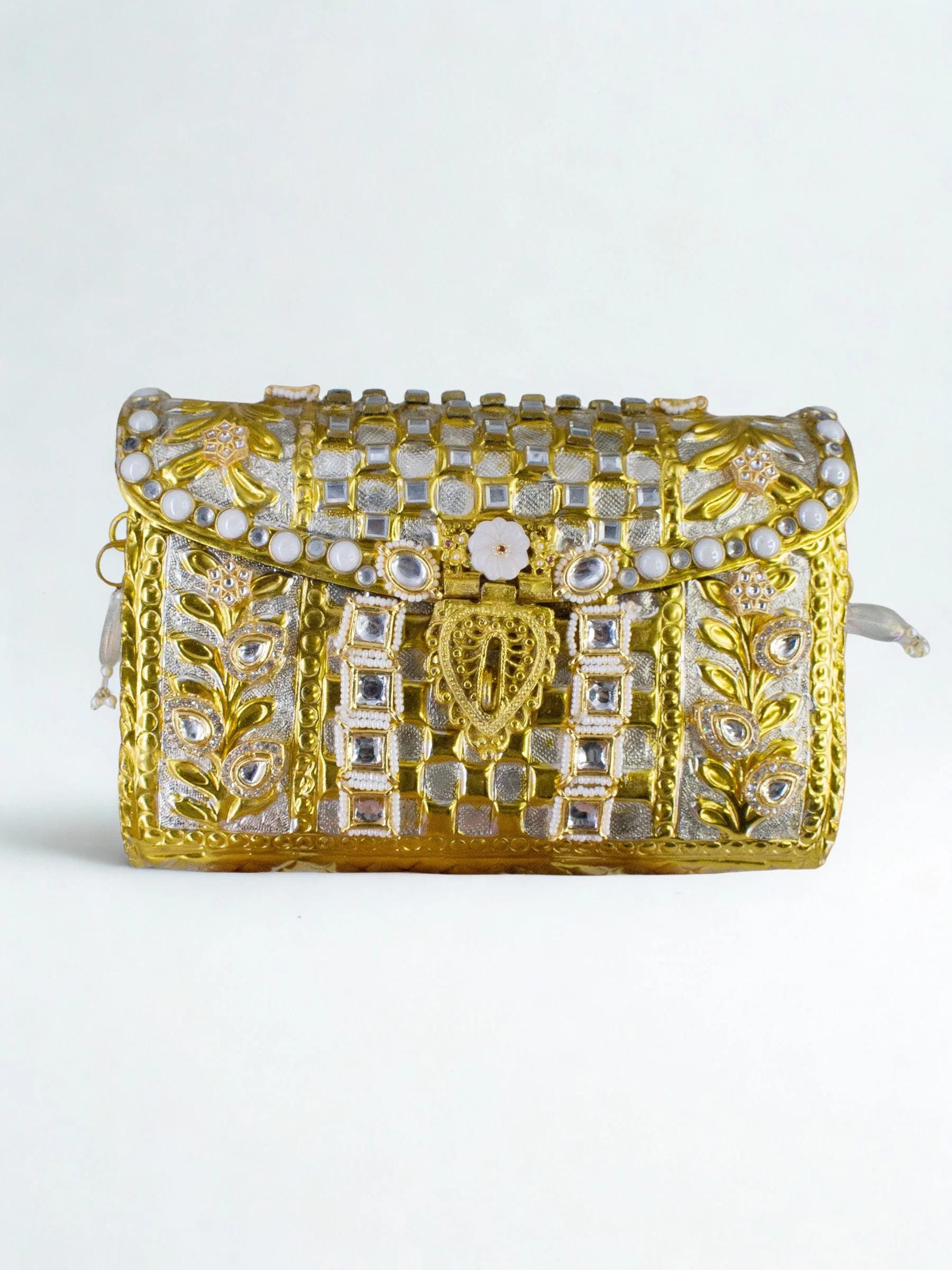 Rooted in the poetry of traditional weave and royal adornment, the Chandrika Chatai Bag reinterprets India’s timeless chatai craft in a sculptural silver-gold metal form. The interwoven texture glimmers like woven moonlight, while delicate kundan and real stone highlights lend it an heirloom glow. A pearl-encrusted handle crowns the design, adding a touch of regal restraint and romance. Both contemporary and classic, Chandrika is that perfect balance — where craft meets couture, and heritage gleams in modern light.