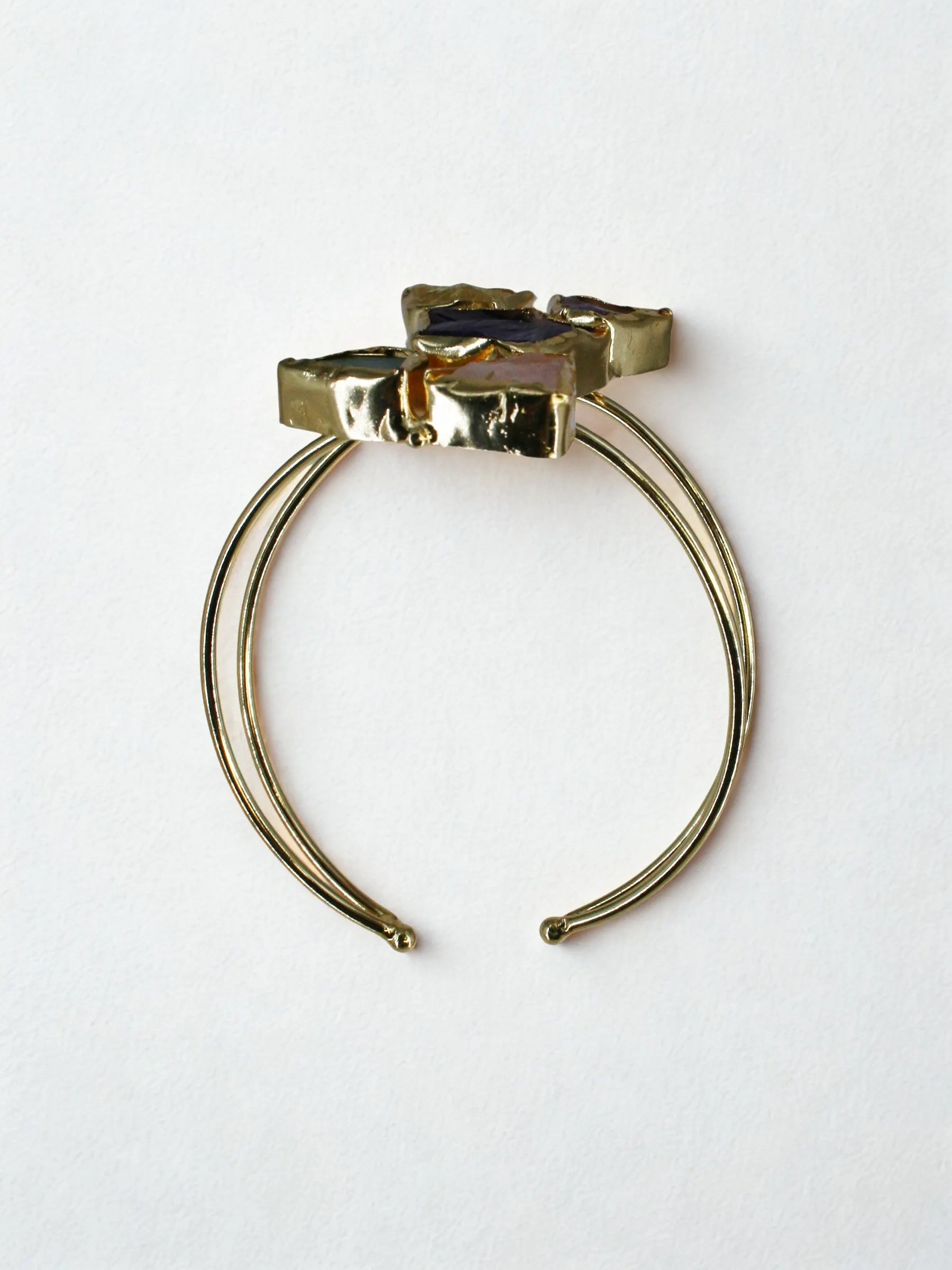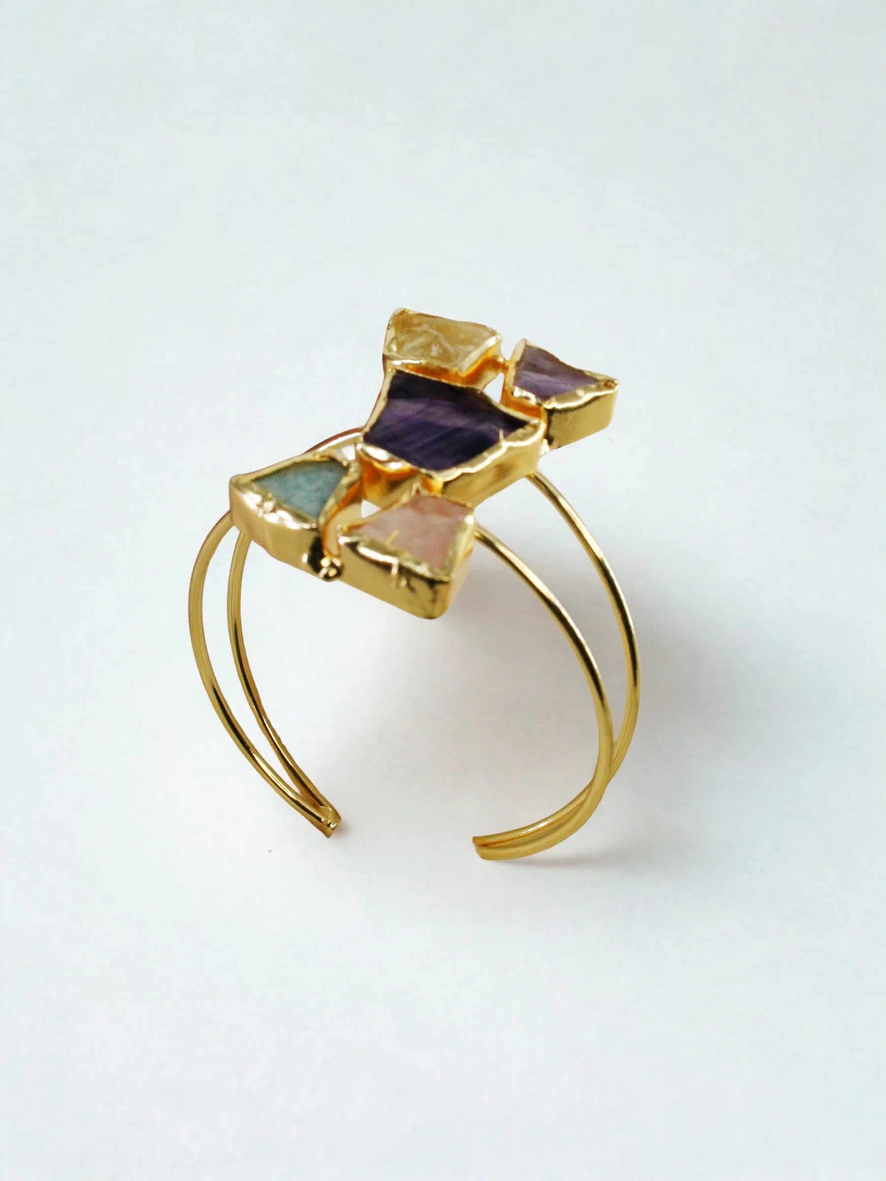 Handcrafted in recycled brass and finished with luminous 18K gold plating, the Crater Crust Handcuff features a bold cluster of five raw stones set at the center like an abstract mineral formation. Dual wire frames contour the edges of the broad cuff, adding structure and sculptural balance to its organic core. A striking modern heirloom that captures the rugged beauty of celestial craters through refined artisanal craft.