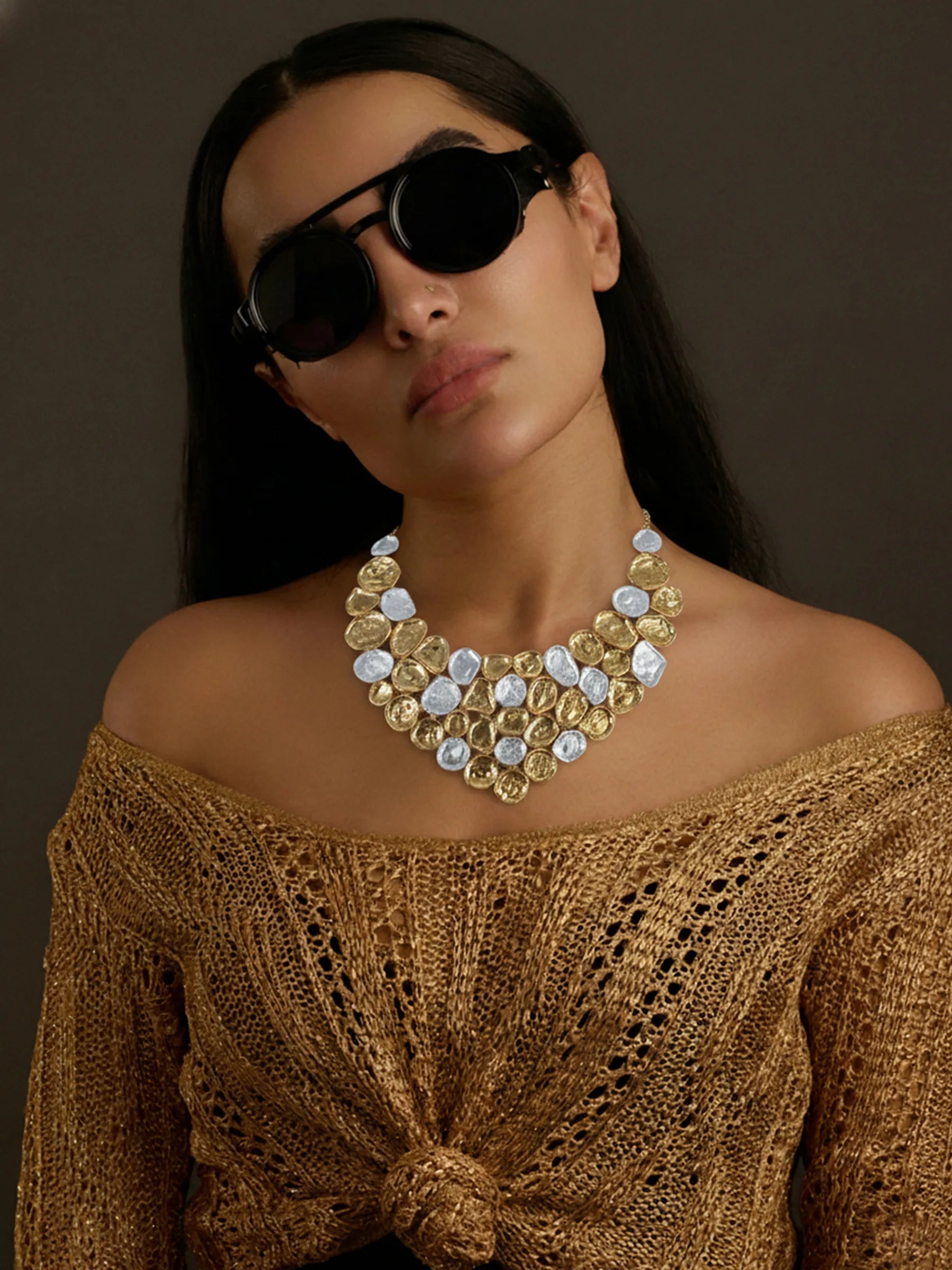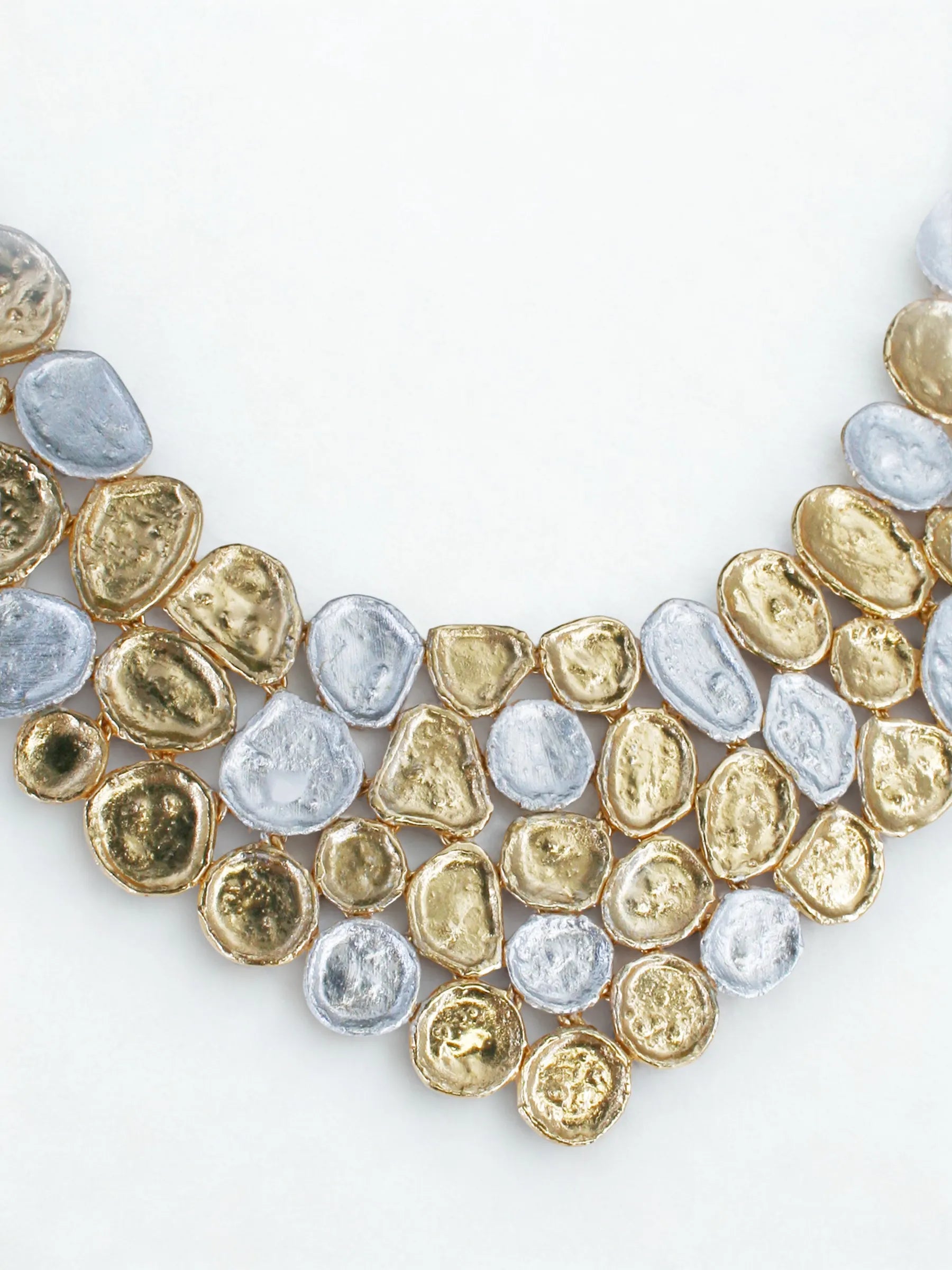 Handcrafted in recycled brass and finished in mixed gold and silver tones, the Crater Crust Necklace brings together asymmetrically sized beaten metal ovals, each textured like a celestial crater. Randomly linked in an organic arrangement, the piece creates a sculptural rhythm of light, shadow, and metallic contrast. Bold, tactile, and unmistakably artisanal — a modern heirloom shaped by the poetry of raw terrain.