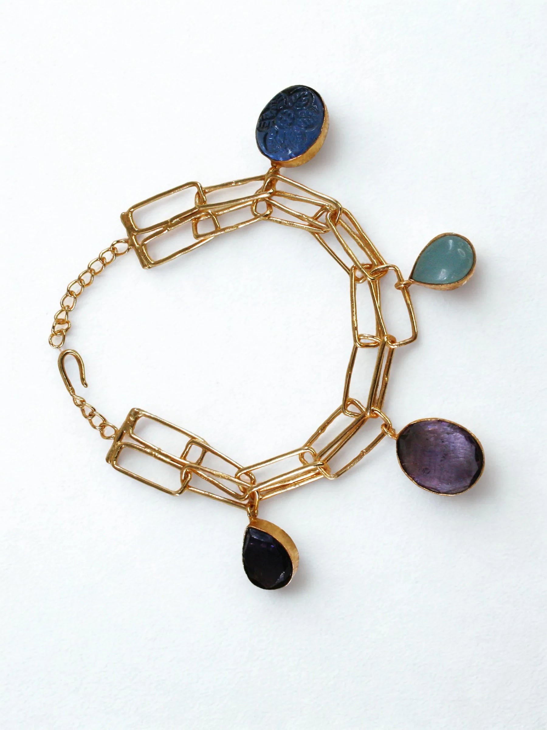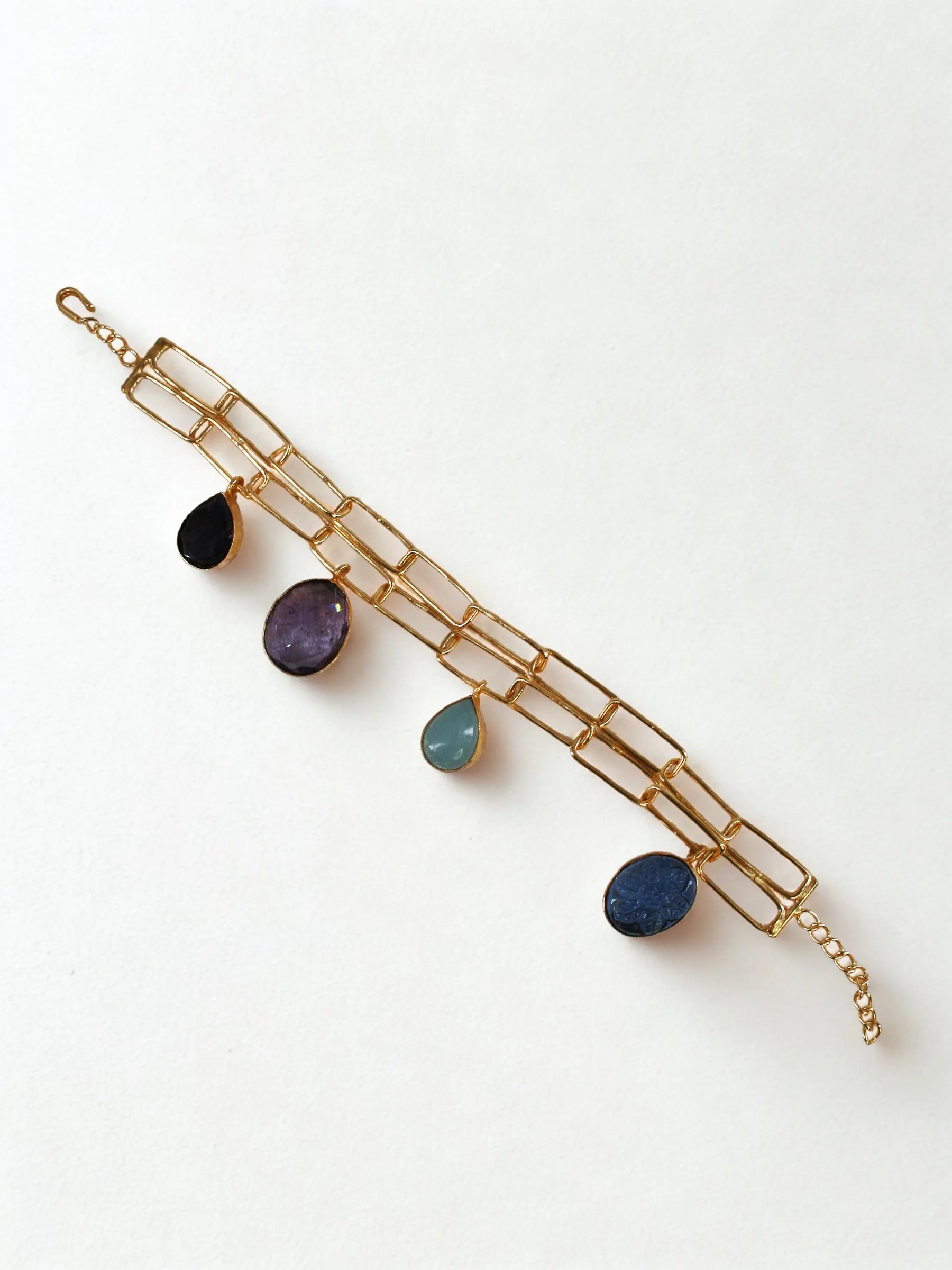 Handcrafted in recycled brass with a luminous 18K gold finish, the Crater Stone Bracelet features a delicate chain accented with raw stone charms, each one uniquely shaped like fragments of celestial terrain. Light, textured, and quietly expressive, it brings an elemental touch to everyday adornment. A modern heirloom that captures the artistry of natural stone in its most authentic form.