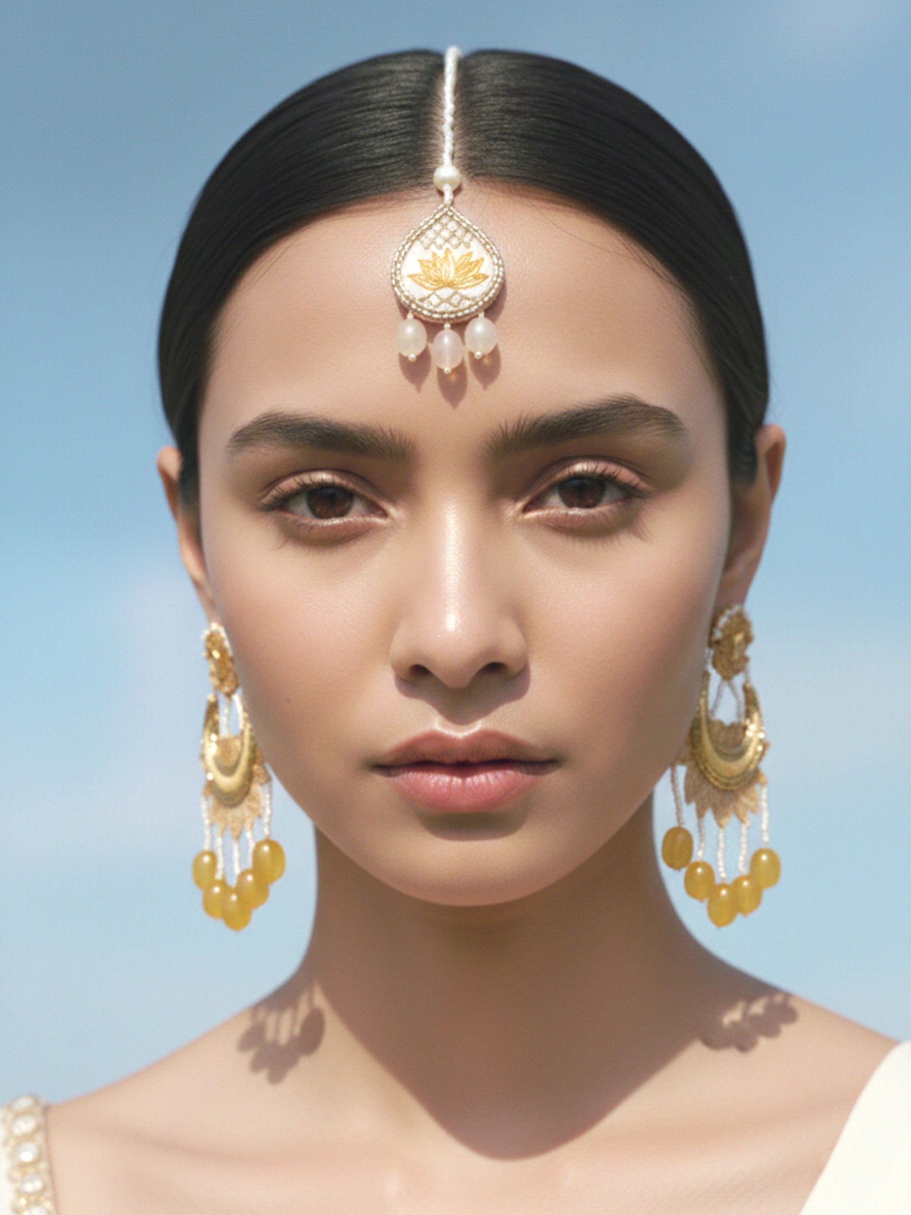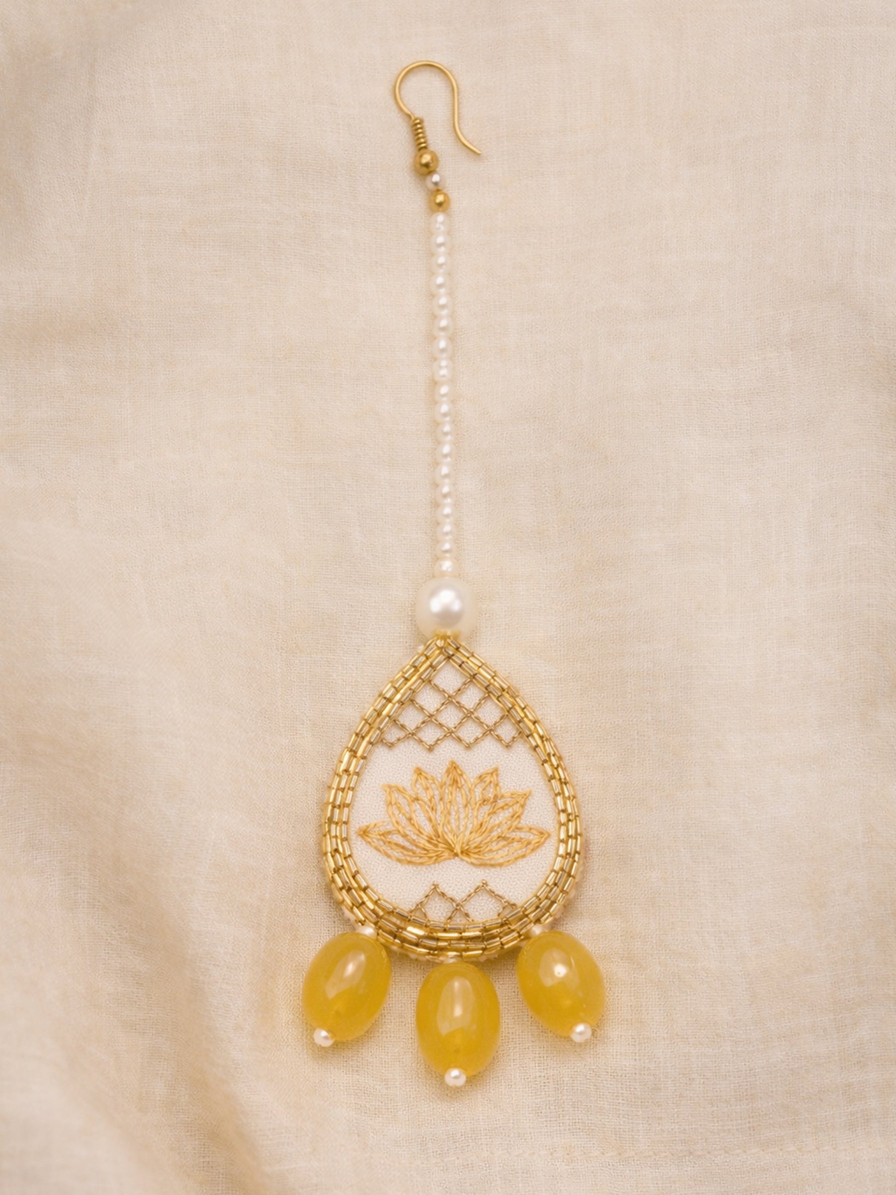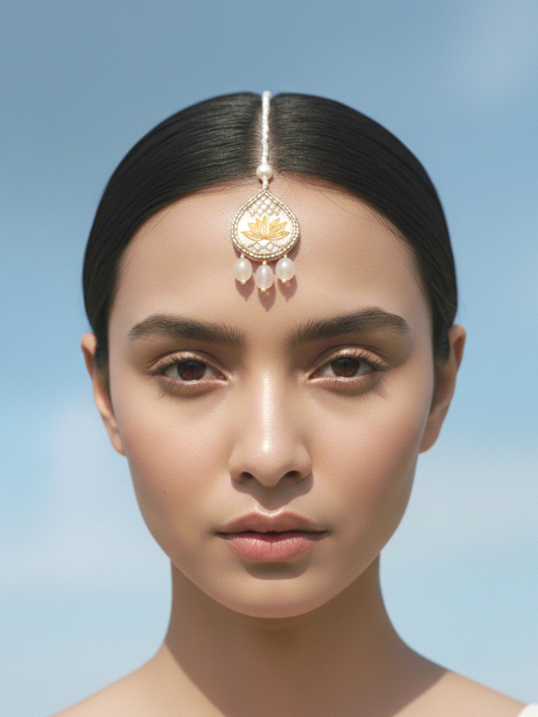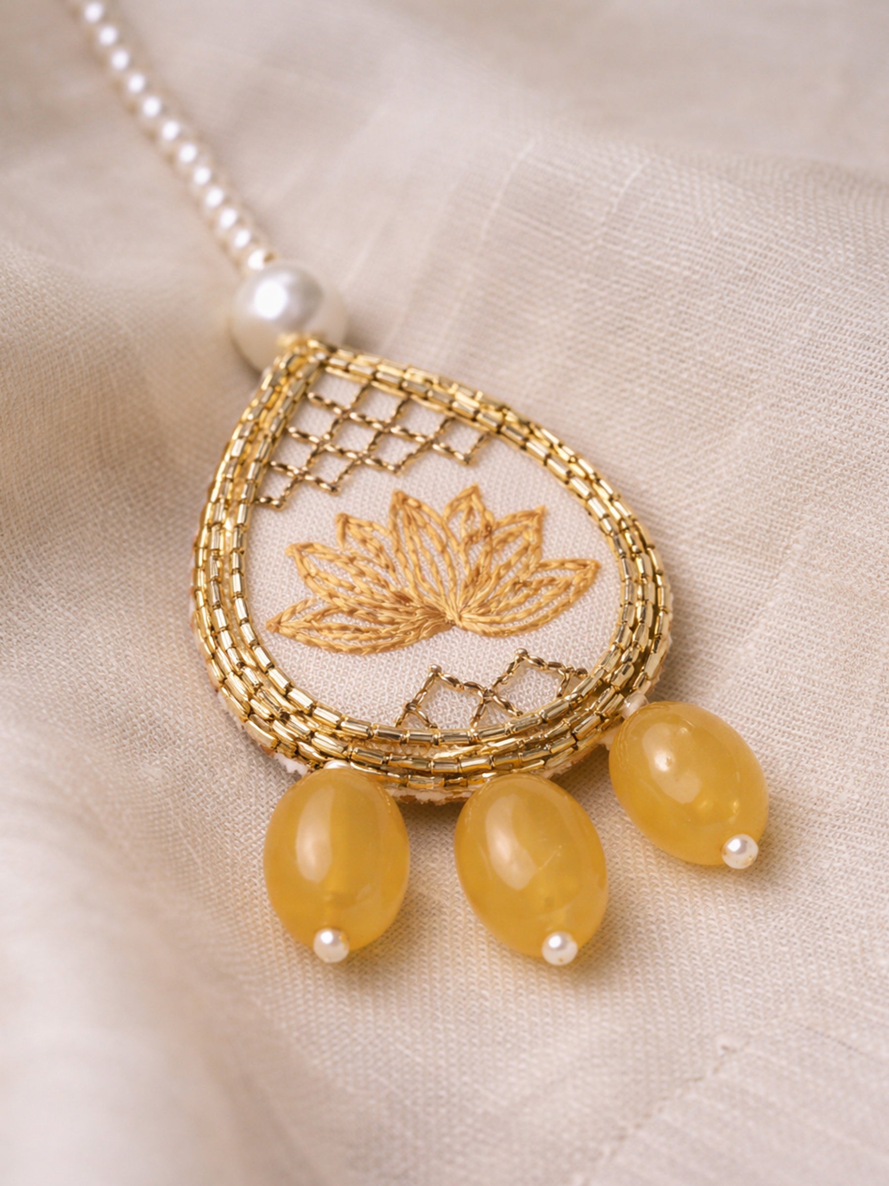 A drop shape headpiece inspired by celebratory sweets, intricately hand embroidered with pearl clusters and gold nalki accents. The texture feels rich without heaviness, making it luminous and refined rather than flashy. Perfect for daytime festivities and intimate celebrations.