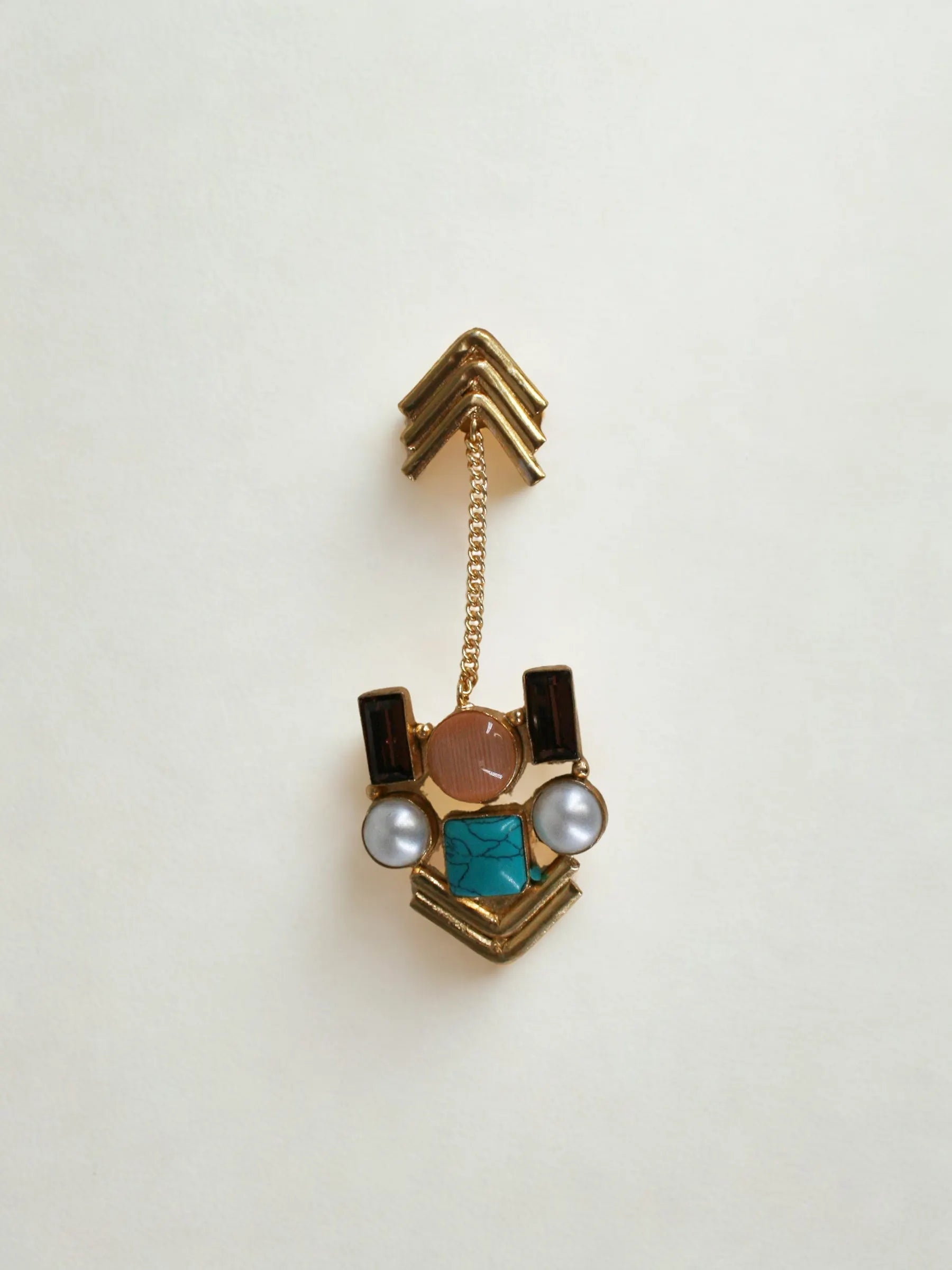 Handcrafted in recycled brass and finished with radiant 18K gold plating, the Deco Nova Finger Cap Ring reimagines Art Deco geometry through a bold, multi-coloured sculptural form. A secondary miniature ring, connected by a delicate chain, extends the design across the finger like an ornamental armour piece — modern, architectural, and exquisitely crafted. A statement heirloom that turns the hand into a canvas of light, form, and movement.