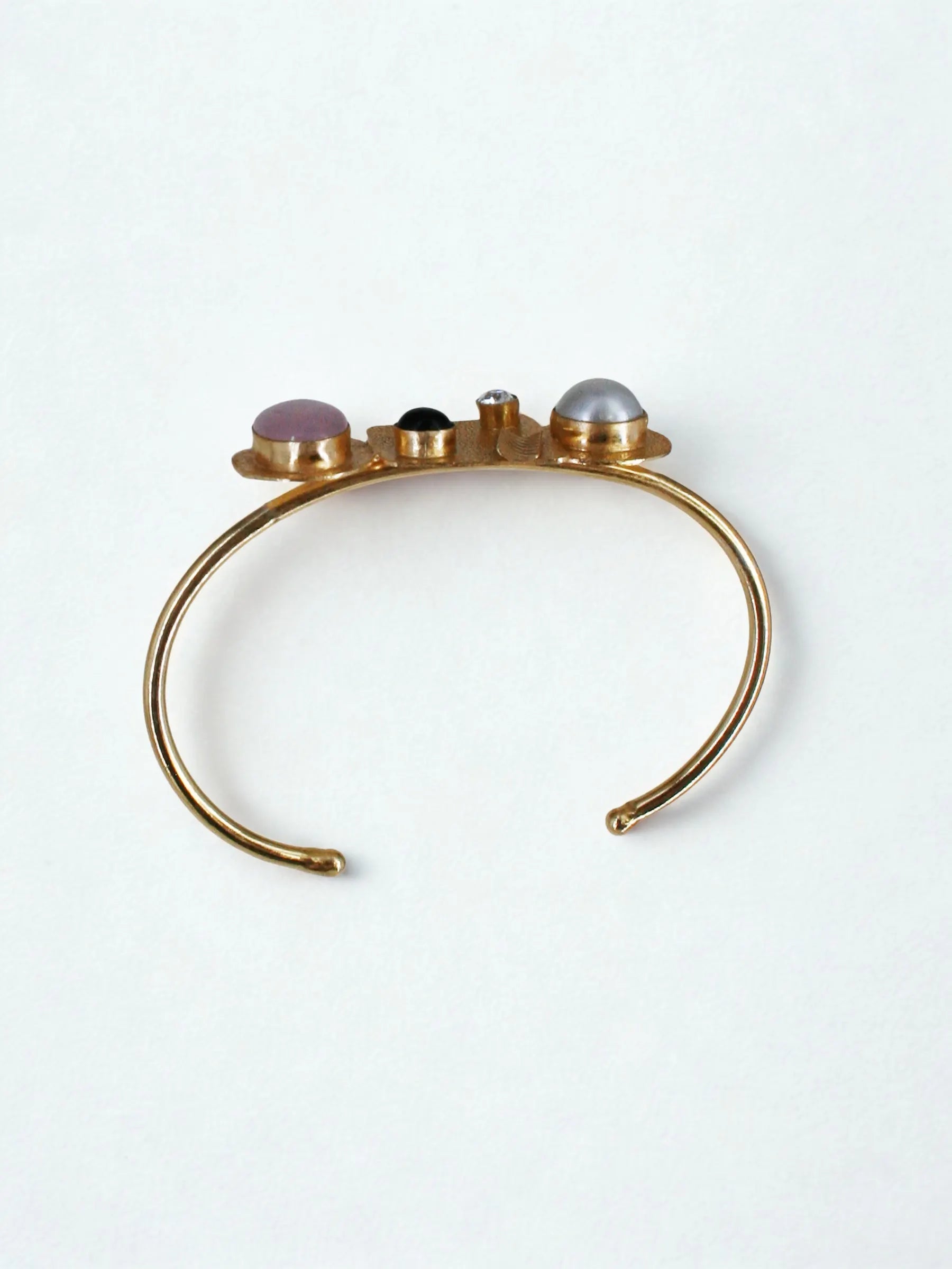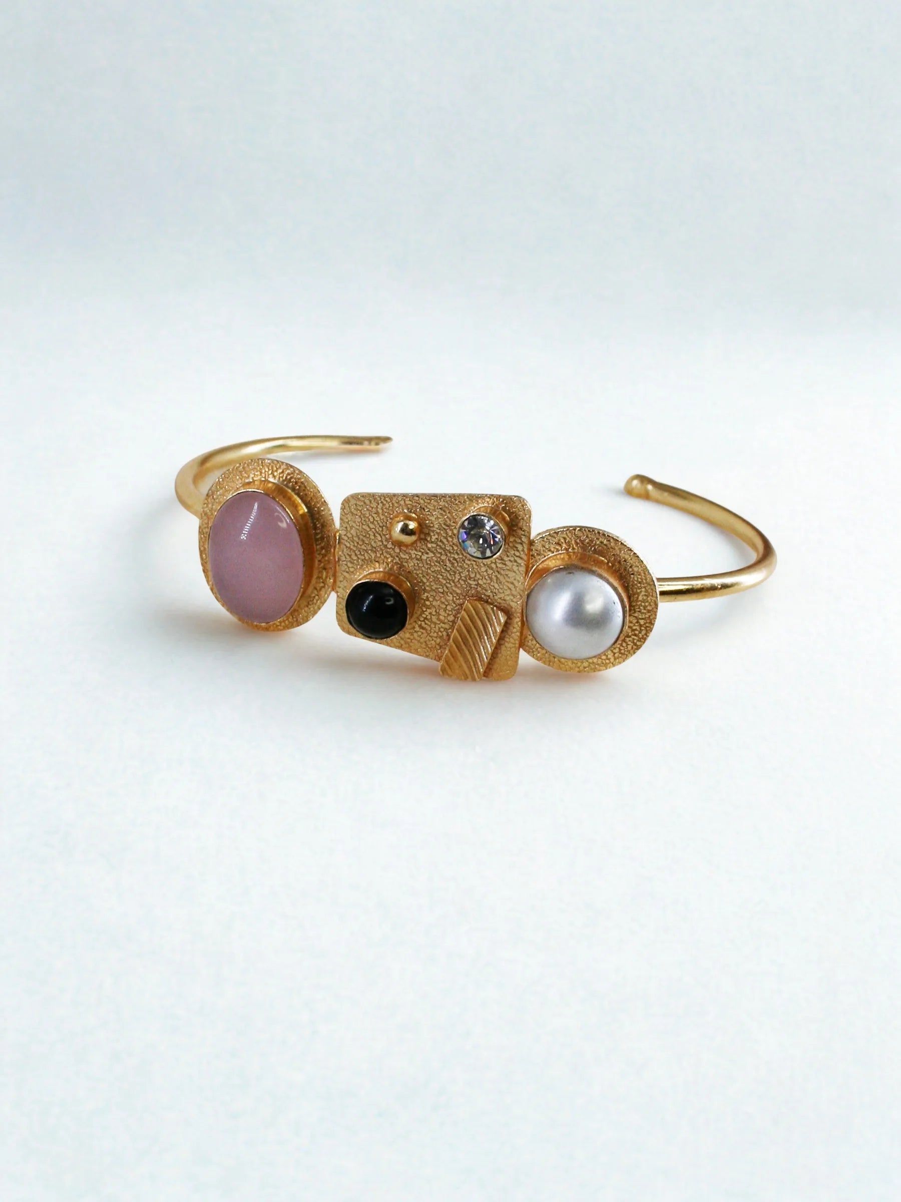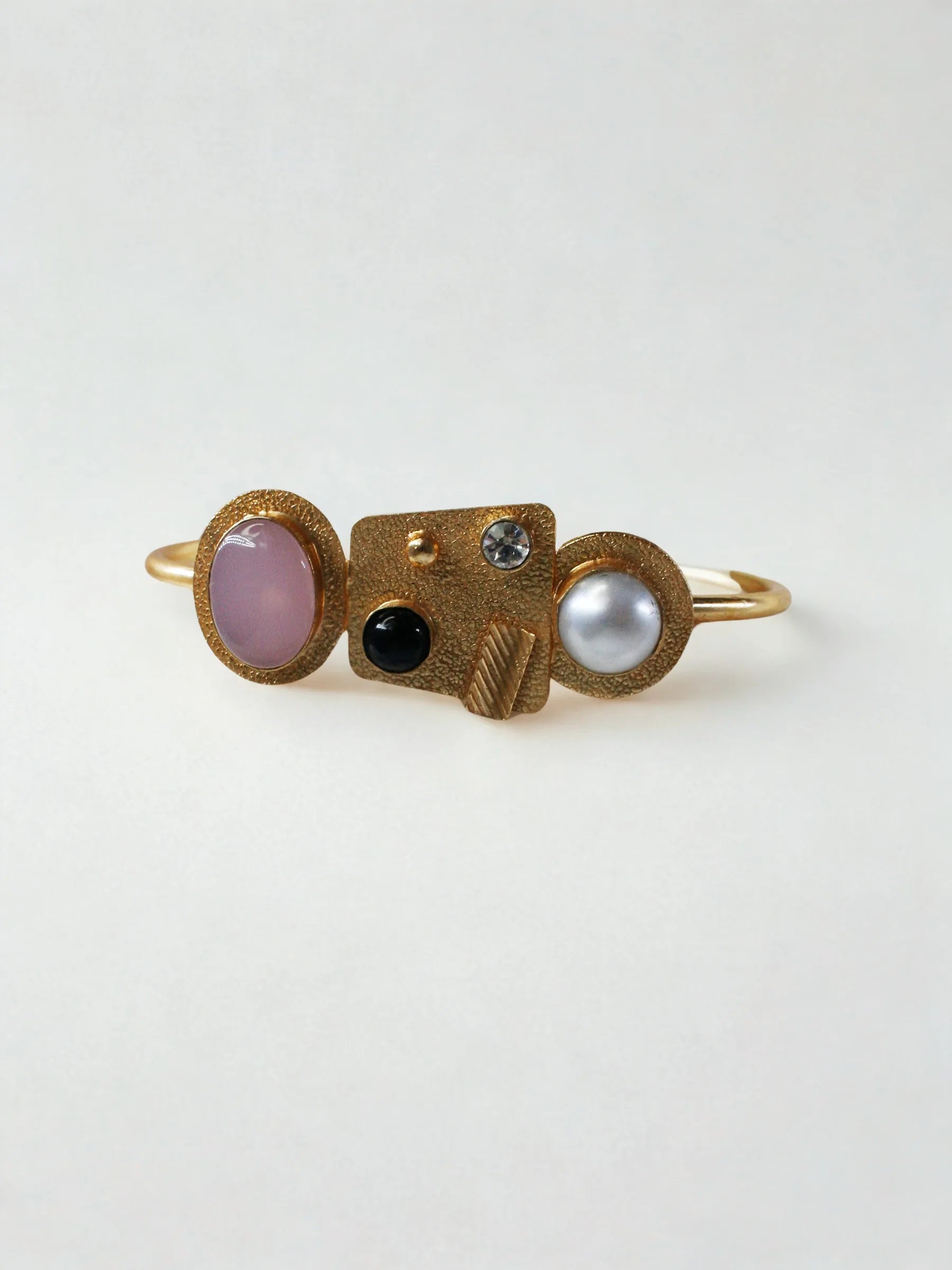 Handcrafted in recycled brass with a radiant 18K gold finish, the Éclat Deco Bracelet features an abstract, asymmetrical cluster of metal and stone that recalls the sculptural strength of a Ladakhi warrior’s chest plate. Raw textures meet Art Deco form, creating a piece that feels both ancient and avant-garde. A bold modern heirloom that celebrates protection, power, and artisanal precision.
