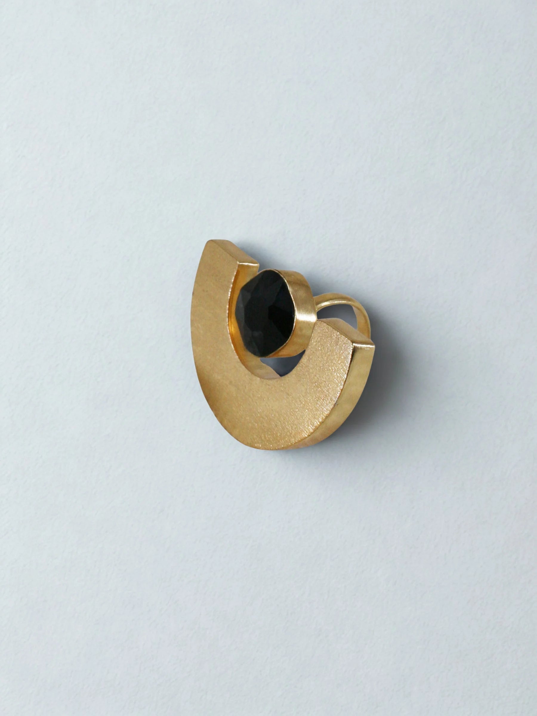Handcrafted in recycled brass and finished with radiant 18K gold plating, the Eclipse Ring frames a deep black stone with a sleek half-arch metal sheet, creating the dramatic silhouette of a celestial eclipse. Minimal yet magnetic, the interplay of shadow and shine gives the ring its sculptural, modern allure. A contemporary heirloom that captures a moment of cosmic alignment in refined geometric form.