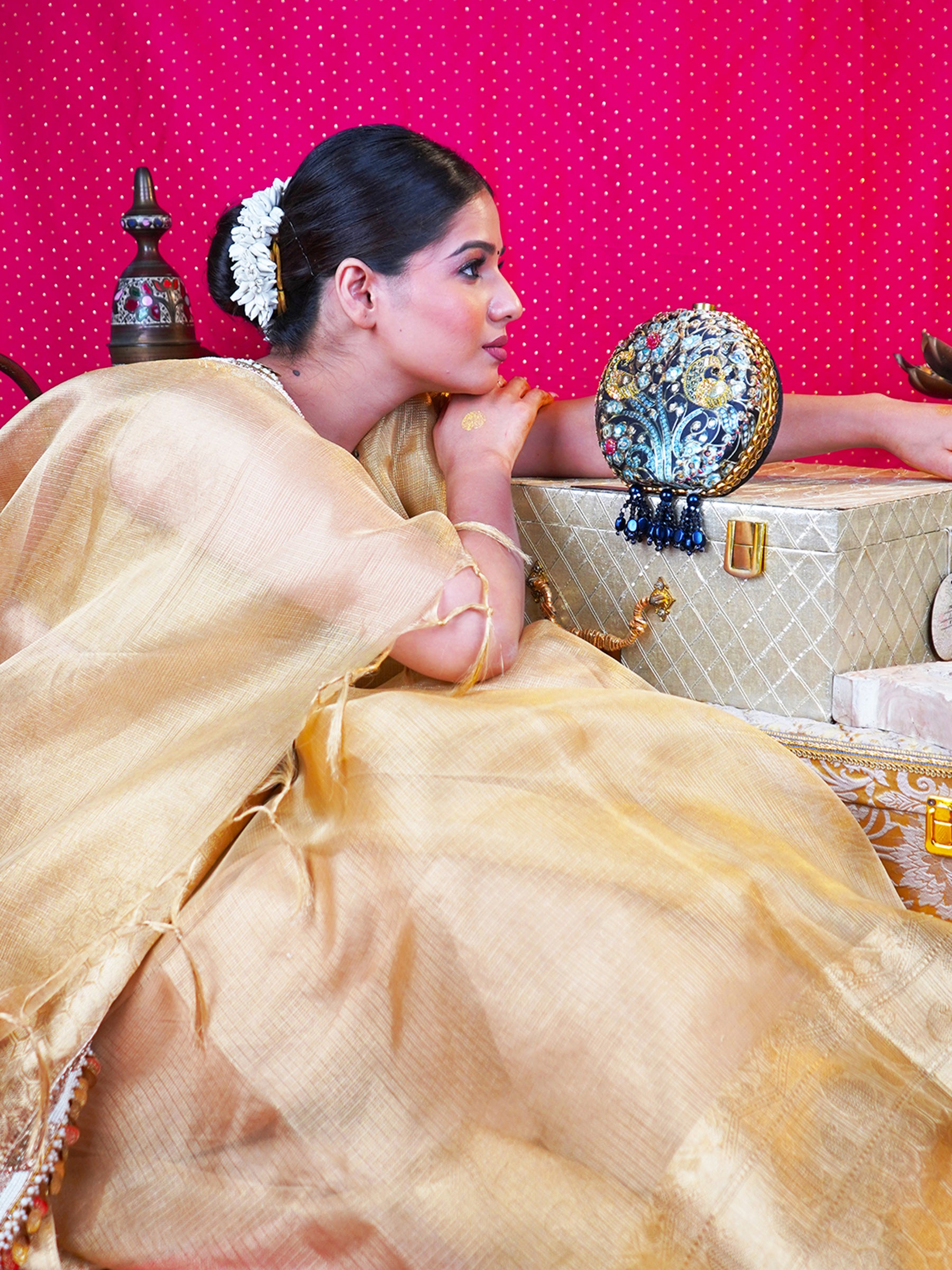 Crafted from sumptuous silk, it exudes luxury at every touch. Adorned with resplendent golden zari hand embroidery, the clutch features majestic peacocks in all their glory, while neo-vintage stones adorn its sides, adding a touch of nostalgia. The glistening golden sequins and a kaleidoscope of multi-hued royal florals and jewel prints transport you to the enchanting gardens of an Indian Maharani's Bageecha.