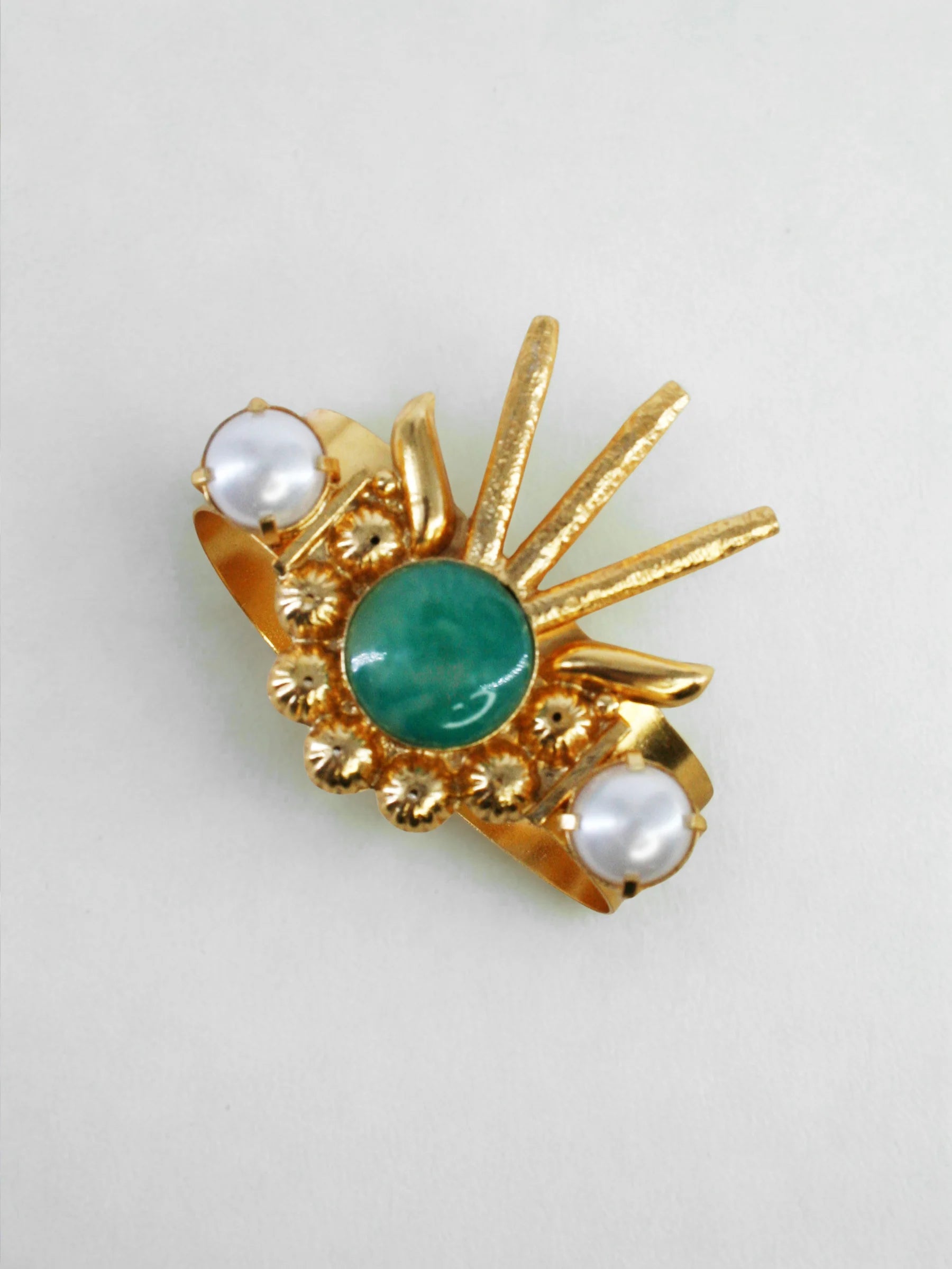 Handcrafted in recycled brass and finished with luminous 18K gold plating, the Ethra Line Bangle features a serene green stone at its center, framed by radiating gold lines on the upper half and a sculptural arc below. A single pearl on each side adds refined balance, blending symmetry with softness. A modern heirloom that channels Art Deco geometry through organic, contemporary elegance.