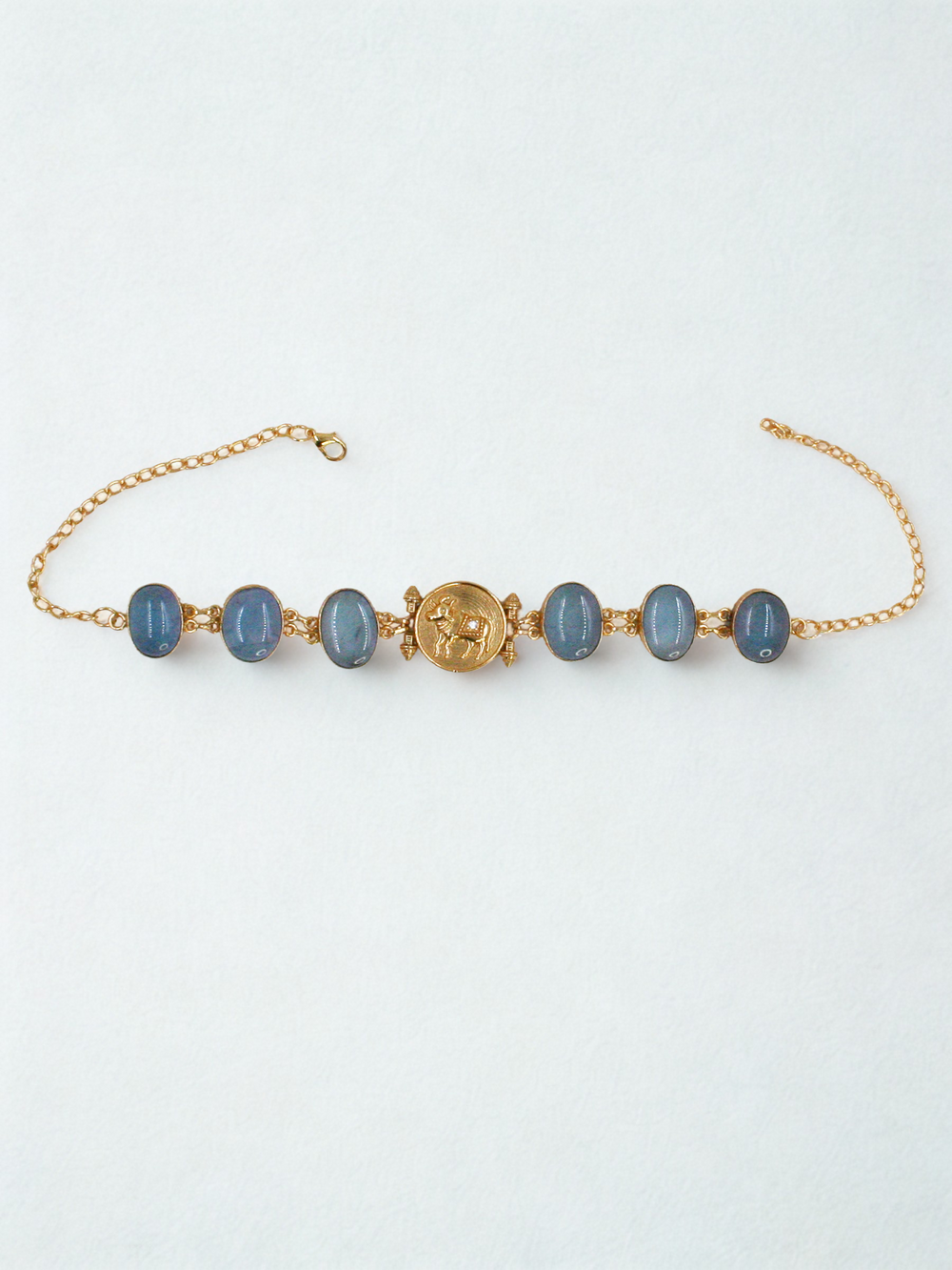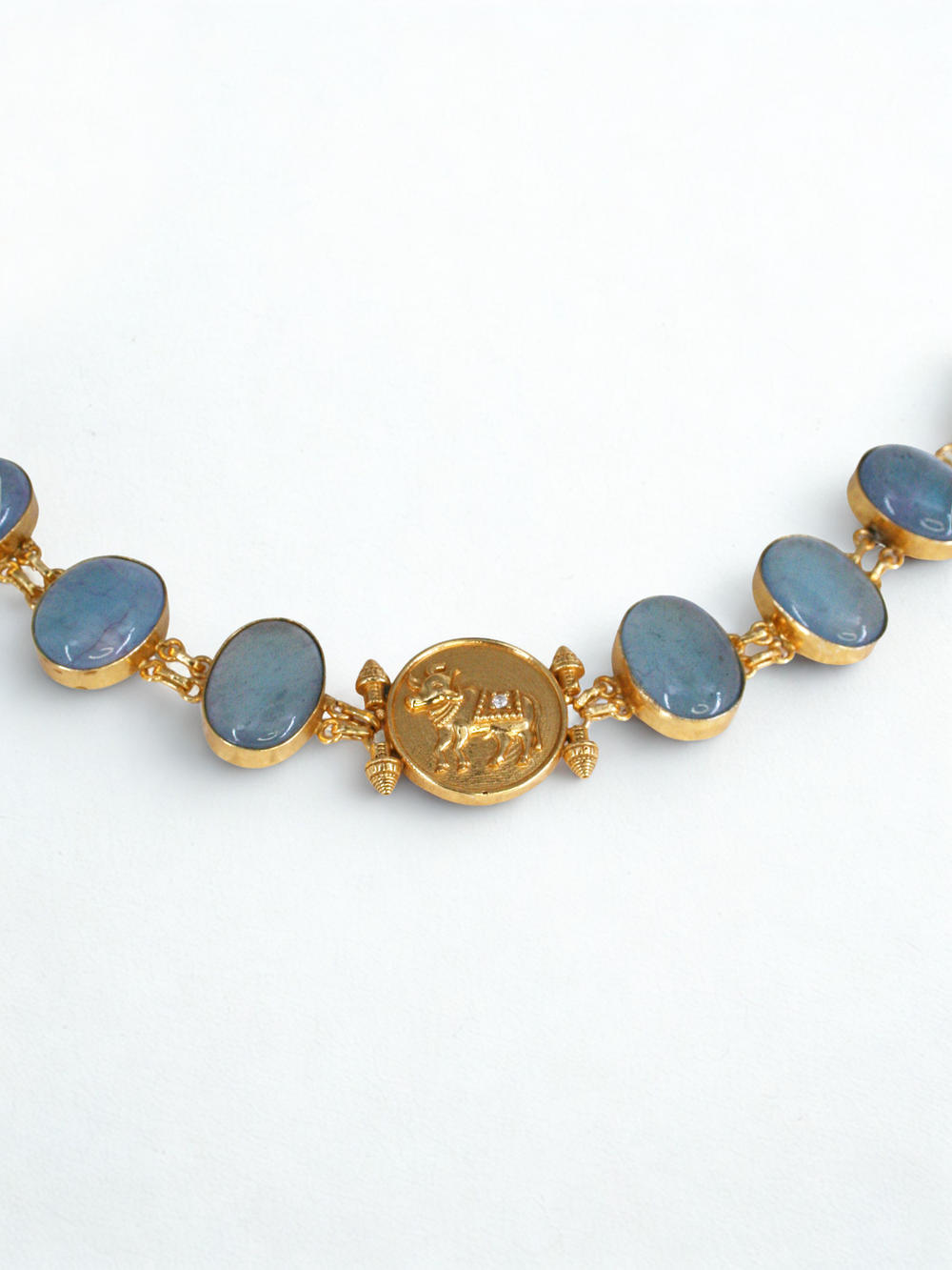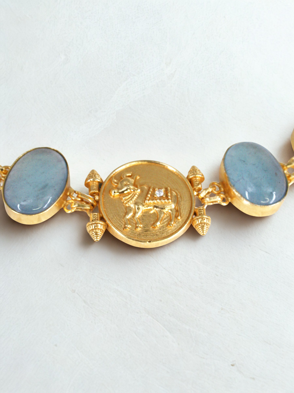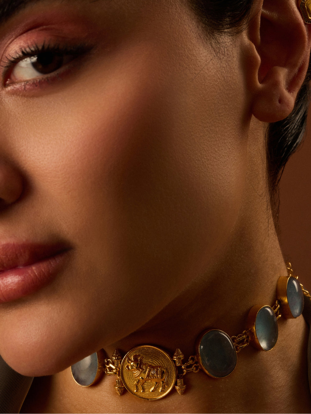 An ode to India’s symbolic heritage, this pendant features a gilded coin embossed with the serene form of the Indian cow — a motif of purity, abundance, and cultural reverence. Suspended from a strand of soft, faux-coloured stones, the piece blends traditional iconography with a contemporary silhouette. Handcrafted in recycled metal and finished with 18K gold plating, it is a quiet yet meaningful adornment — soulful, graceful, and deeply rooted in Indian belief.