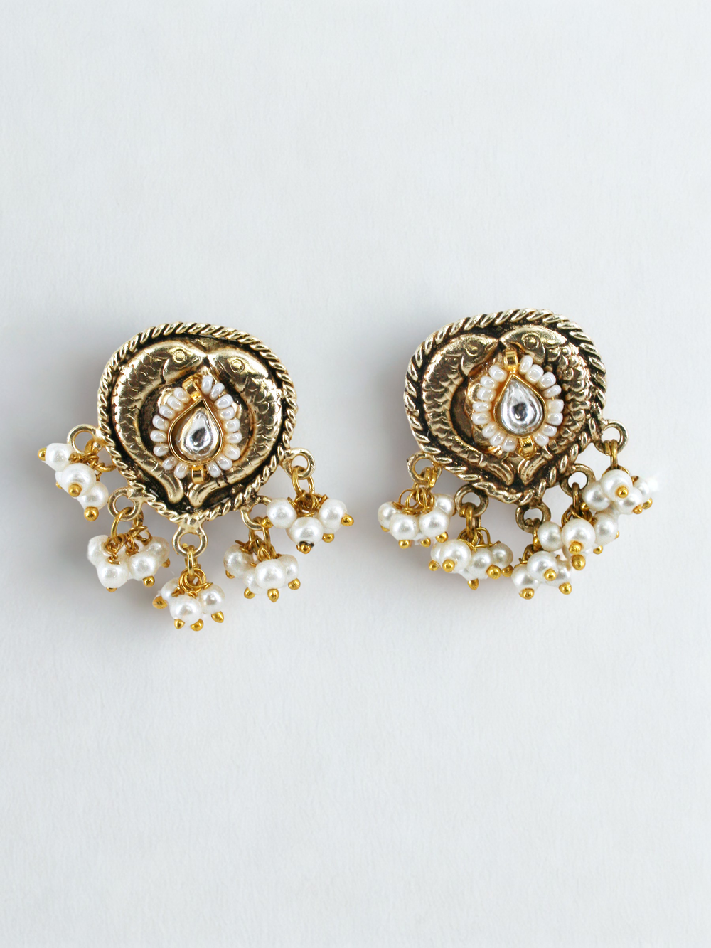 Symbolic and sweet, these studs feature twin machli forms curving gracefully into a heart, centered with a single kundan stone for a touch of quiet radiance. Handcrafted in recycled metal and finished with 18K gold plating, they blend playful artistry with cultural symbolism — petite, expressive, and timelessly charming.