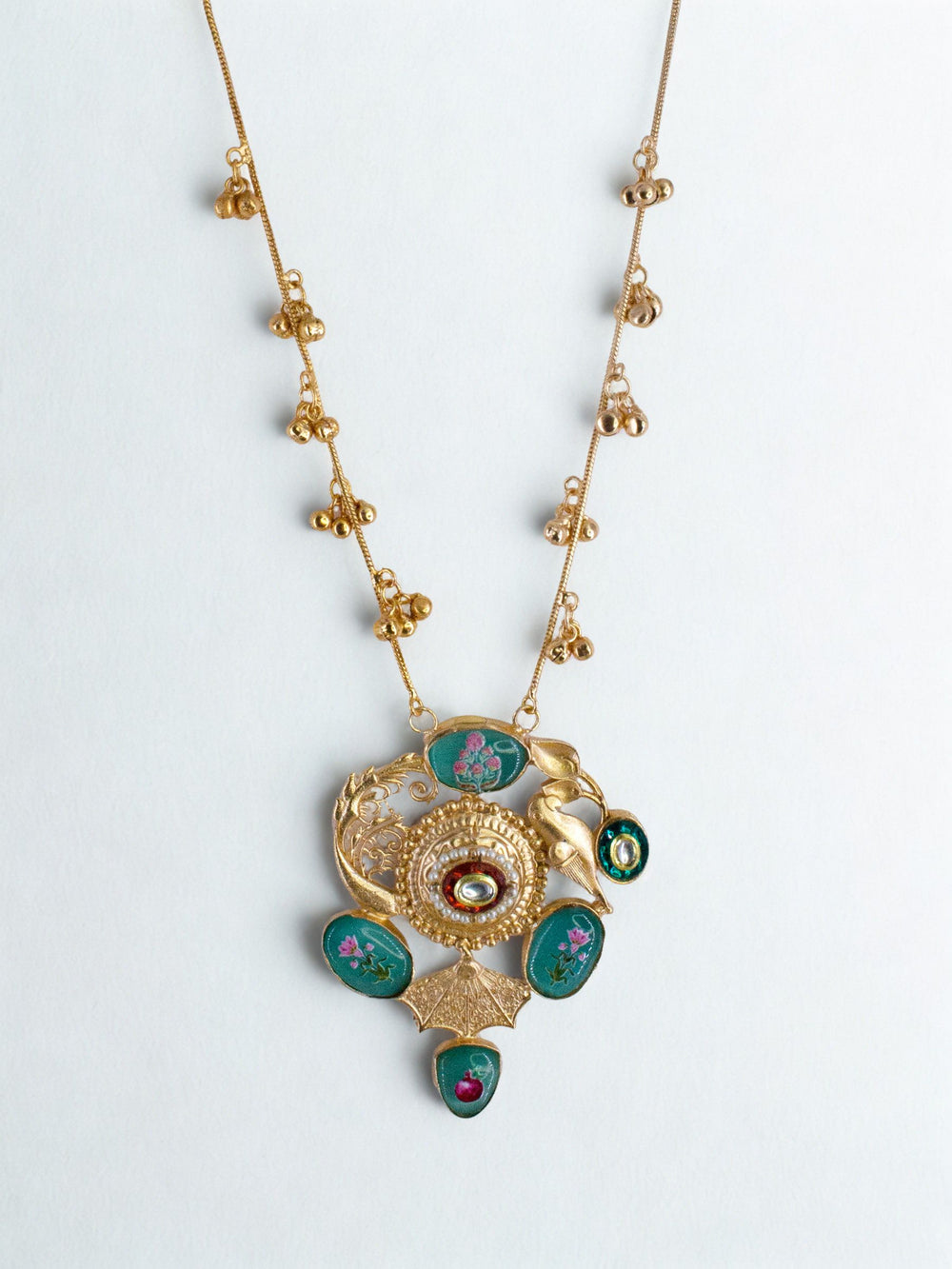 A fusion of artistry and adornment, this pendant pairs radiant kundan detailing with a hand-painted Mughal motif rendered on polished green jade. Each stroke and setting is shaped by artisan hands, celebrating centuries-old miniature painting traditions through a contemporary lens. Handcrafted in recycled metal with 18K gold plating, it is a piece of wearable storytelling — vivid, intricate, and timeless in its cultural depth.
