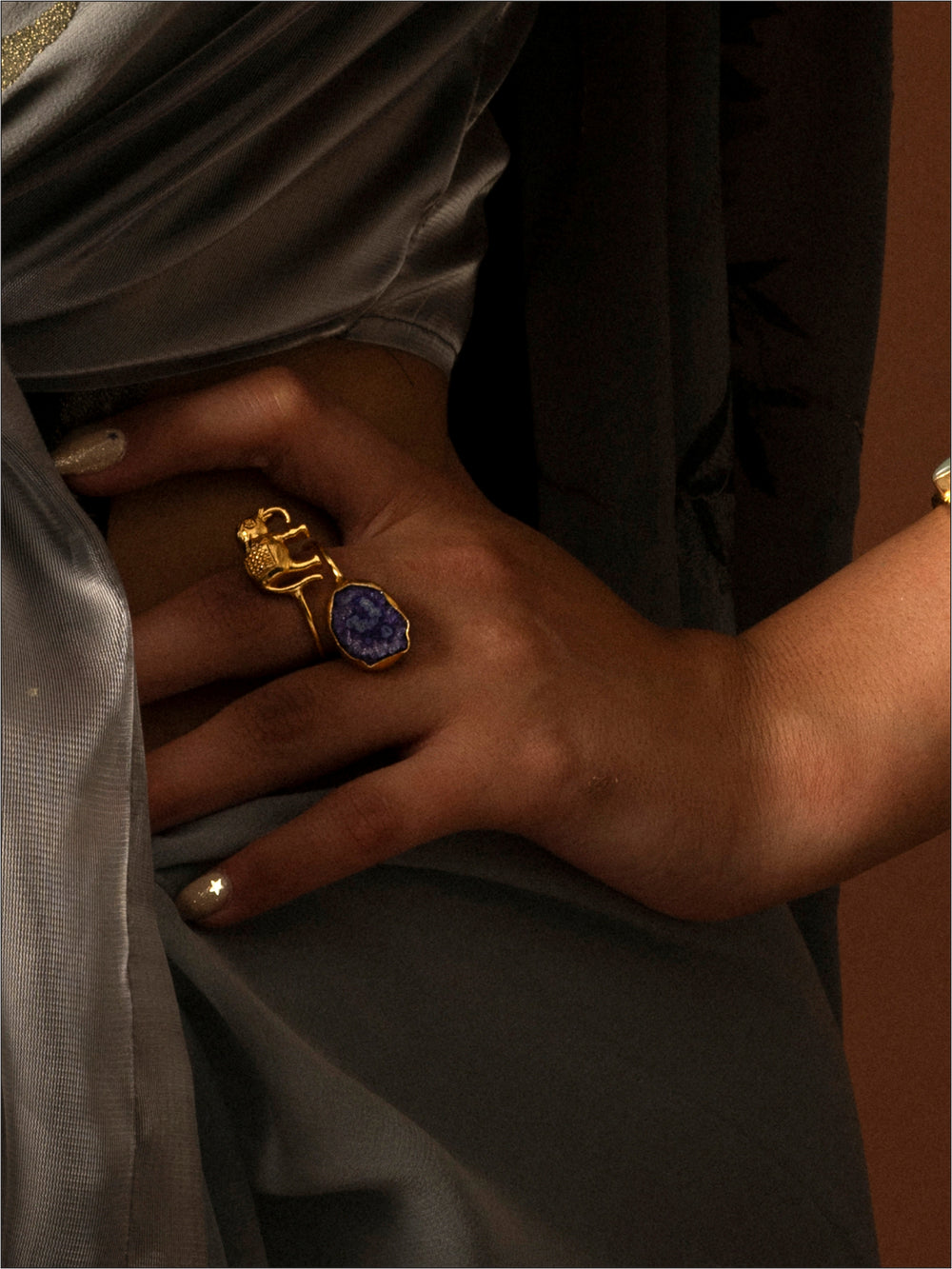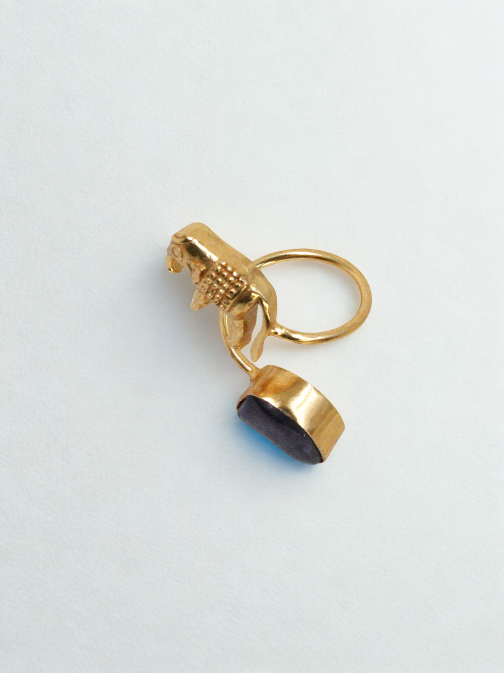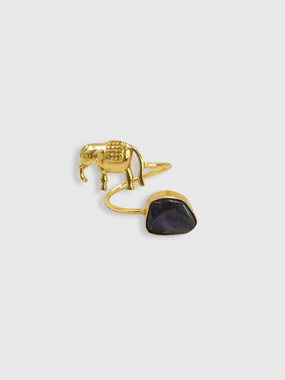 Minimal yet meaningful, the Haathi Balance Ring pairs a sleek gold-toned wire band with two sculptural elements — a raw, uncut stone on one side and a cast elephant motif on the other. Handcrafted in recycled metal and finished with 18K gold plating, it blends cultural symbolism with modern restraint. Elegant, expressive, and quietly powerful — a fusion ring that celebrates harmony in contrast.