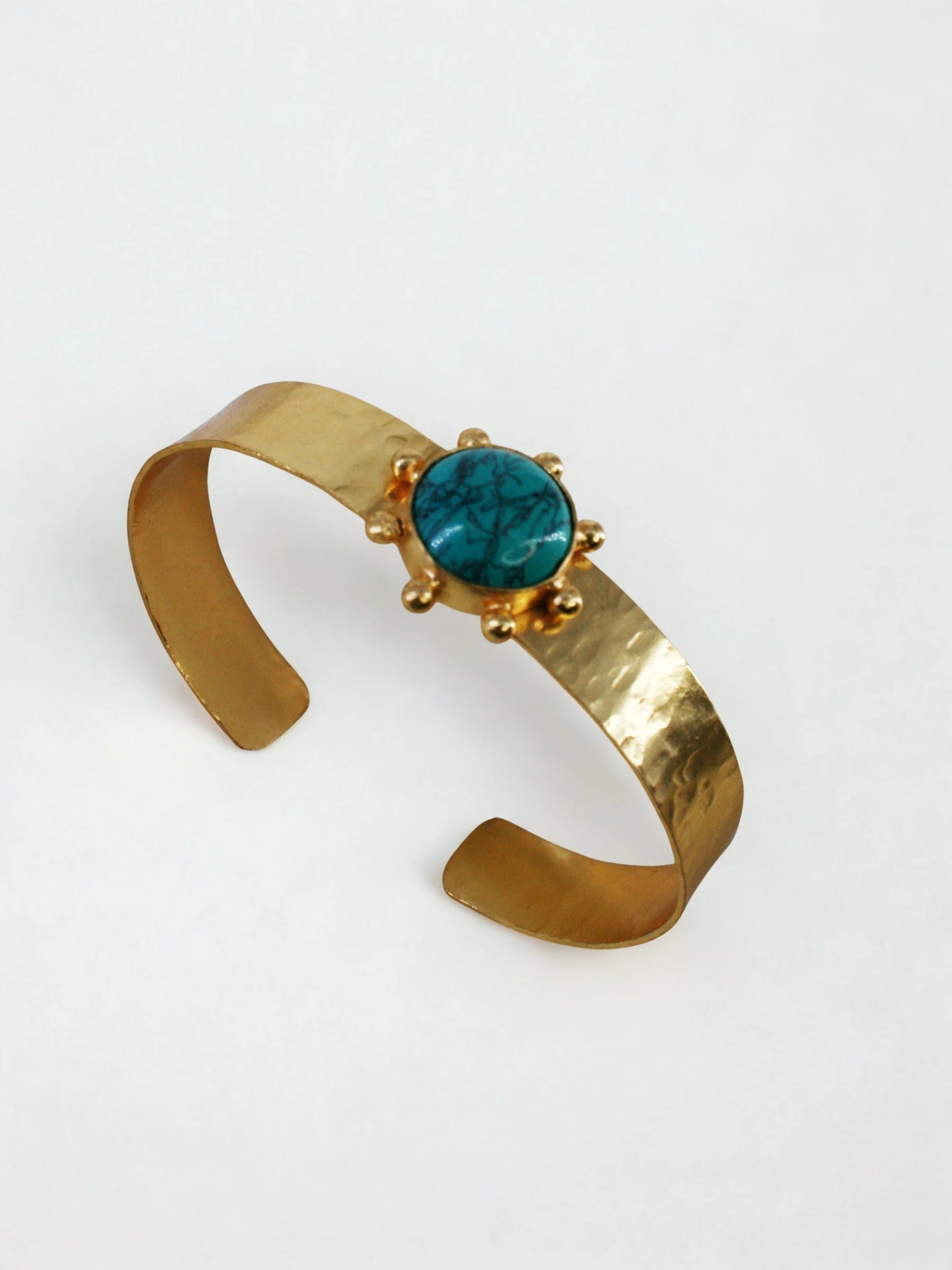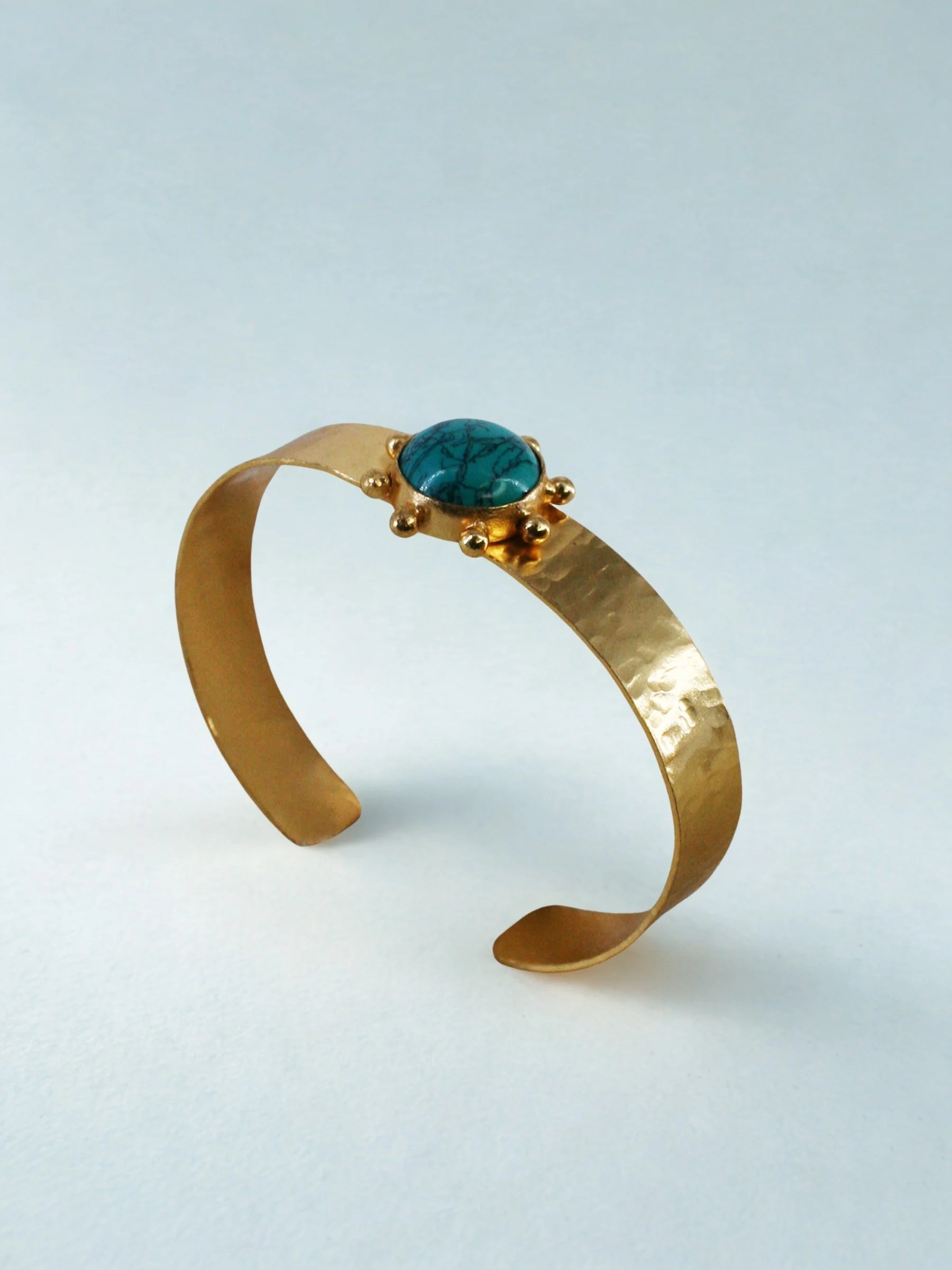 Handcrafted in recycled brass and finished with radiant 18K gold plating, the Halo Arches Bracelet features a broad, hand-beaten band centered with a turquoise-green stone. Radiating mini ball spokes encircle the stone like a luminous halo, creating a striking interplay of texture, light, and sculptural form. Bold yet refined, it is a modern heirloom that channels celestial energy through artisanal craft.