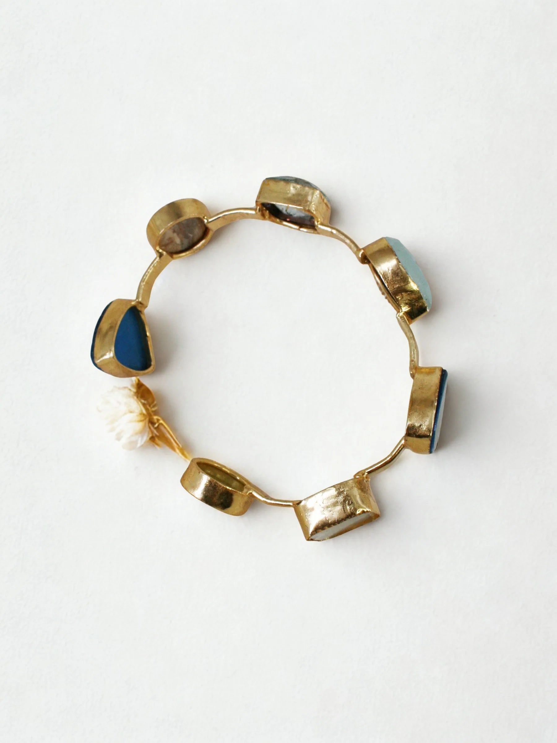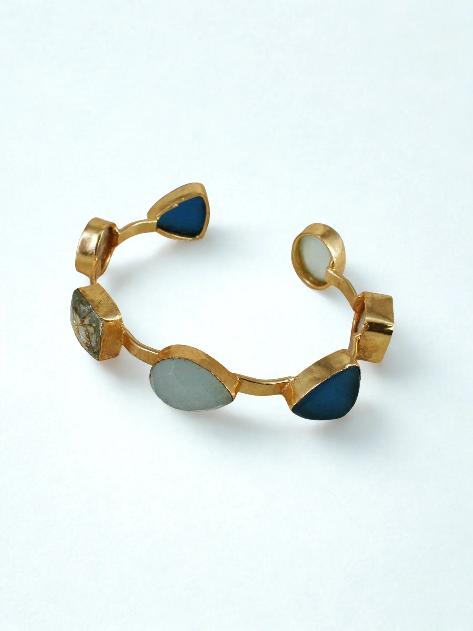 Handcrafted in recycled brass and finished with luminous 18K gold plating, the Halo Verge Bracelet links a series of raw, naturally shaped stones along a sleek metal strip for a striking fusion of rugged texture and refined form. Each stone is spaced organically, creating a halo-like rhythm of color and light across the wrist. A sculptural modern heirloom that blends Art Deco restraint with the elemental beauty of untouched minerals.