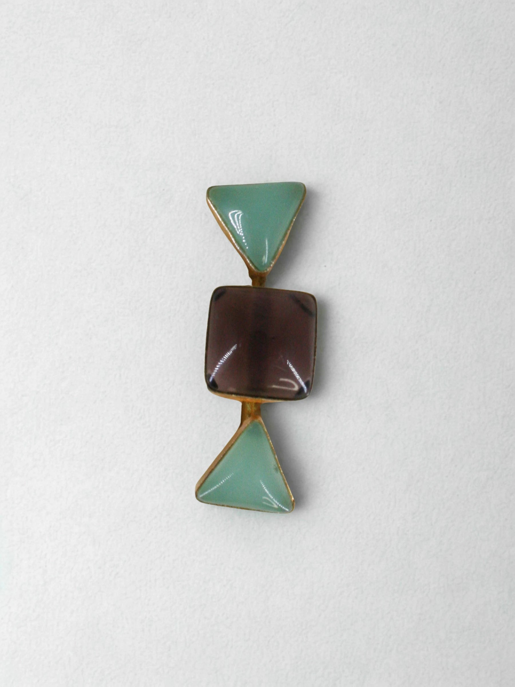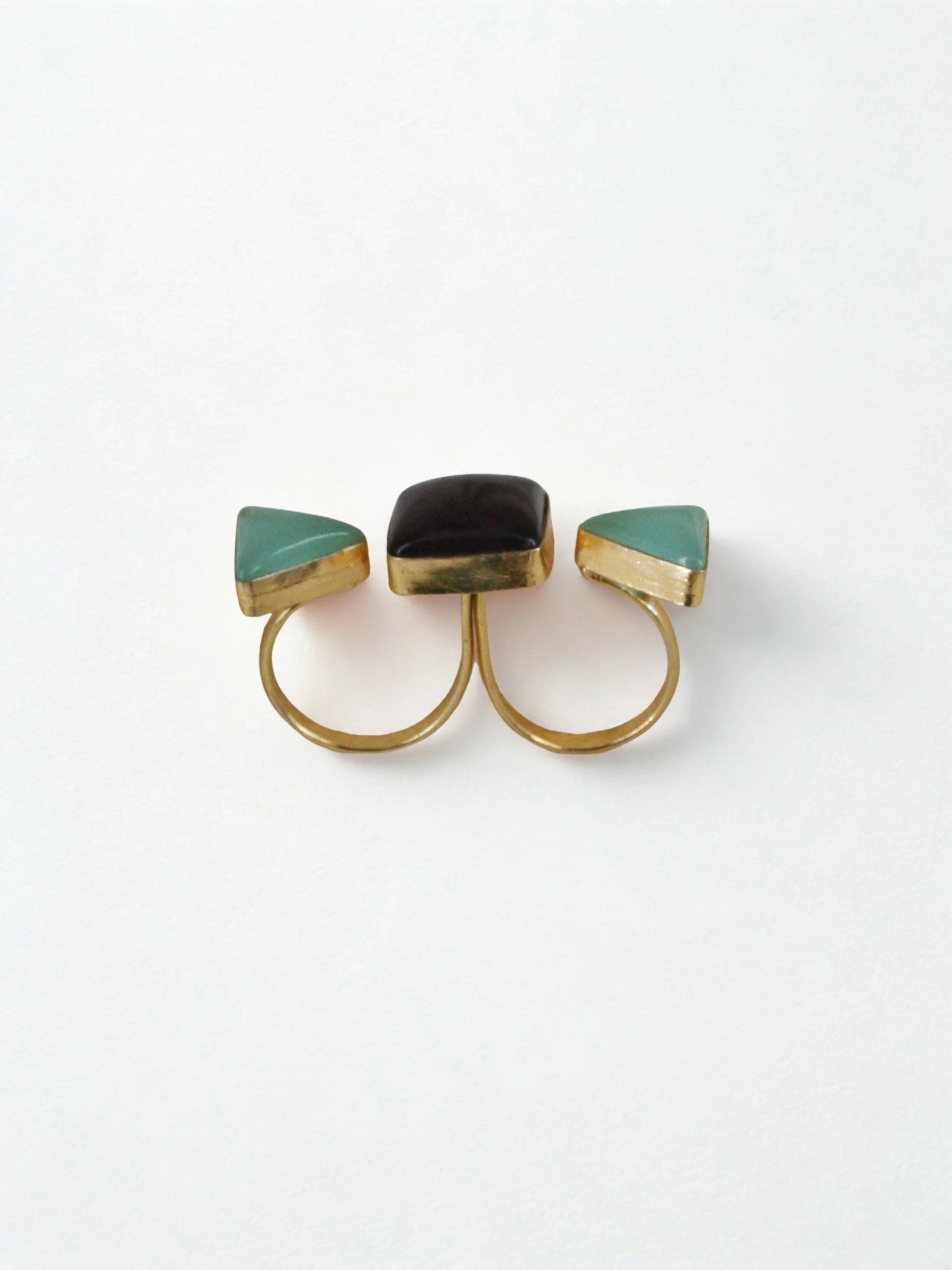 Handcrafted in recycled brass and finished with luminous 18K gold plating, the Halo Verge Twin Finger Ring spans two fingers in a sleek, effortless silhouette. Three spaced raw stones crown the top, creating an organic constellation of colour and texture that transforms the hand into a sculptural landscape. Bold, modern, and artfully unconventional — a striking heirloom for the aesthete who collects beauty in unexpected forms.