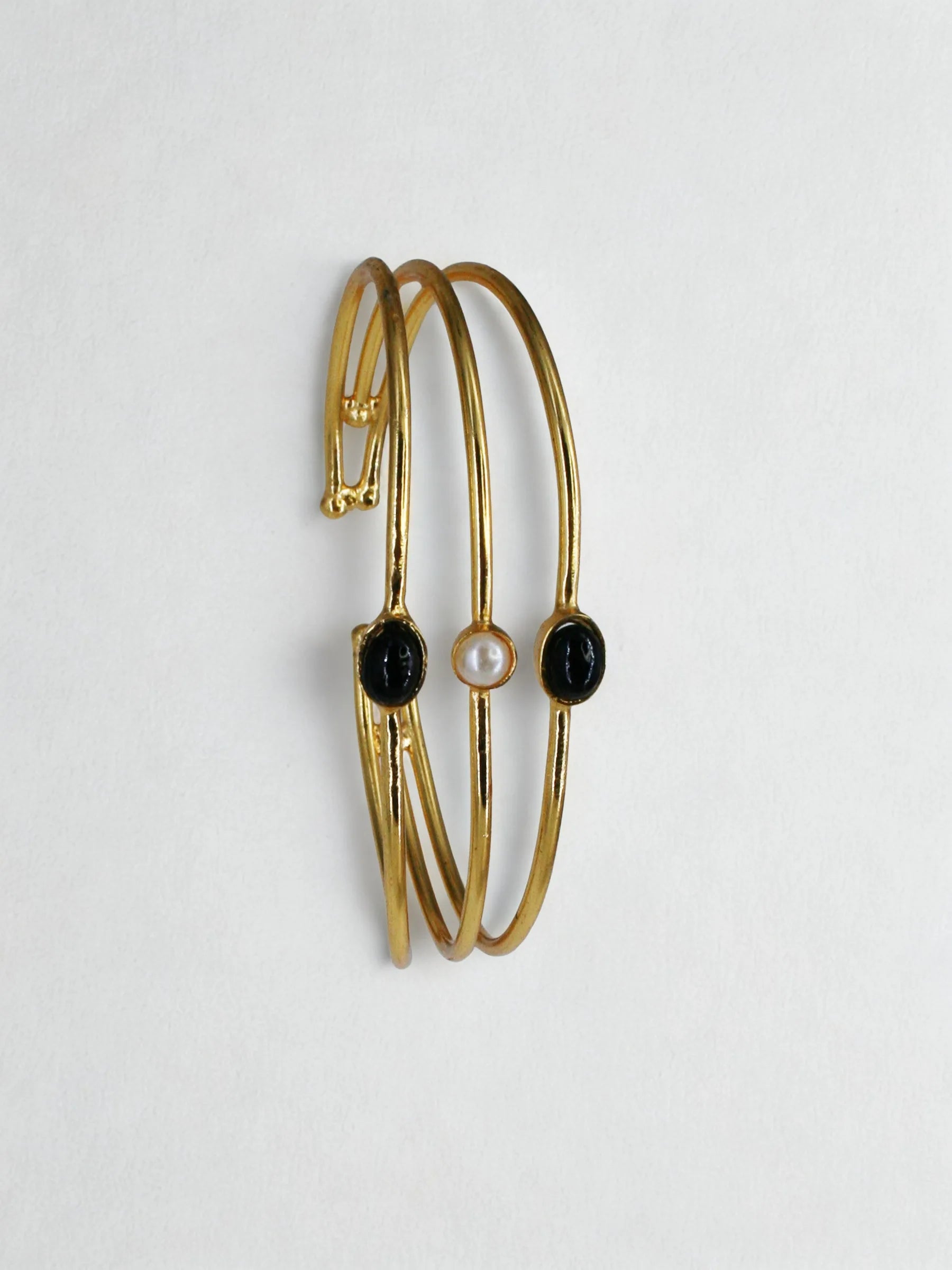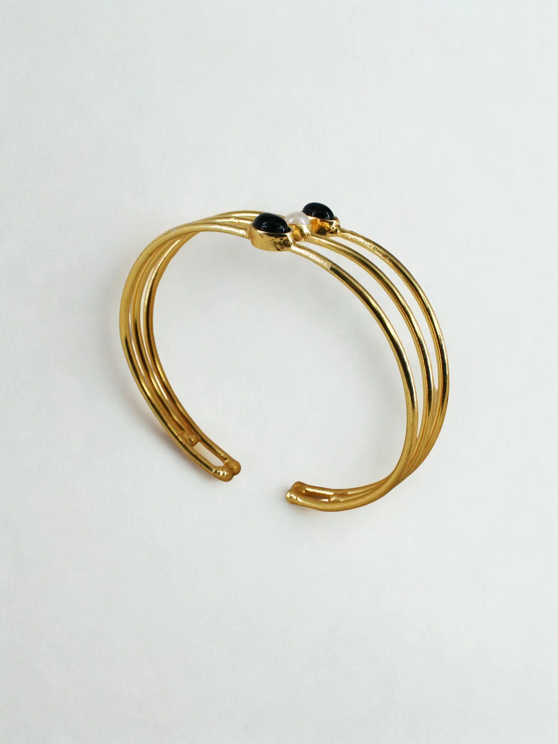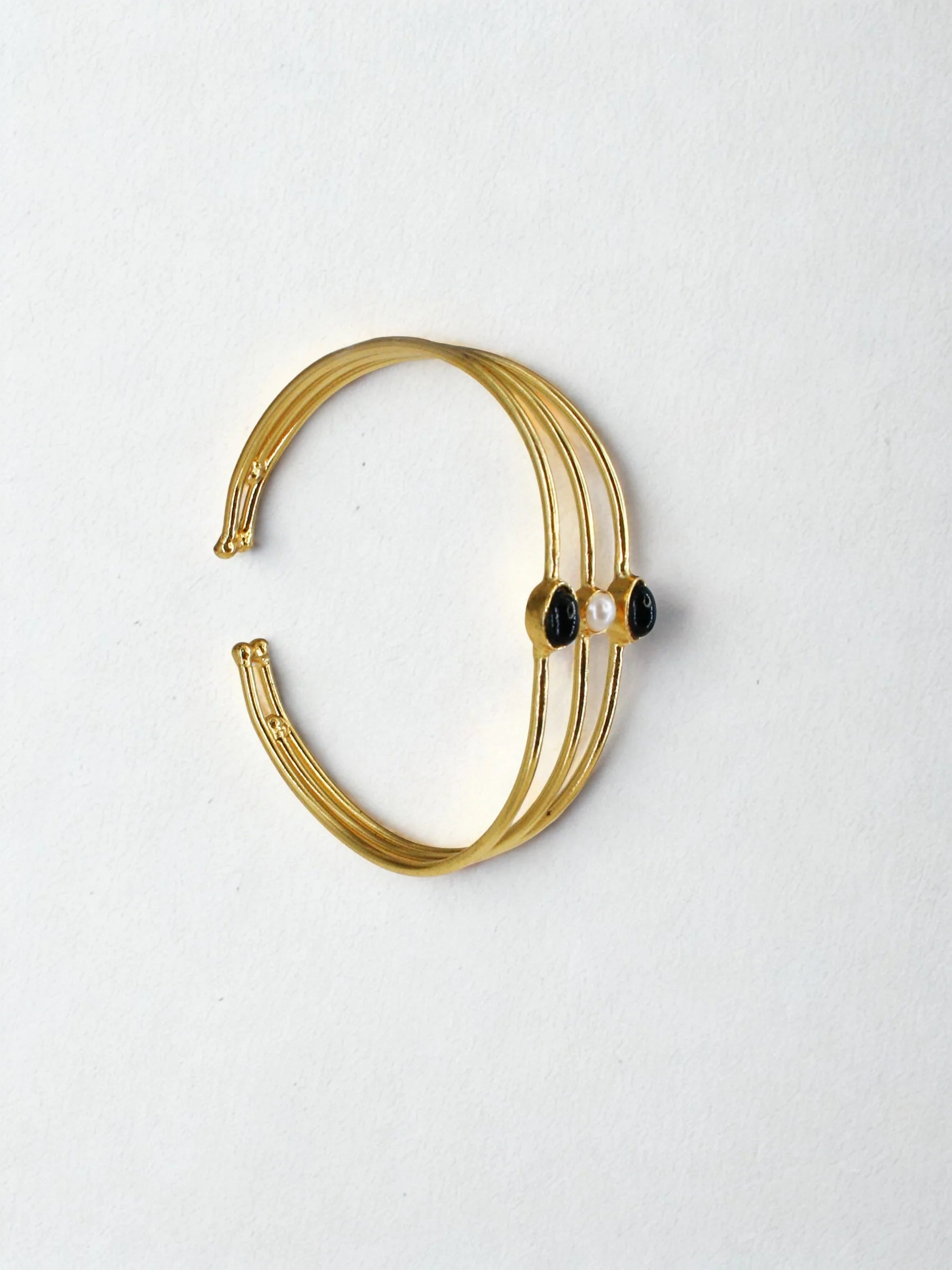 Handcrafted in recycled brass and finished in luminous 18K gold plating, the Illume Twist Bracelet features three sleek wire bands, each accented with a tiny central bead for subtle radiance. Minimal, modern, and effortlessly elegant, it captures the quiet glow of Deco Luméaura through clean lines and refined restraint. A timeless everyday heirloom for the contemporary aesthete.