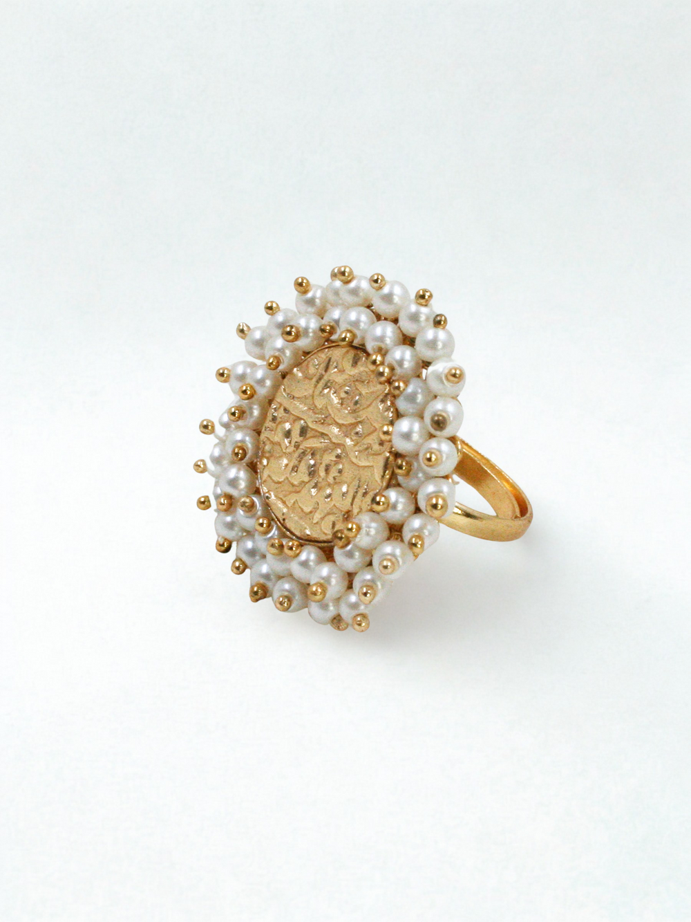 A modern relic of the Indus Valley, this ring features a recreated ancient coin encircled by a delicate halo of hand-strung pearls. Handcrafted in mixed metals and finished with 18K gold plating, it balances archaeological charm with contemporary elegance. A timeless statement of heritage, reimagined for today.