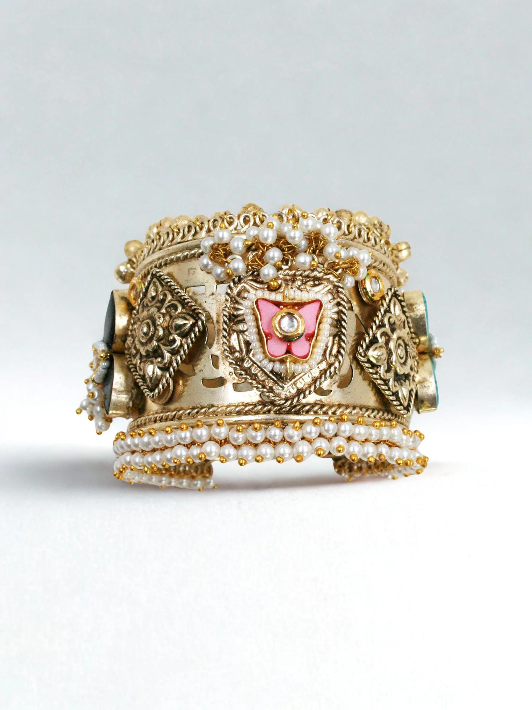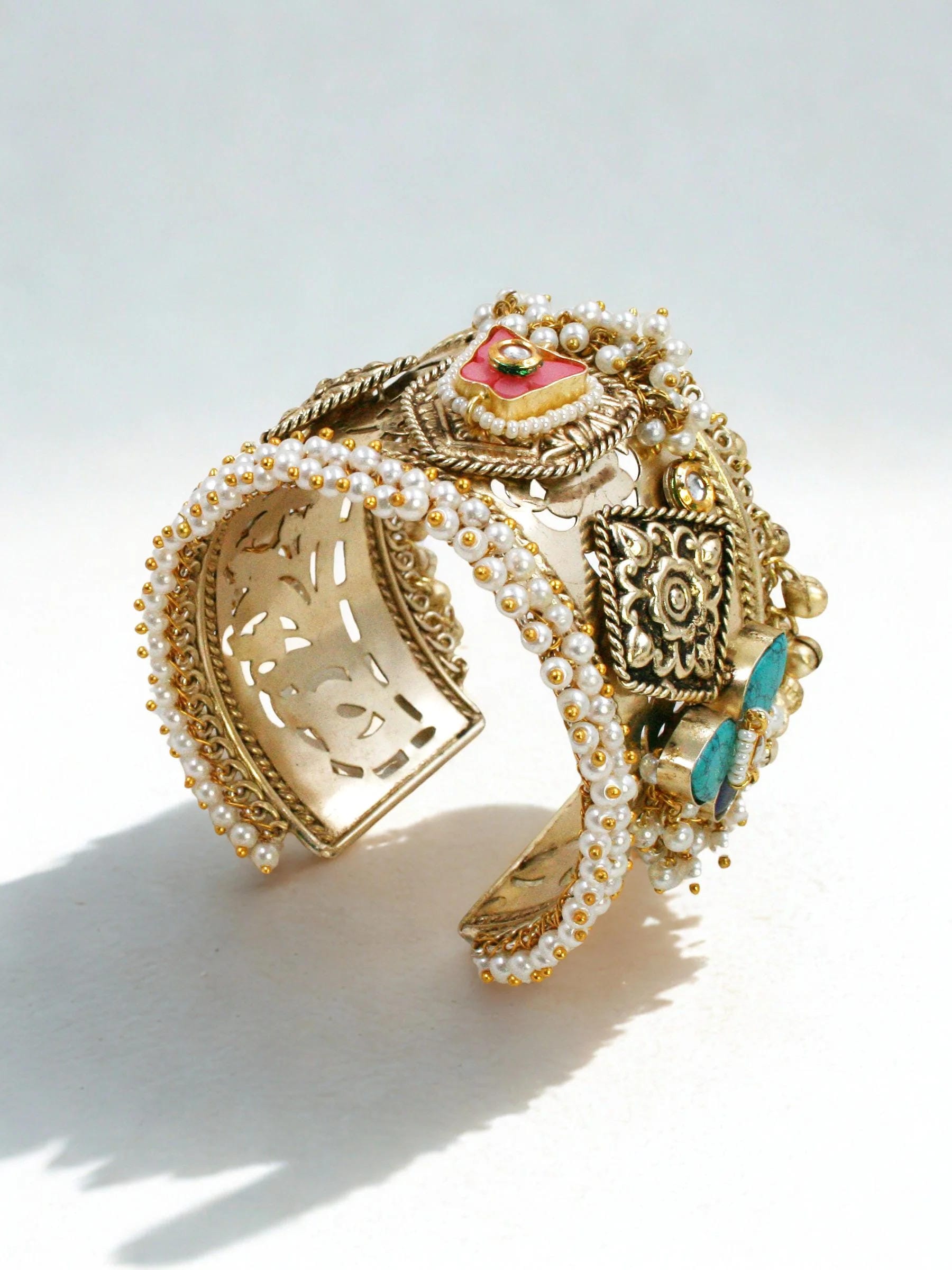 A bold reinterpretation of heritage, this fusion kadda reimagines traditional Kundan artistry through a contemporary lens. Each curve and contour draws from the vibrant spirit of Indian festivals—where rhythm, ritual, and radiance converge. Handcrafted in mixed metals and plated in 22K gold, the piece becomes a travelogue through folklore, time, and cultural memory — told through the timeless language of jewels. An ode to the hands that shape it and the stories it carries forward.