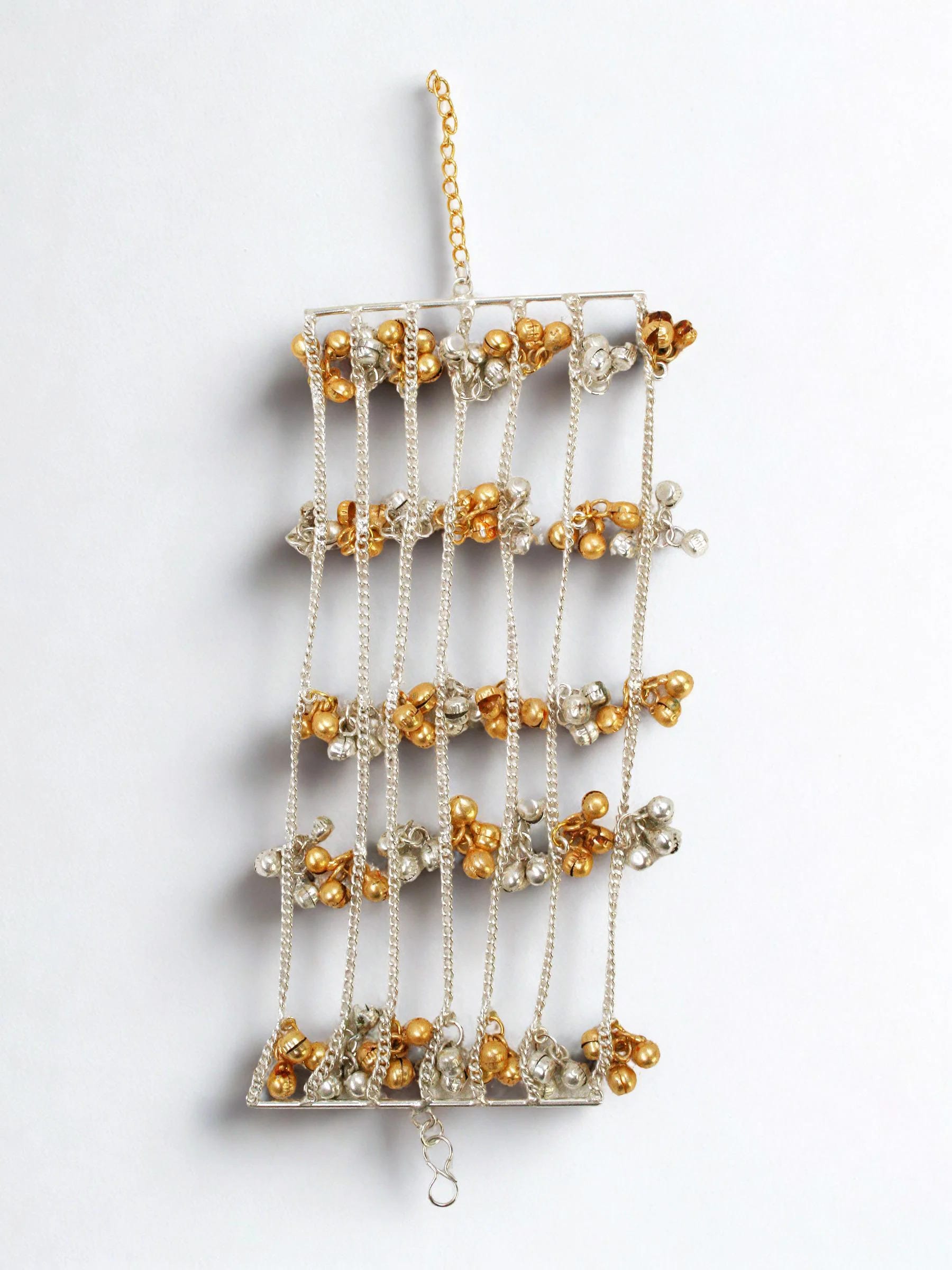 A lyrical blend of tradition and rhythm, this delicate bracelet brings together tones of silver and gold in perfect harmony — a Ganga-Jamuna symphony. Tiny ghungroos dance with every movement, echoing the music of Indian heritage and artisanal finesse. Light, fluid, and full of spirit, it celebrates duality — where two rivers, two metals, and two worlds meet in timeless grace.