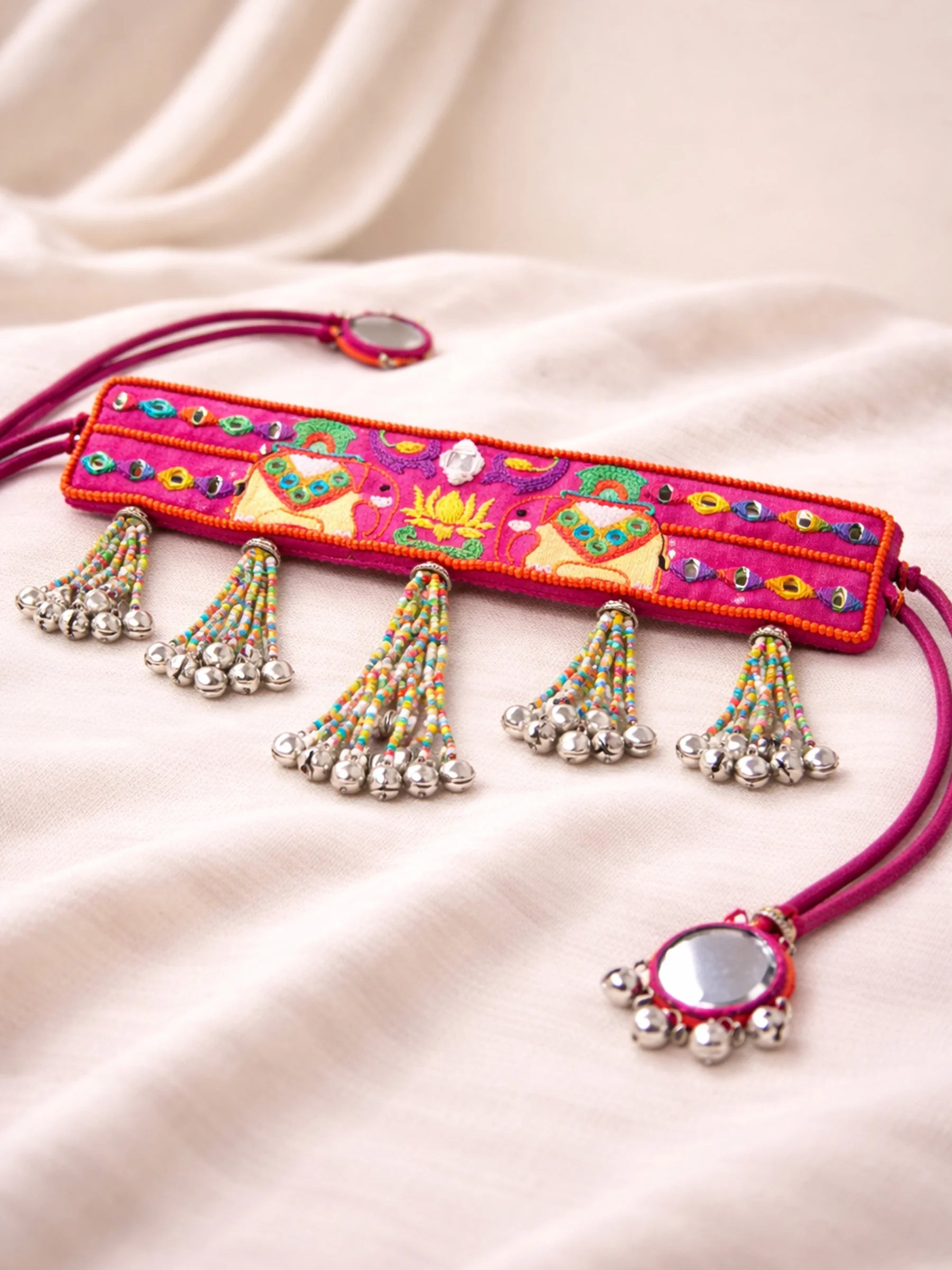 Deep-toned and regal, this Kokum choker features a structured elephant motif with layered embroidery and dense bead embellishment. Designed for evening grandeur and festive opulence. Hand embroidered with fine bead clusters, mirror accents and gungroos, the Gaj motif stands bold yet playful.