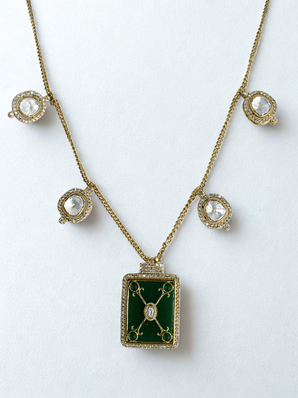 A refined interplay of modern geometry and traditional craft, this pendant features a vivid emerald-green stone framed in a sleek Art Deco setting with delicate fusion kundan accents. Handcrafted in recycled metal and plated in 18K gold, its petite silhouette offers quiet sophistication — luminous, sculptural, and timelessly elegant. A piece that brings together heritage and modernity with effortless grace.