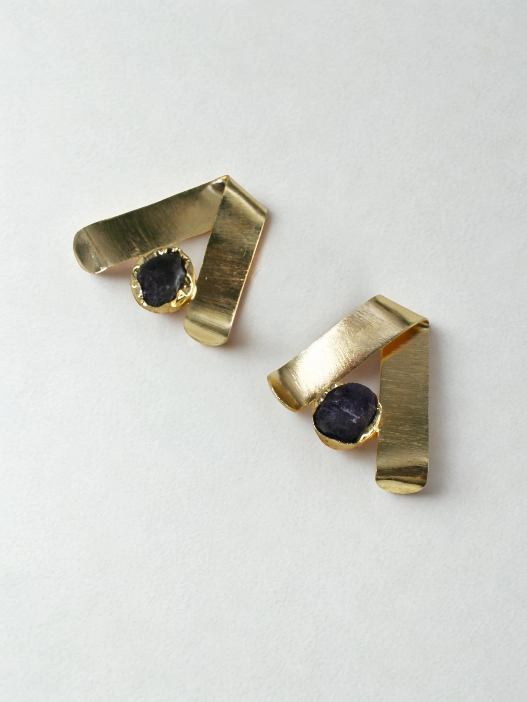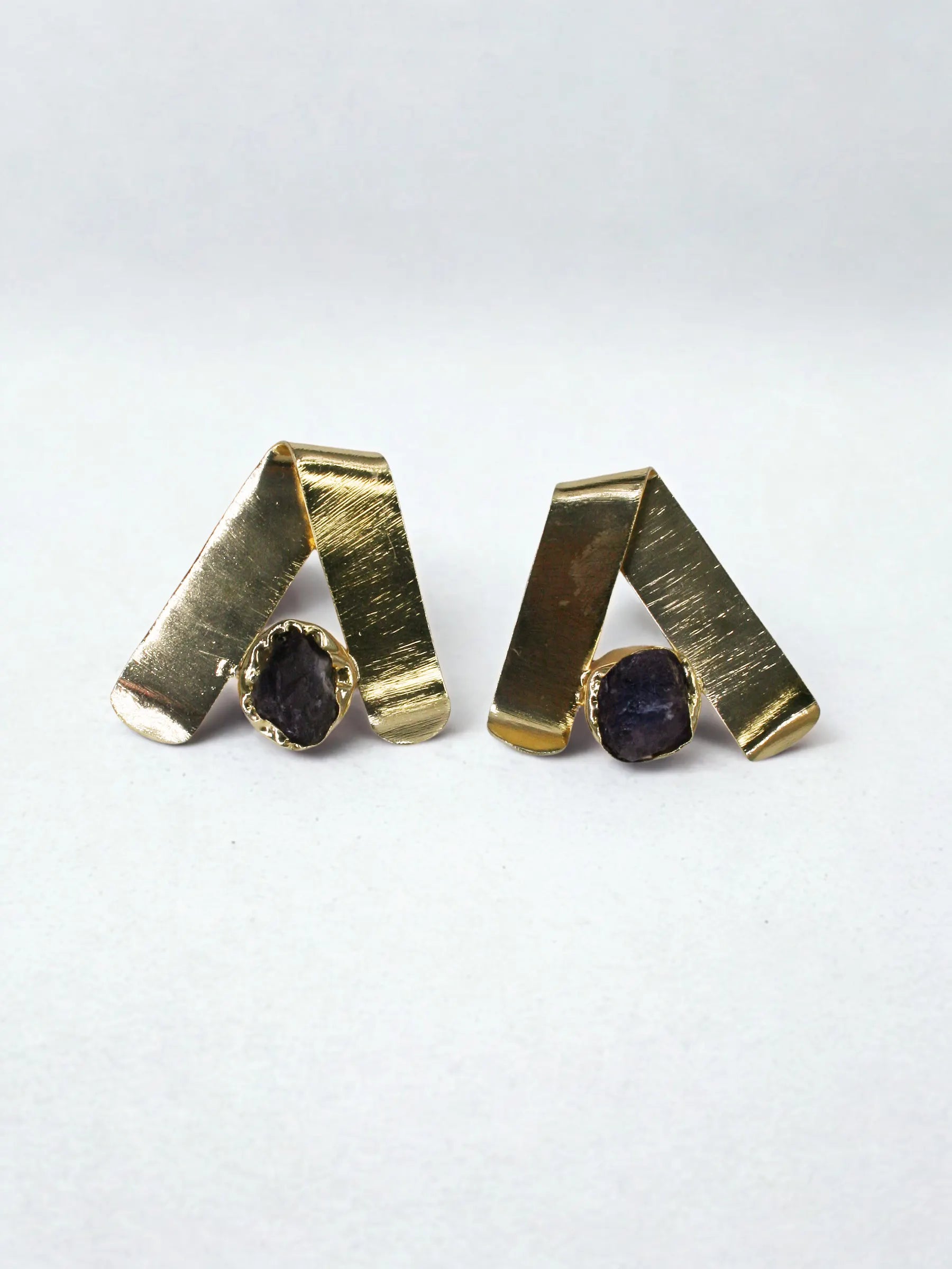 Handcrafted in recycled brass and finished with radiant 18K gold plating, the Ladakh Rays Earrings feature a broad metal sheet folded like a sculptural ribbon, centered with a raw stone that echoes the rugged glow of high-altitude terrain. The interplay of sharp folds and organic mineral texture creates a striking contrast — bold, elemental, and quietly luminous. A modern heirloom shaped by the landscapes of Ladakh and the hands of master artisans.