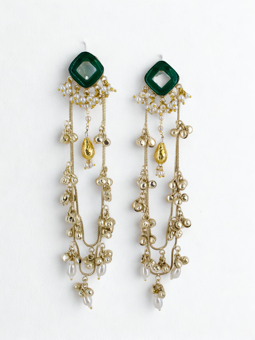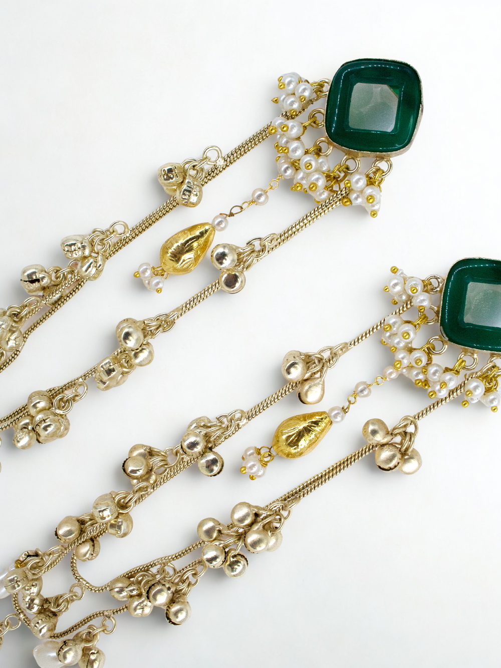 A modern interpretation of Ladakhi mountain adornments, these earrings pair a vivid emerald-green square stone with cascading golden ghungroo chains for lyrical, fluid movement. Handcrafted in recycled metal and plated in 18K gold, the design blends rugged Himalayan charm with refined contemporary elegance — sculptural, vibrant, and quietly opulent. A striking fusion piece for those who love tradition reimagined through a modern lens.