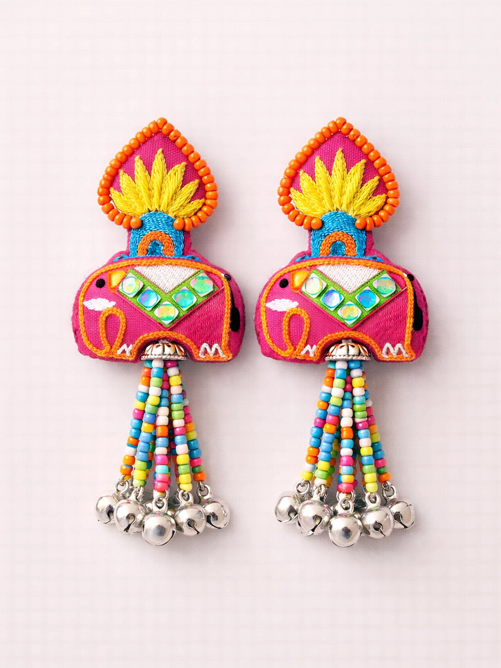 Inspired by celebratory sweets, this warm yellow Gaj earring radiates joy. The embroidery glows in festive tones, accented with mirror elements that catch light beautifully. Playful yet rooted in tradition.