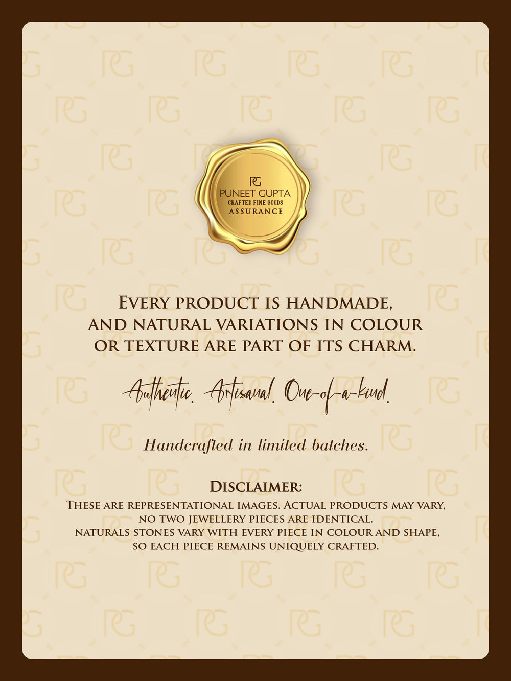 | Additional Information | All PG Crafted Goods are manufactured using premium materials and strict quality control processes. In case of any issues, please reach out to our customer care at info@puneetgupta.in or call 9911116743. Keep the product in a cool, dry place away from direct sunlight. |
