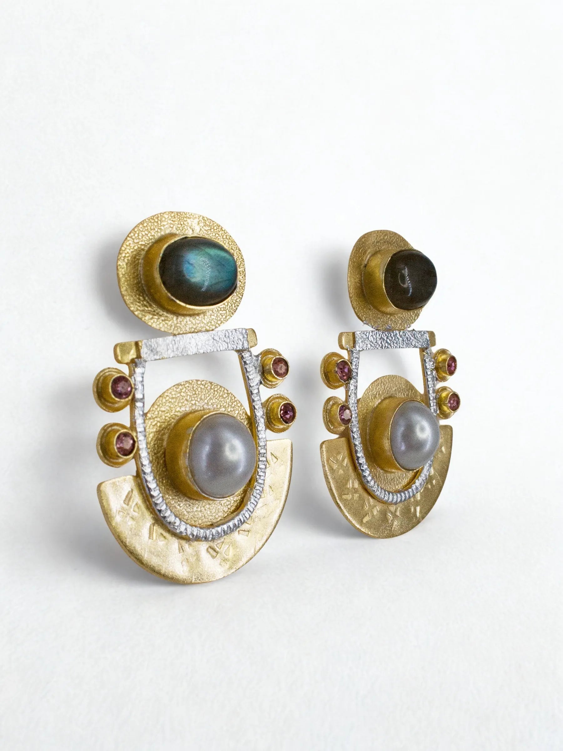 Handcrafted in recycled brass and finished with luminous 18K gold plating, the Lucent Links Earrings weave mixed metal shapes and sculptural stones into an abstract Art Deco silhouette. Their geometric interplay creates a rhythm of light and form, striking a balance between structure and fluidity. A bold yet refined modern heirloom — expressive, architectural, and unmistakably handcrafted.