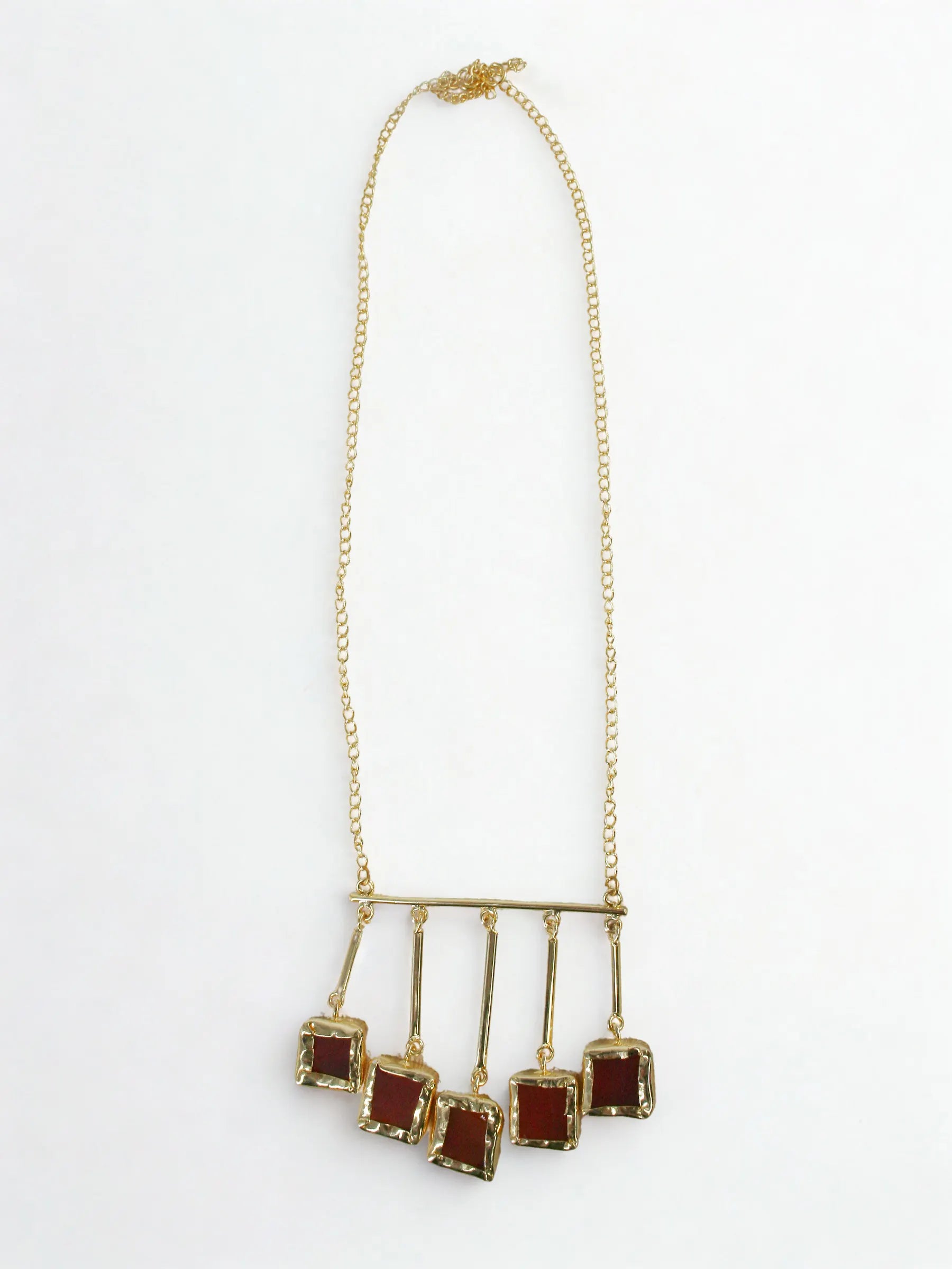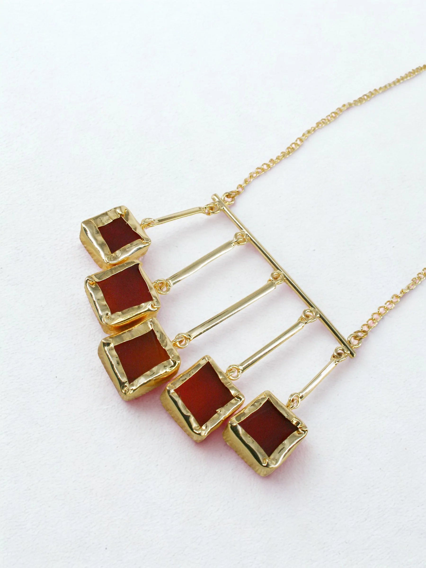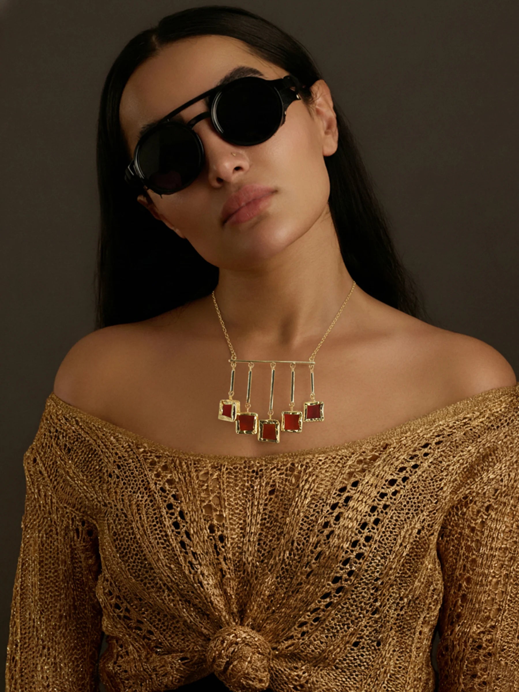 Handcrafted in recycled brass and finished with radiant 18K gold plating, the Lumière Cascade Sunset Necklace features cascading strands of deep red stones that evoke the glowing descent of a mountain sunset. Each hanging piece catches light with quiet movement, creating a warm, luminous rhythm against the neckline. A modern heirloom that channels twilight’s fire through sculptural, handcrafted elegance.