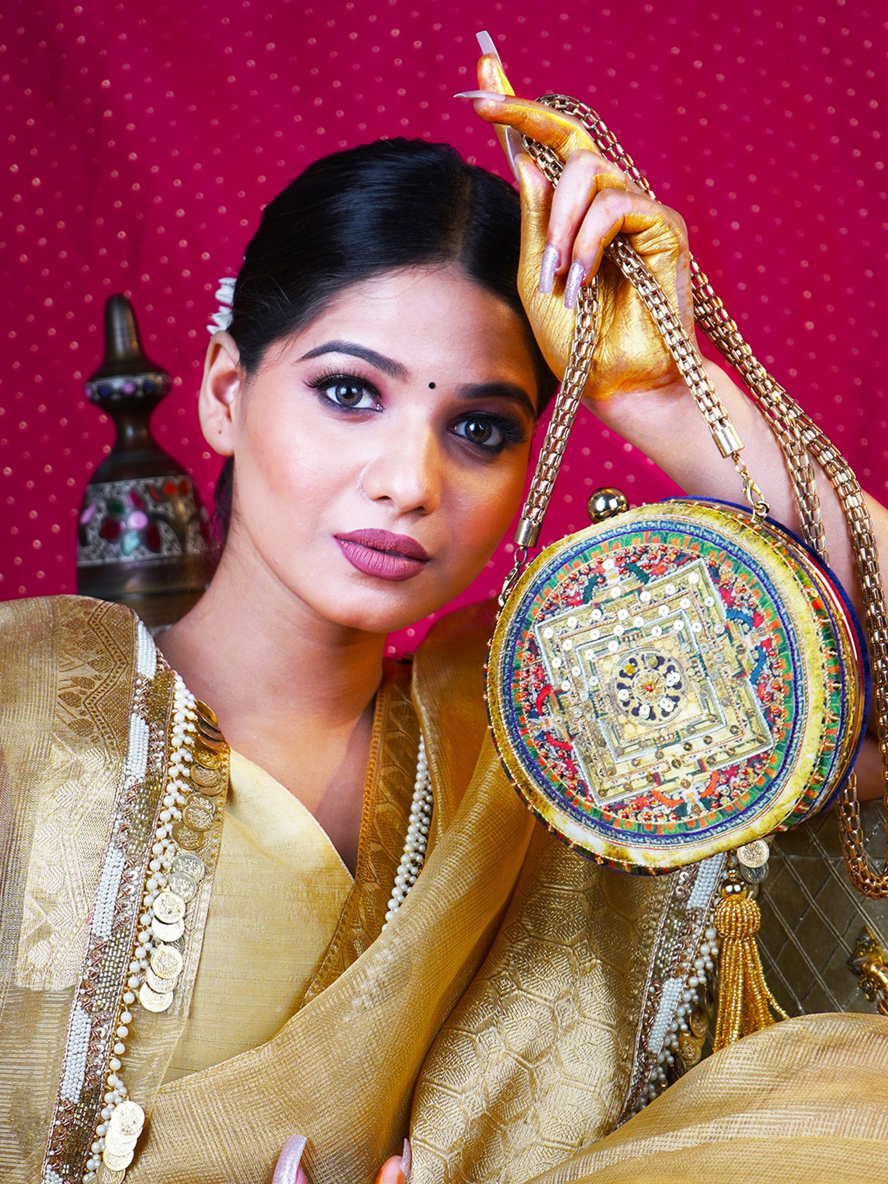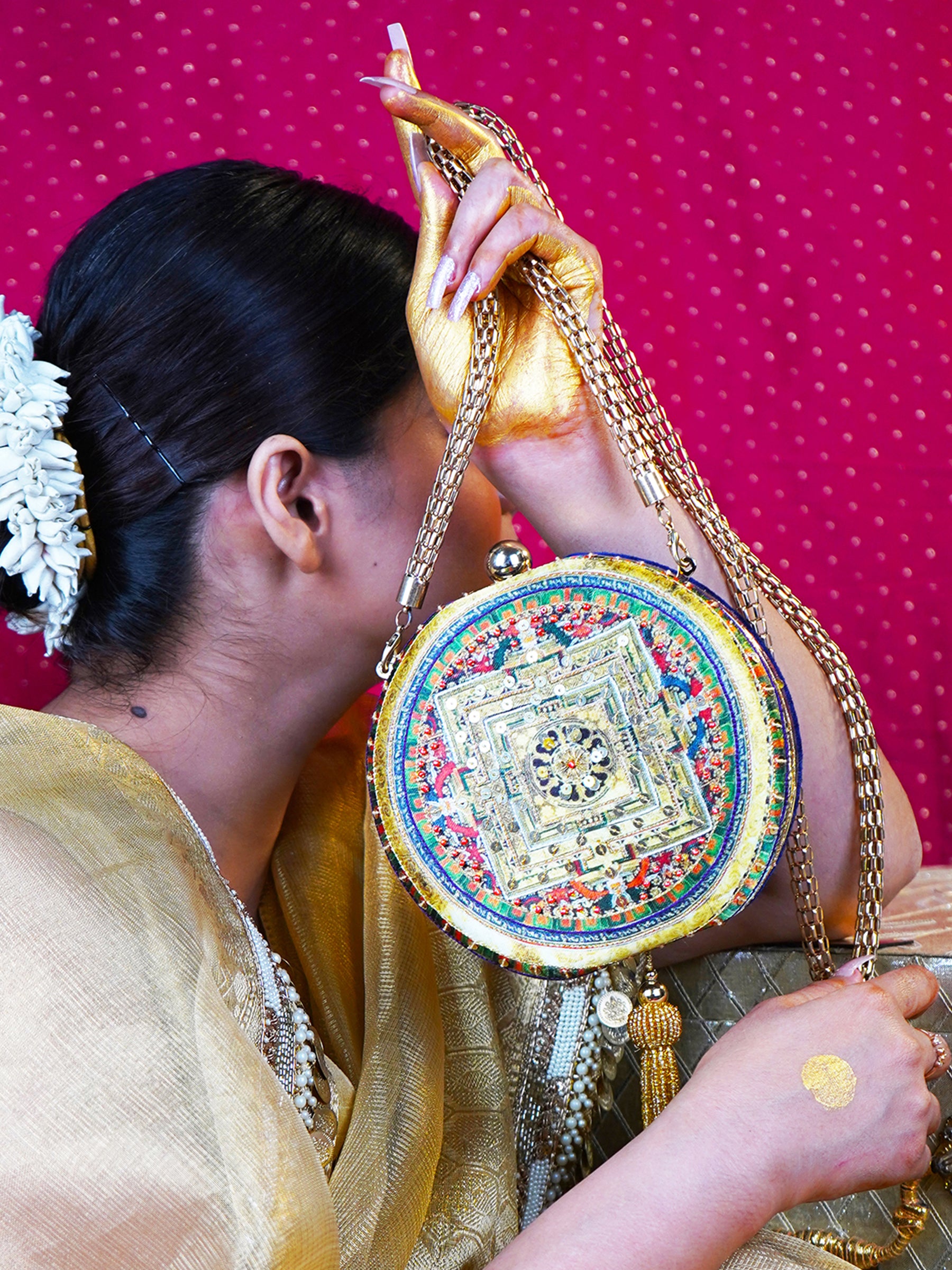 Adorned with opulent golden zari hand embroidery and shimmering silver sequins, this clutch showcases a mesmerizing royal mandala design. Its circular shape, inspired by the grandeur of Indian tradition, pays homage to the timeless artistry that has been cherished for centuries.