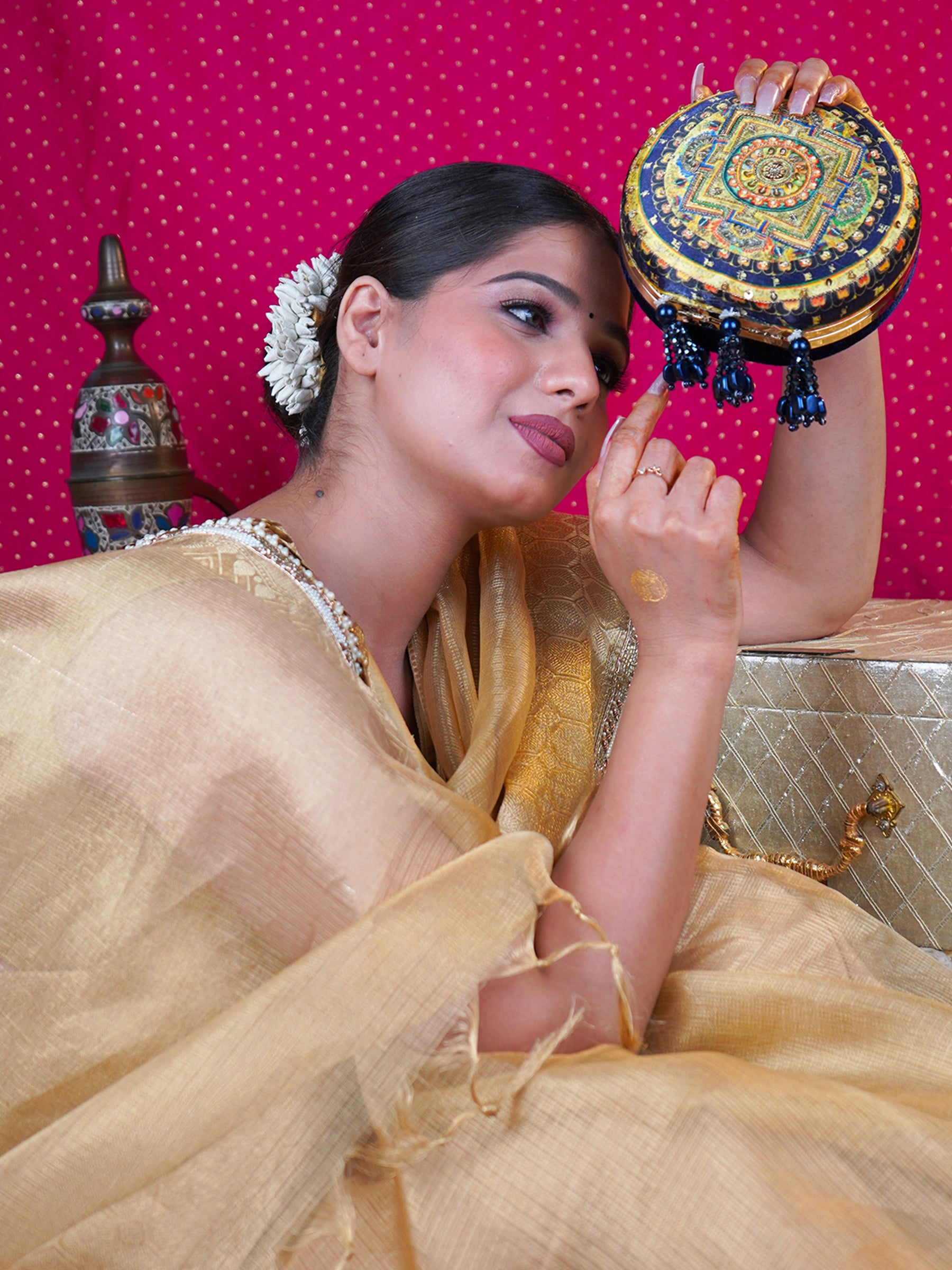 Prepare to be captivated by the "Mandala Neel Clutch," a masterpiece that embodies opulence, sensuality, and intricate artistry inspired by Indian mandalas. Crafted from the most luxurious blue silk, this clutch is a tapestry of celestial beauty, adorned with enchanting golden zari hand embroidery and glistening silver sequins.