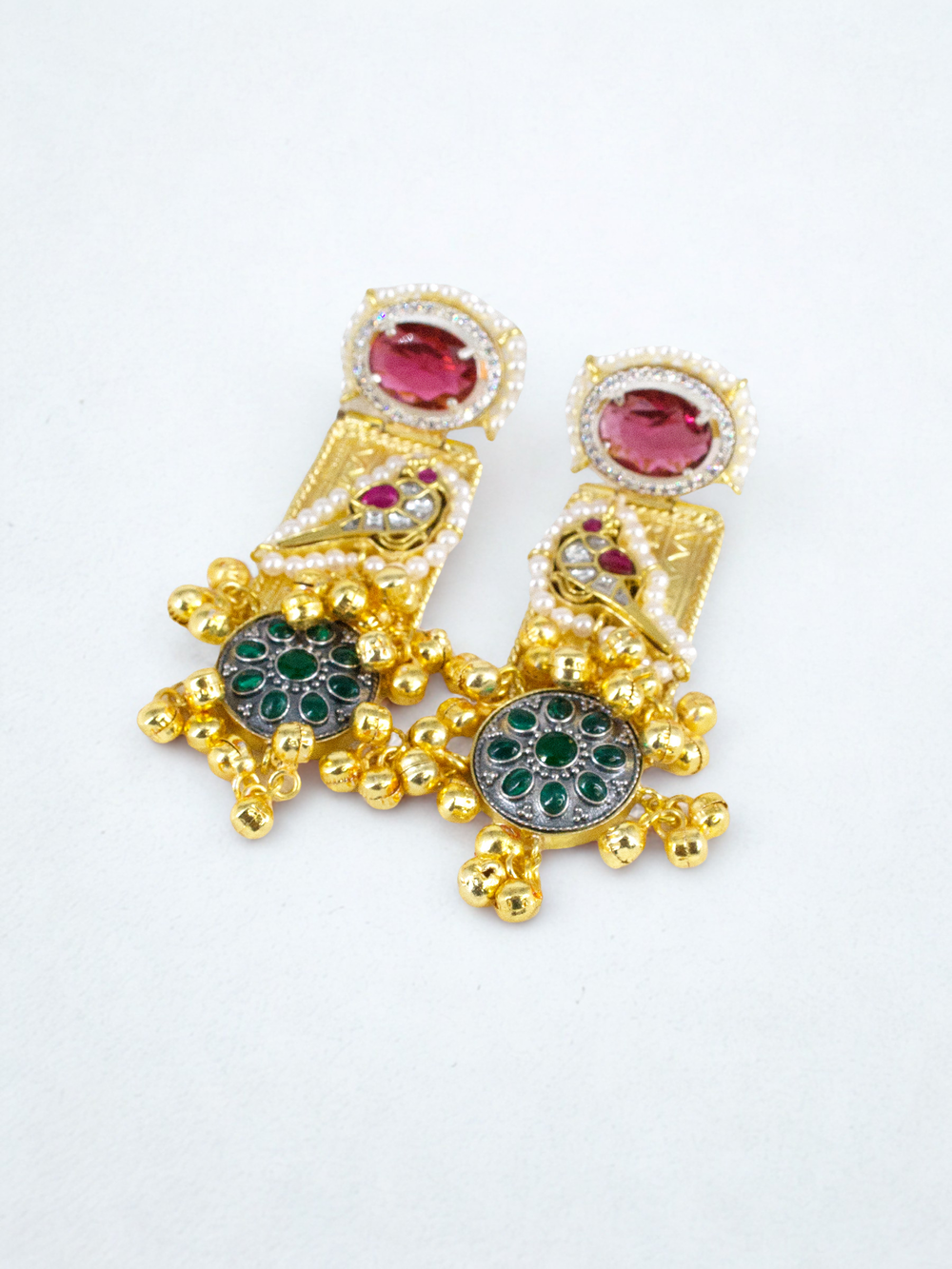 A bold reimagining of classical artistry, the Maytheli Kundan Earrings blend Tanjore-inspired opulence with the luminous charm of traditional kundan work. Set upon a richly textured repoussé base, the abstract fusion silhouette feels both sculptural and fluid, handcrafted in recycled metal and finished with radiant 18K gold plating. With their striking form and refined detailing, these earrings embody a fearless modern aesthetic while honouring the depth of Indian craft — expressive, ornate, and exquisitely contemporary.