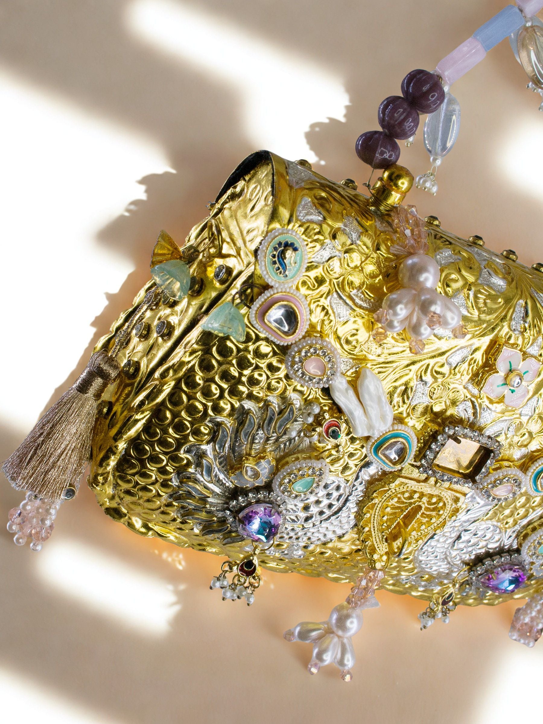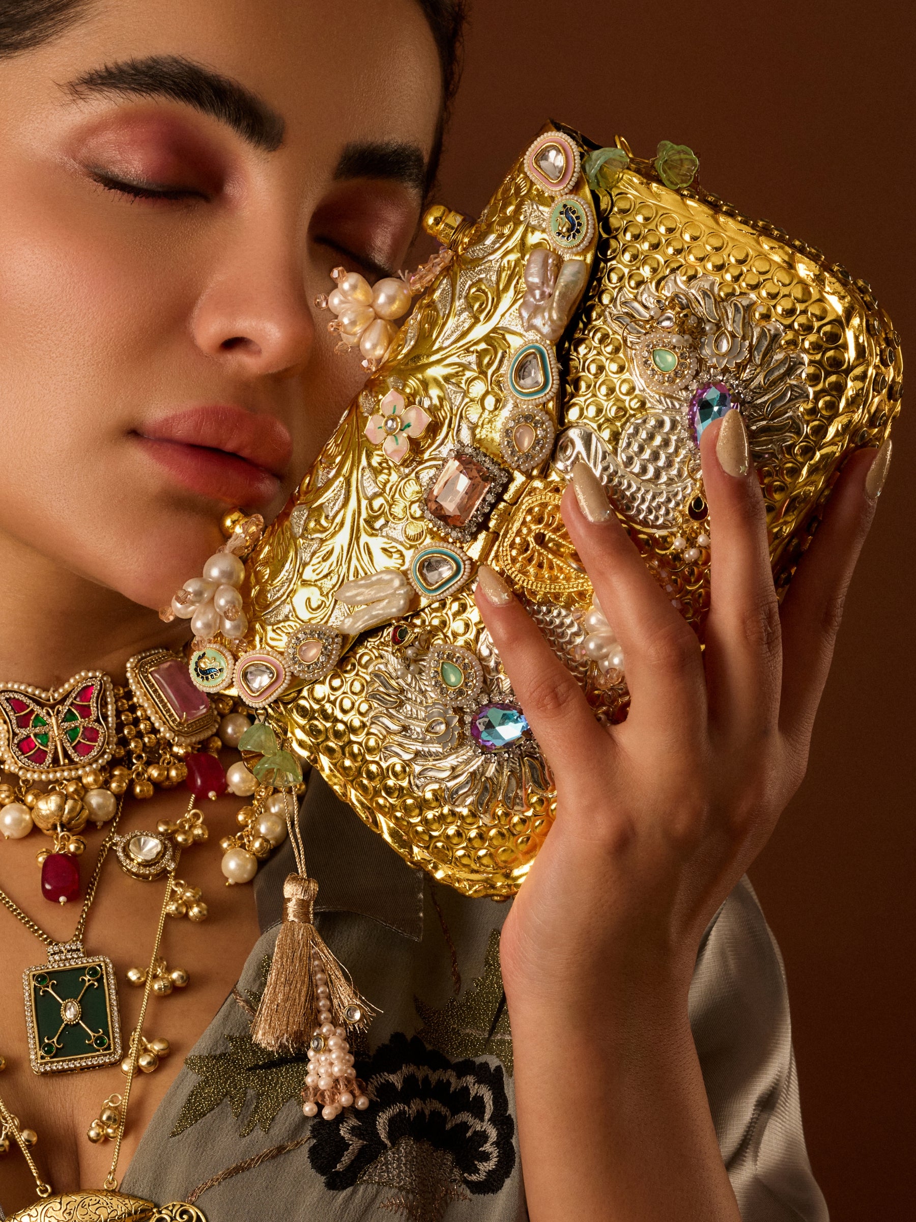 Gilded Folklore draws inspiration from the folklore of Mewar, the gilded romance of Jaipur, and the interwoven textiles of Gujarat, creating a tapestry of story, color, and cultural memory. Bags shimmer with hand-blown beads, gilded details, and gemstone hues— producing pieces that are timeless, versatile, and profoundly expressive. This collection invites collectors to slow down and savor beauty, carrying not just an accessory but a legacy of artistry, resilience, and cultural memory. For the modern Maharani, Gilded Folklore offers treasures that are enduring, enchanting, and heirlooms for today — stories for tomorrow.