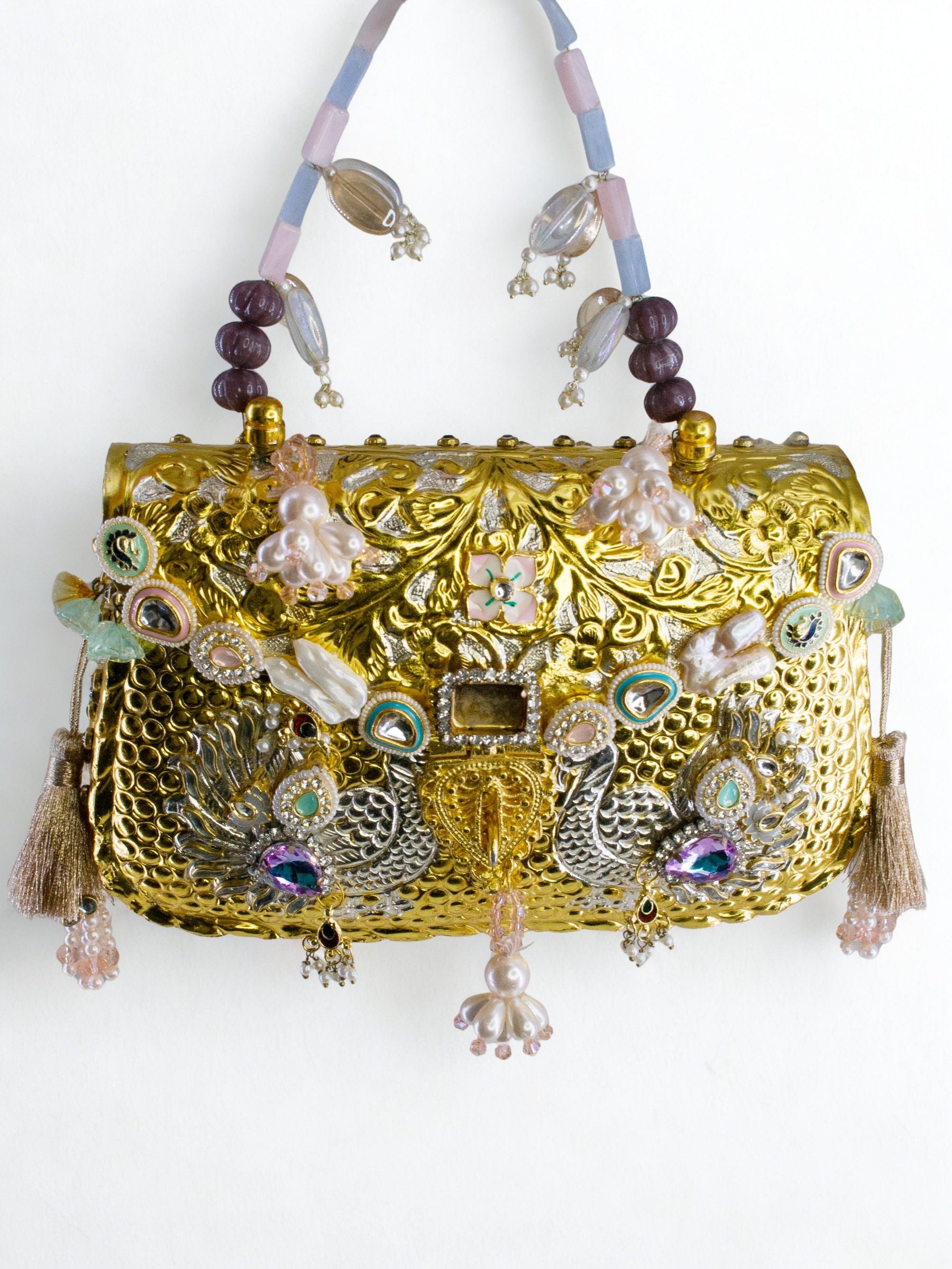 An ode to eternal grace, the Mayura Mahal Bag captures the poetic beauty of peacocks in repose artistry. Each side features a delicately hand-embossed peacock, highlighted with soft pastel enamel and jewel-toned accents that evoke vintage palace frescoes. Gentle pearl hangings sway like whispers of royalty, while the handle — strung with semi-precious carved amethyst beads and handmade details — adds a regal, tactile charm. Dreamy, feminine, and timeless, Mayura Mahal is a jewel-box of heritage reimagined for the modern connoisseur.