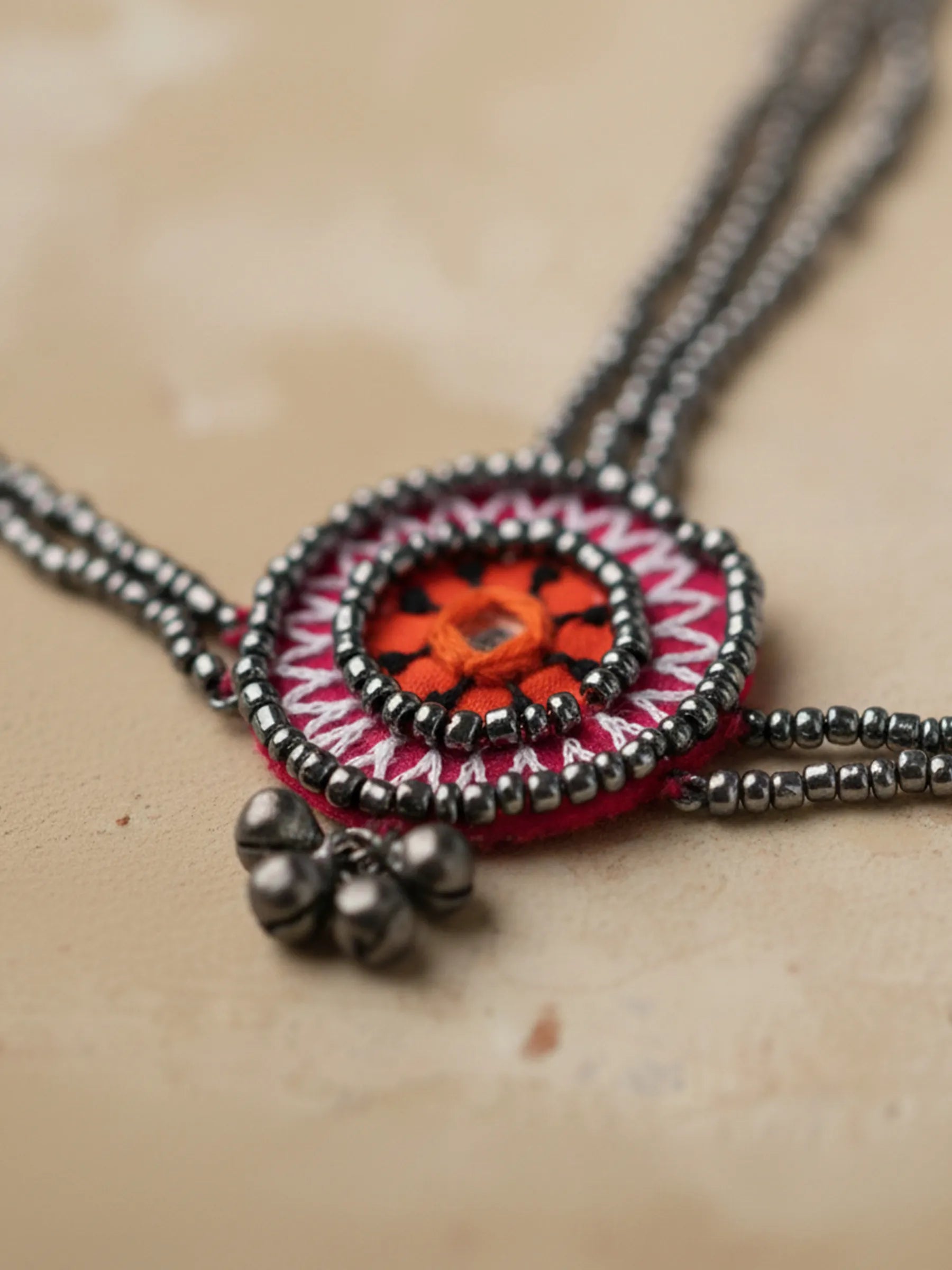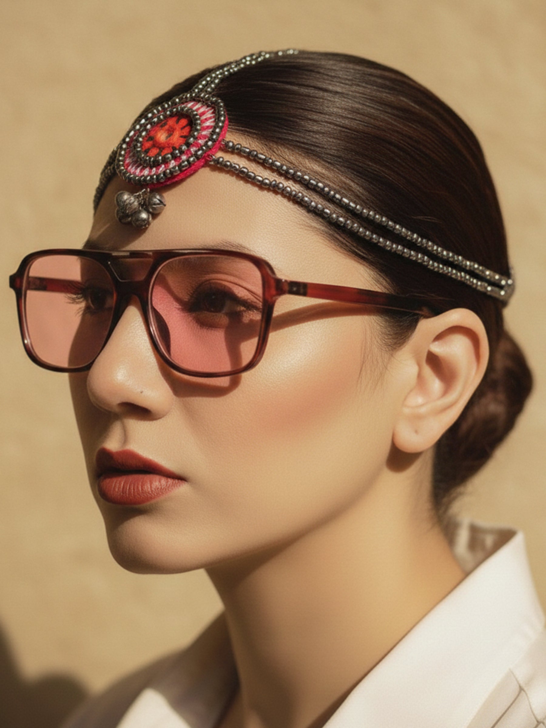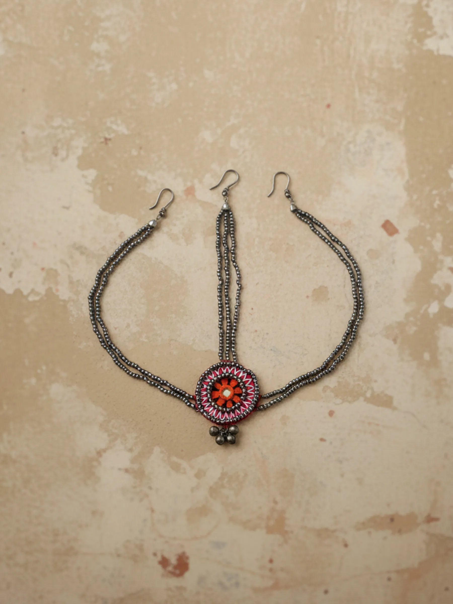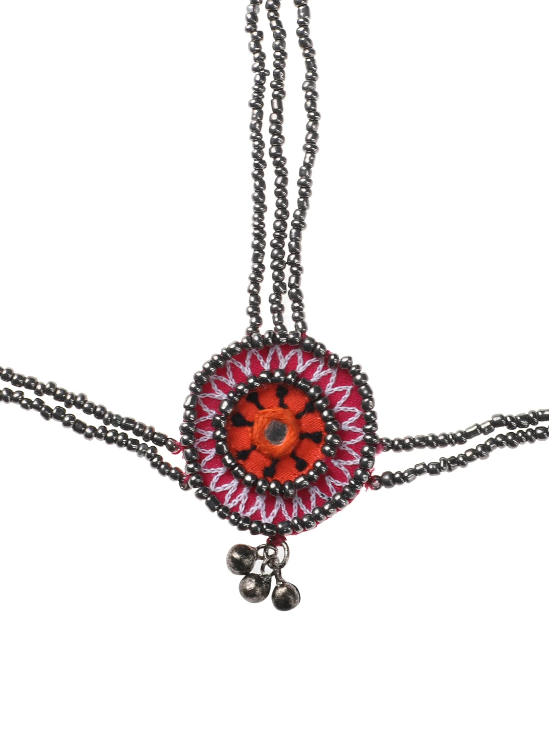 A festive headpiece that blends mirror accents with layered gunmetal grey beadwork and oxidised ghungroo detailing. The mirror adds brightness at the center, while the grey beads and suspended ghungroos introduce depth, texture and celebratory movement. Balanced between playful and bold, it captures the spirit of a vibrant mela.