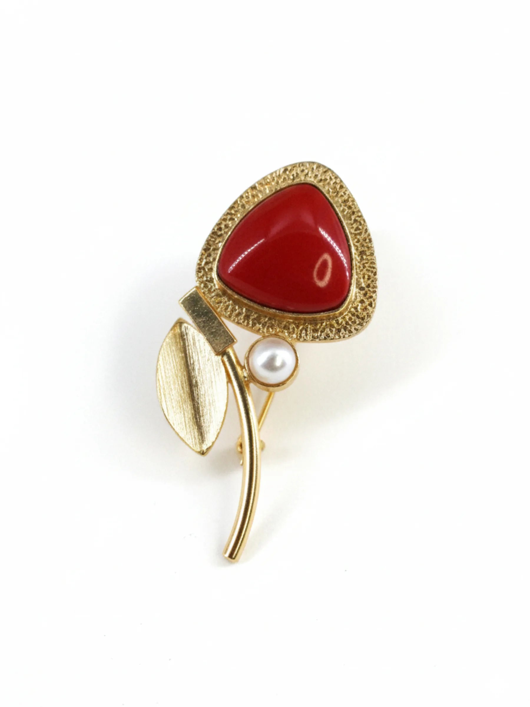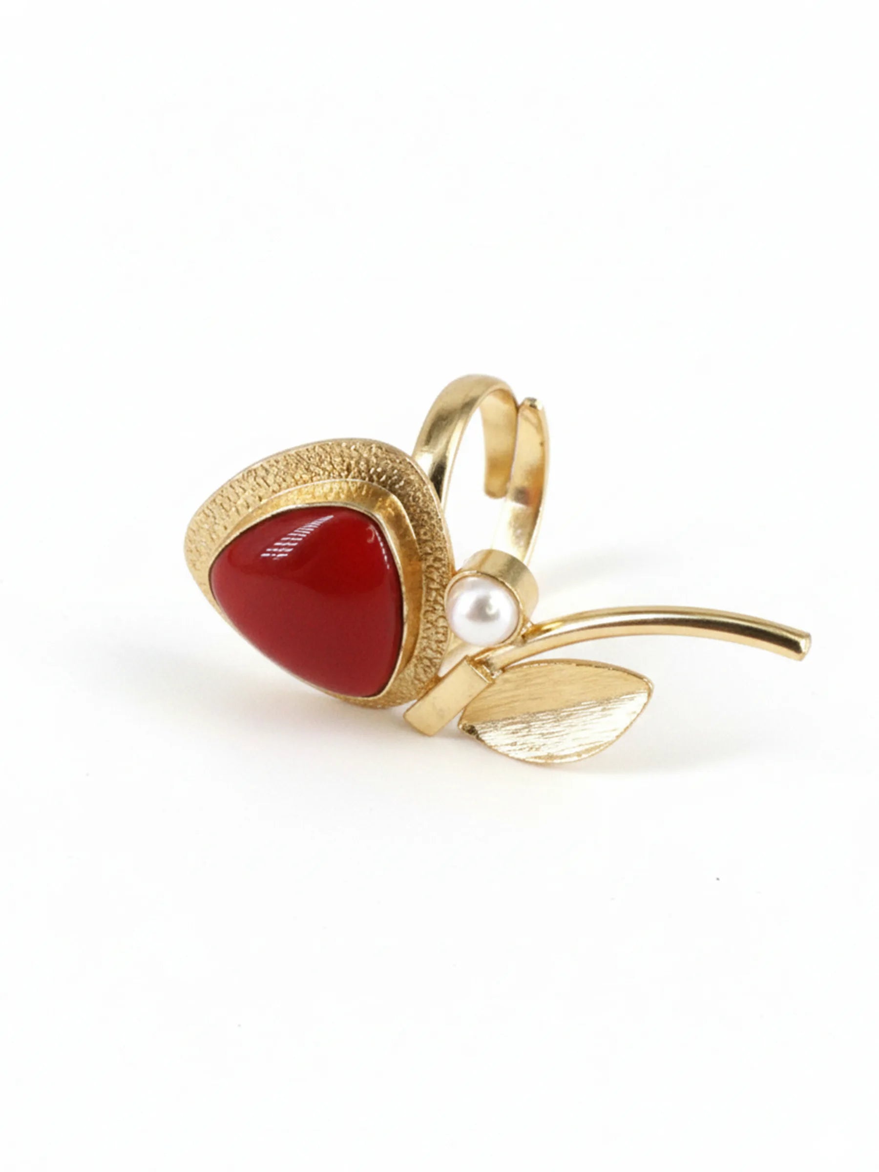 Handcrafted in recycled brass and finished with luminous 18K gold plating, the Mono Mars Ring brings together an abstract composition of a sculptural metal leaf, a sleek metal bar, a fiery red triangular stone, and a single tiny pearl. The asymmetrical arrangement evokes the raw, radiant energy of a celestial flare — bold, textural, and artfully modern. A striking contemporary heirloom that balances cosmic drama with refined craftsmanship.