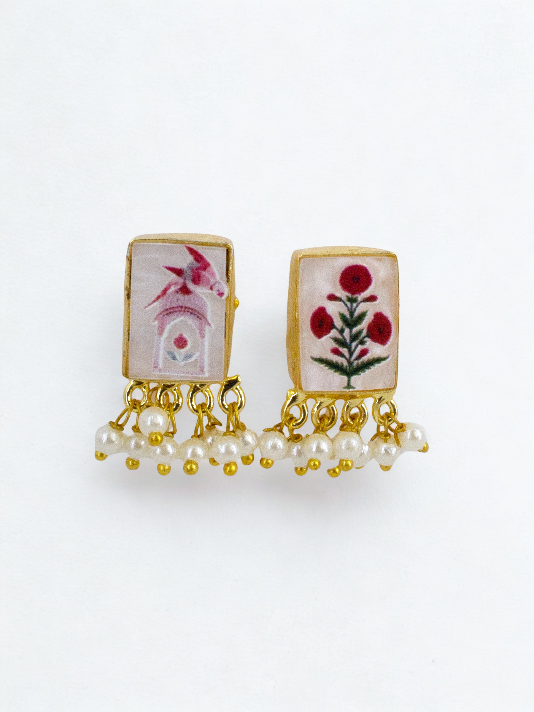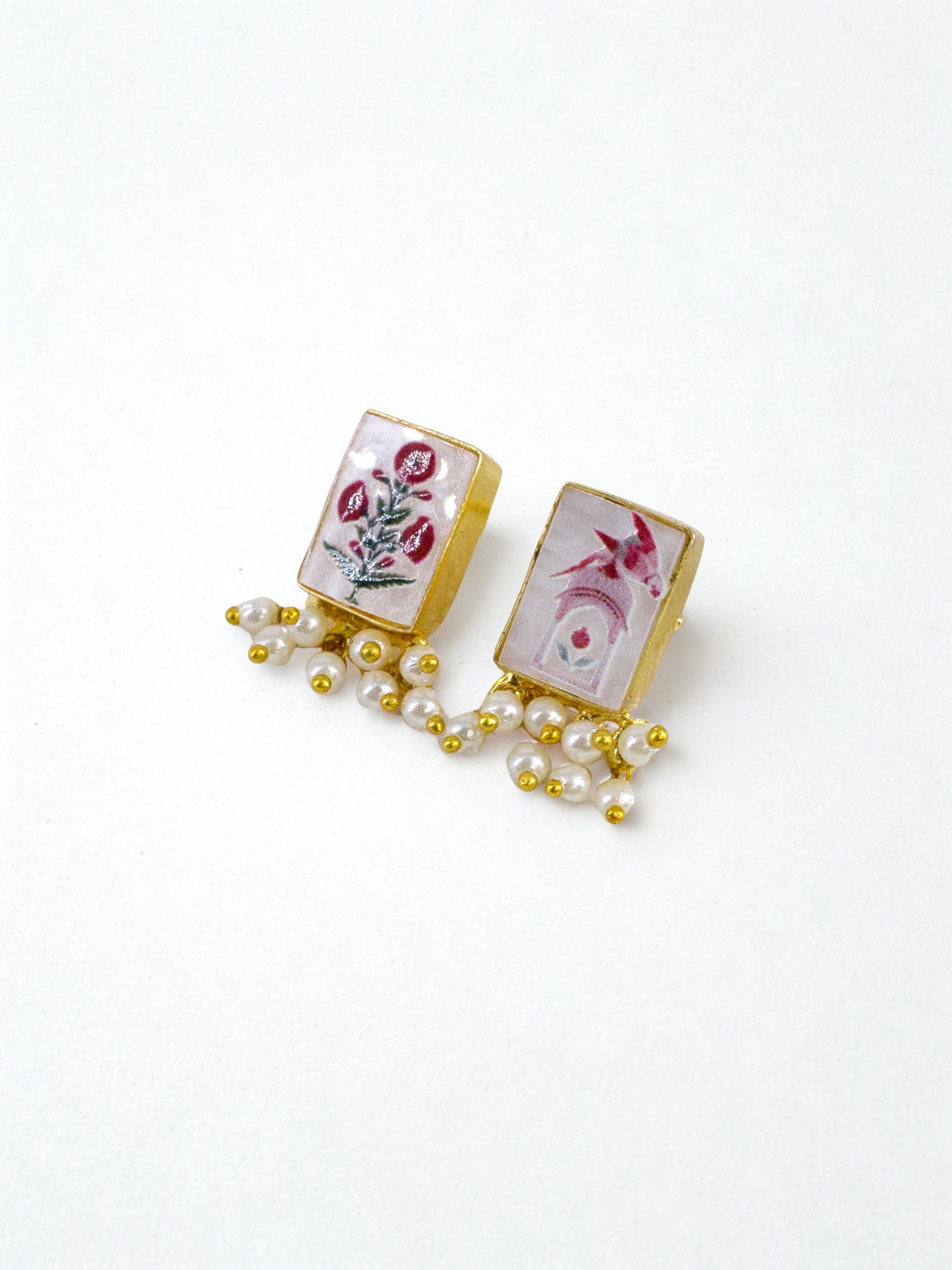 Delicate and artfully detailed, the Miniature Pearl Buttis feature small rectangular pearl tiles hand-painted with intricate floral motifs inspired by traditional miniature art. Handcrafted in recycled metal and finished with radiant 18K gold plating, their petite silhouette carries the quiet poetry of heritage brushwork in a modern, wearable form. Elegant, understated, and richly nostalgic — a gentle nod to India’s painterly traditions.
