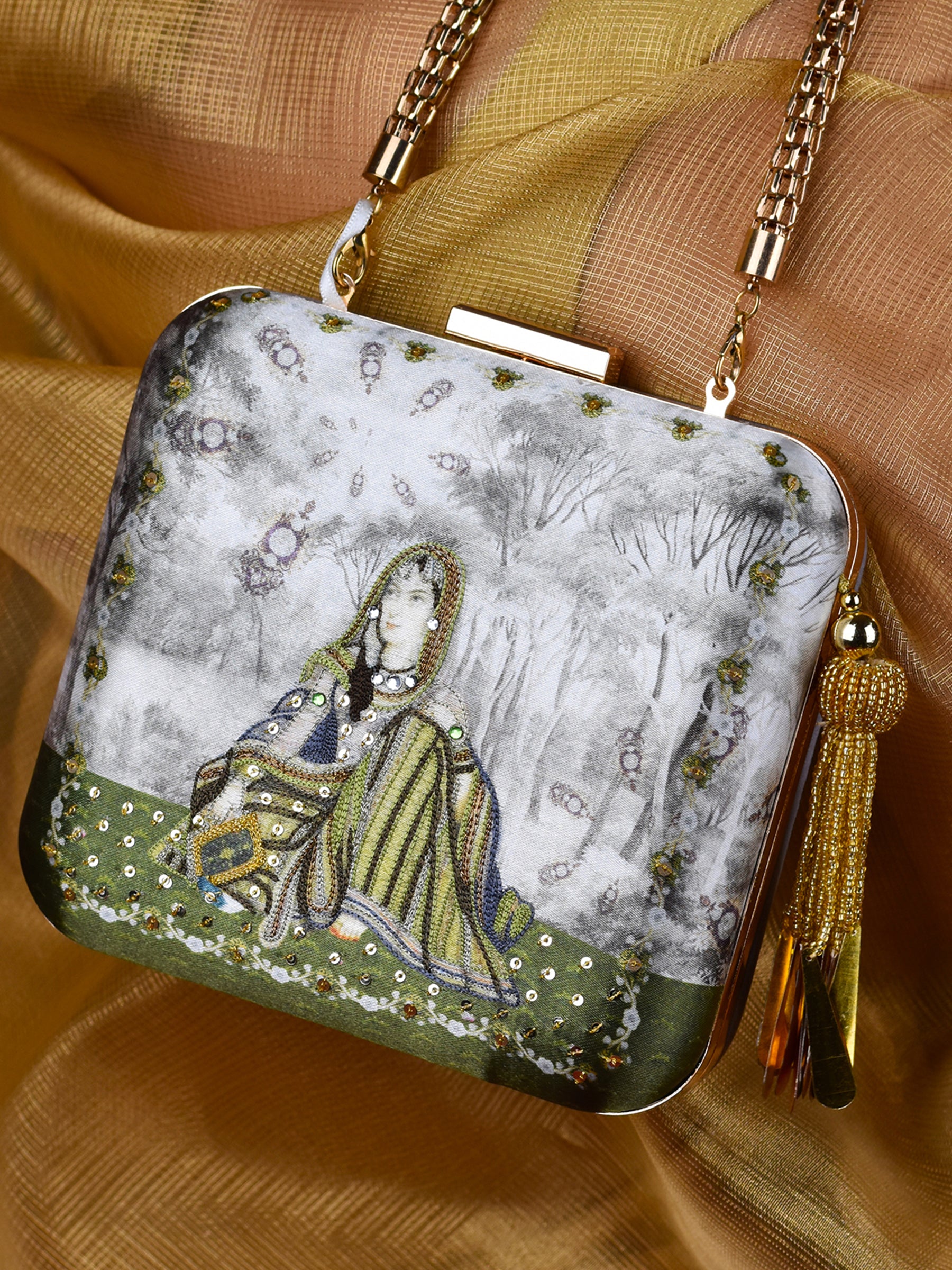 Prepare to be captivated by the "Mumtaz Baano" Luxury Clutch, a masterpiece that embodies opulence, sensuality, and intricate artistry. The clutch tells the story of a royal queen seated leisurely in a palace garden, surrounded by embroidered flowers in the grass and trees, and adorned with an intricate embroidered duppata.