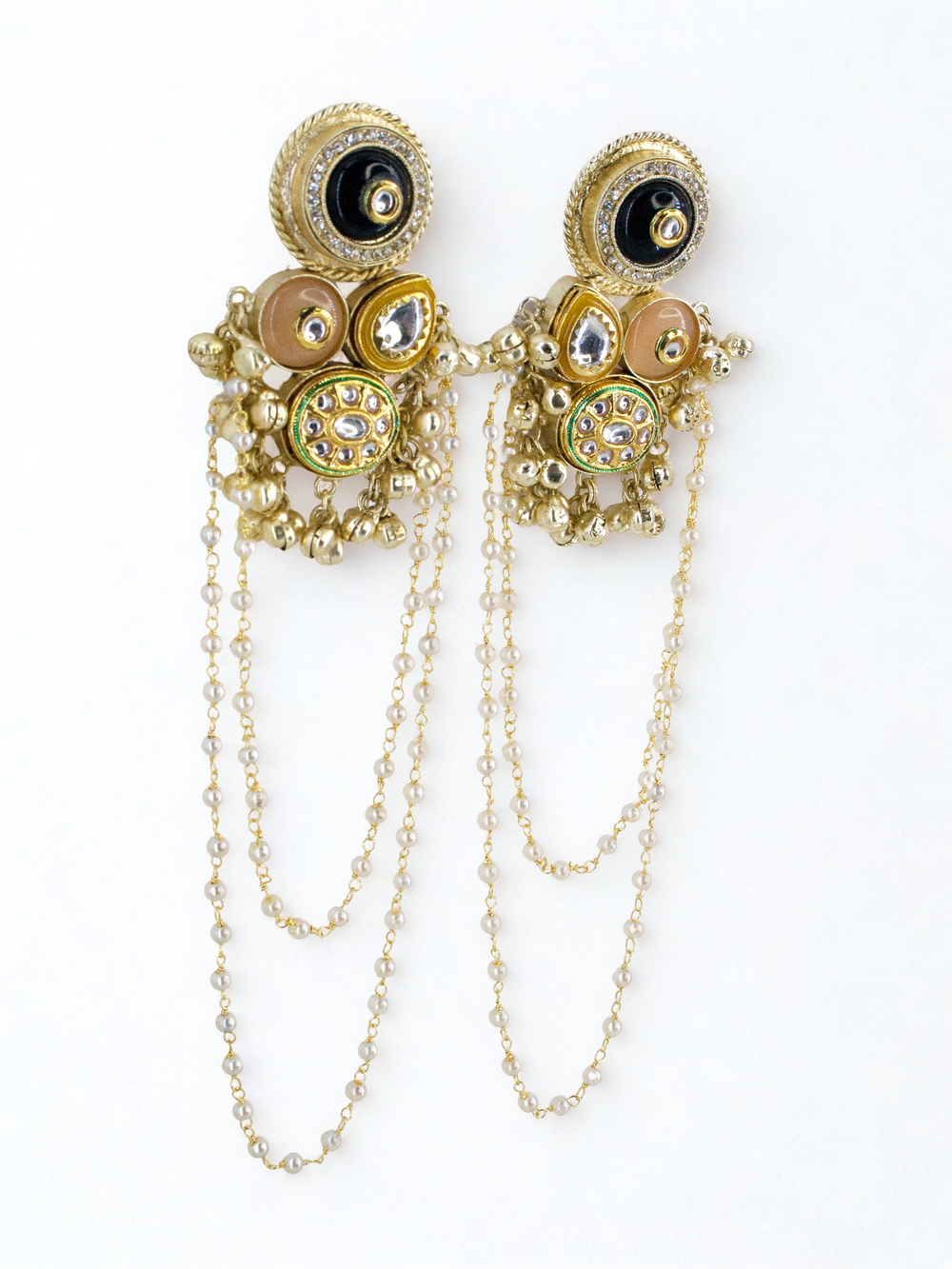 Delicate and refined, a luminous kundan–polki inspired stud with a single, slender pearl chain that falls gracefully with each movement. Handcrafted in recycled metal and finished with radiant 18K gold plating, it blends traditional opulence with a minimalist modern silhouette — soft, feminine, and effortlessly elegant. A whisper of luxury for those who love understated craft.