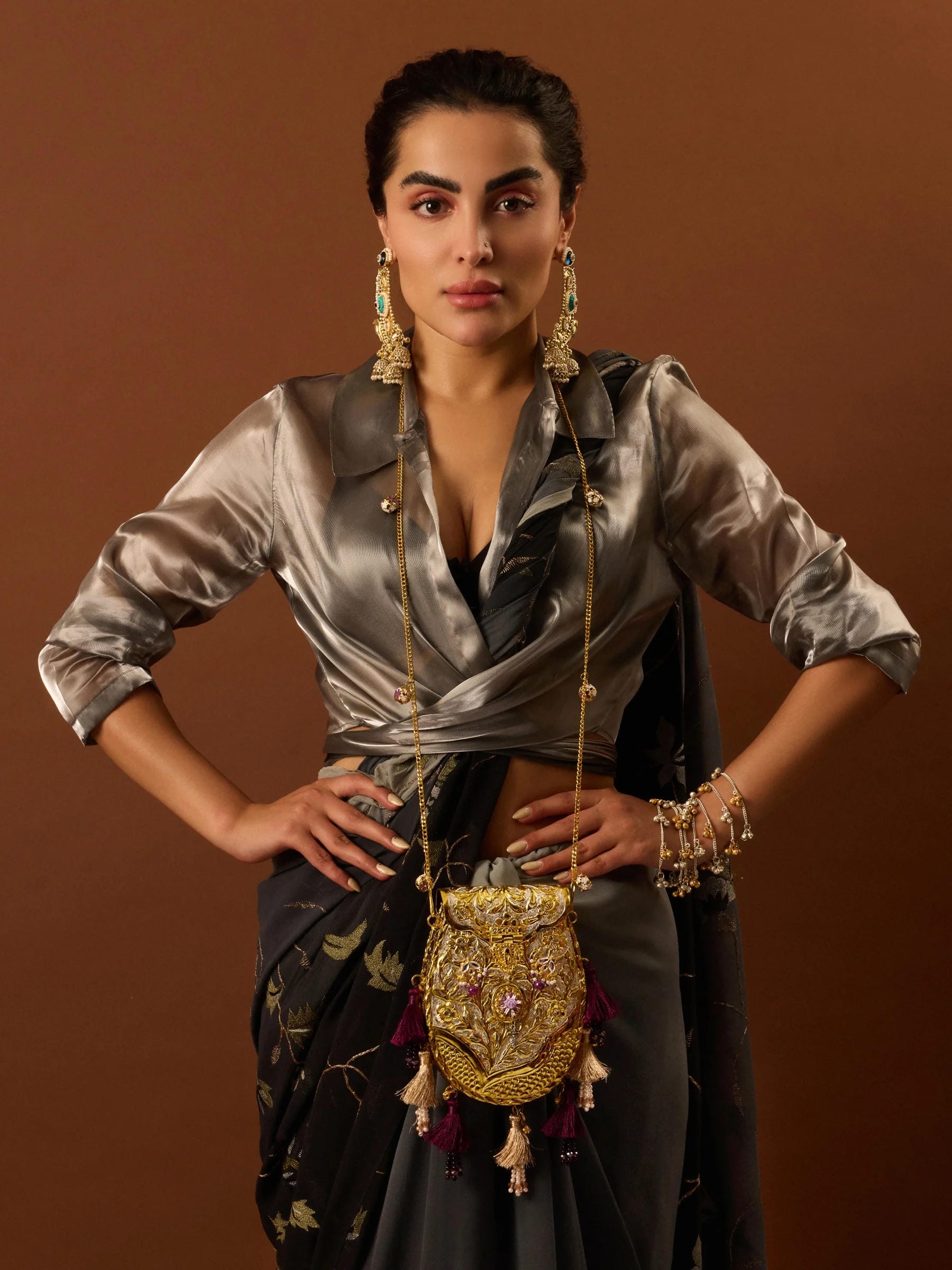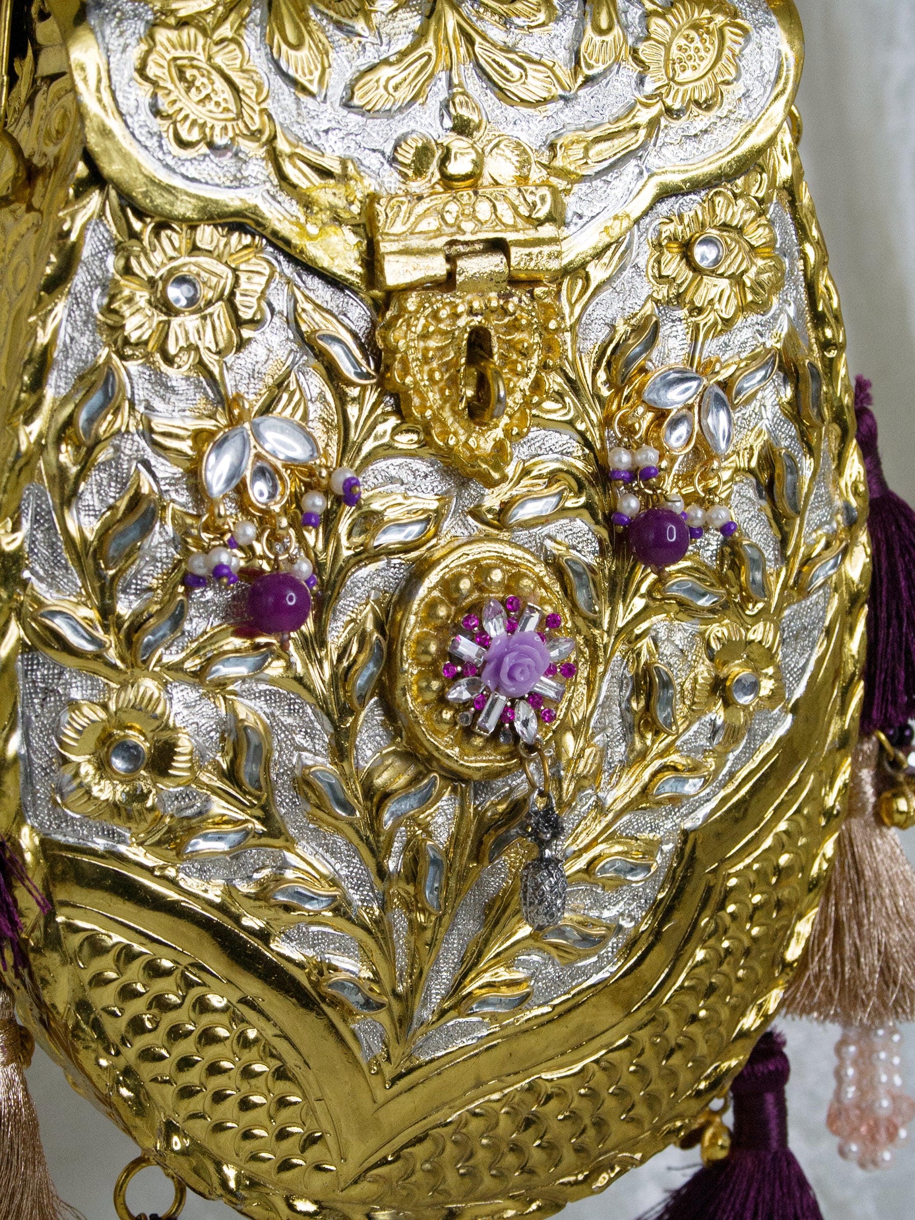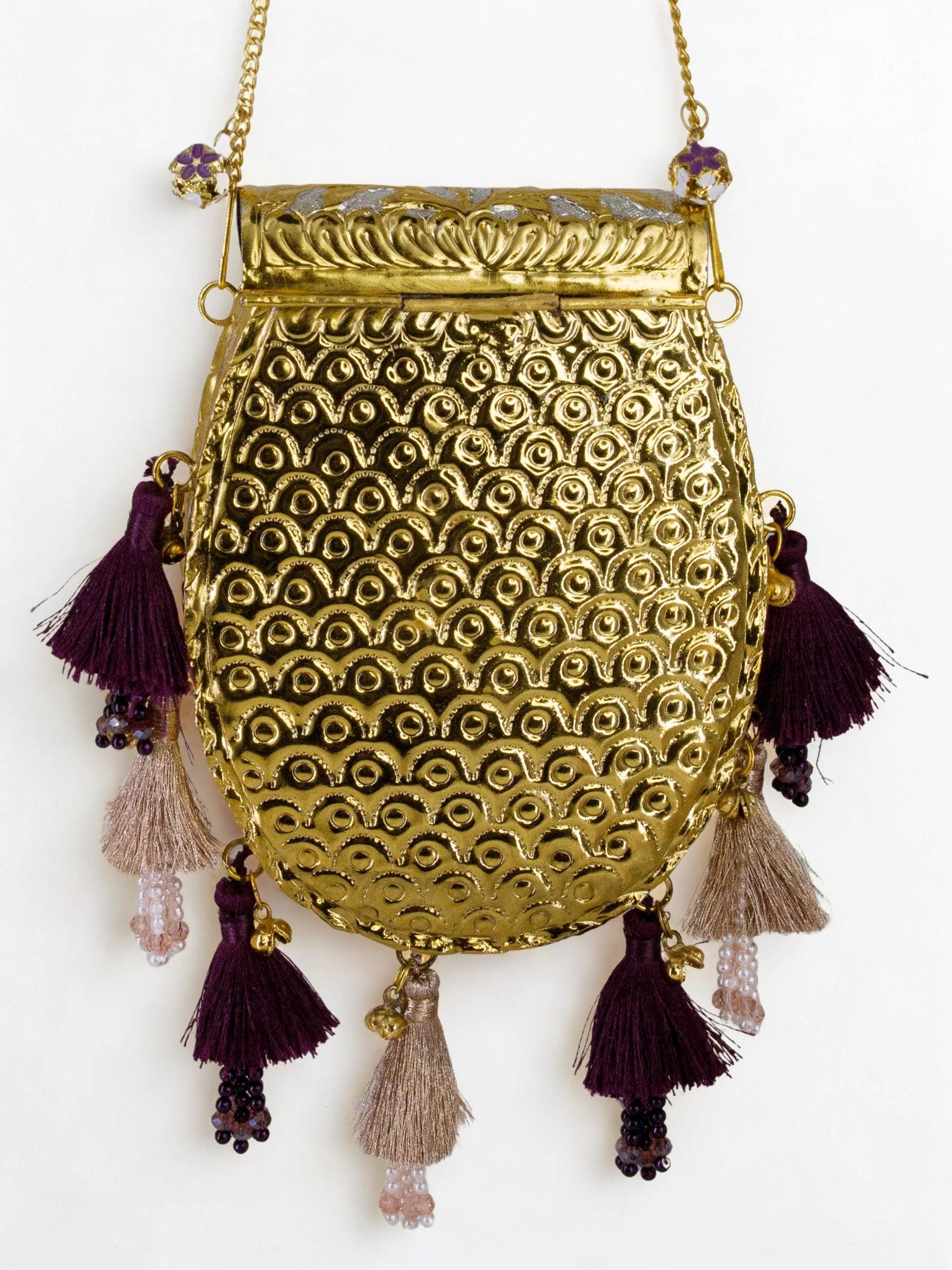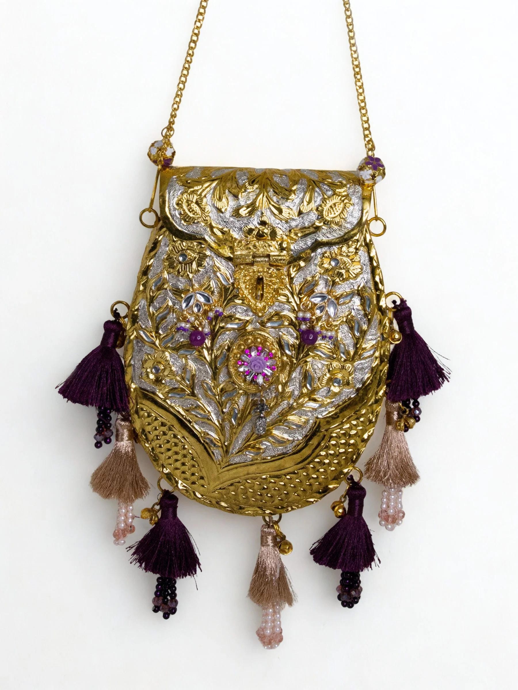 The Noor Bagh Oval Bag blooms like a midnight garden — mysterious, opulent, and endlessly captivating. Its sculpted metal body features intricate repoussé botanical motifs that glimmer in rose gold and silver tones, evoking the shimmer of moonlight on royal brocade. Dark purple silk tassels and rose-gold zari threads cascade luxuriously, adding a rhythmic movement to its refined silhouette. Accented with purple and silver jewel highlights, the bag feels like a treasure plucked from a moonlit durbar — elegant, dramatic, and undeniably timeless.